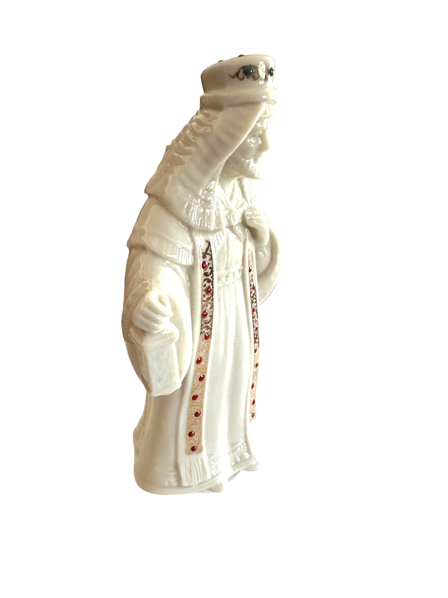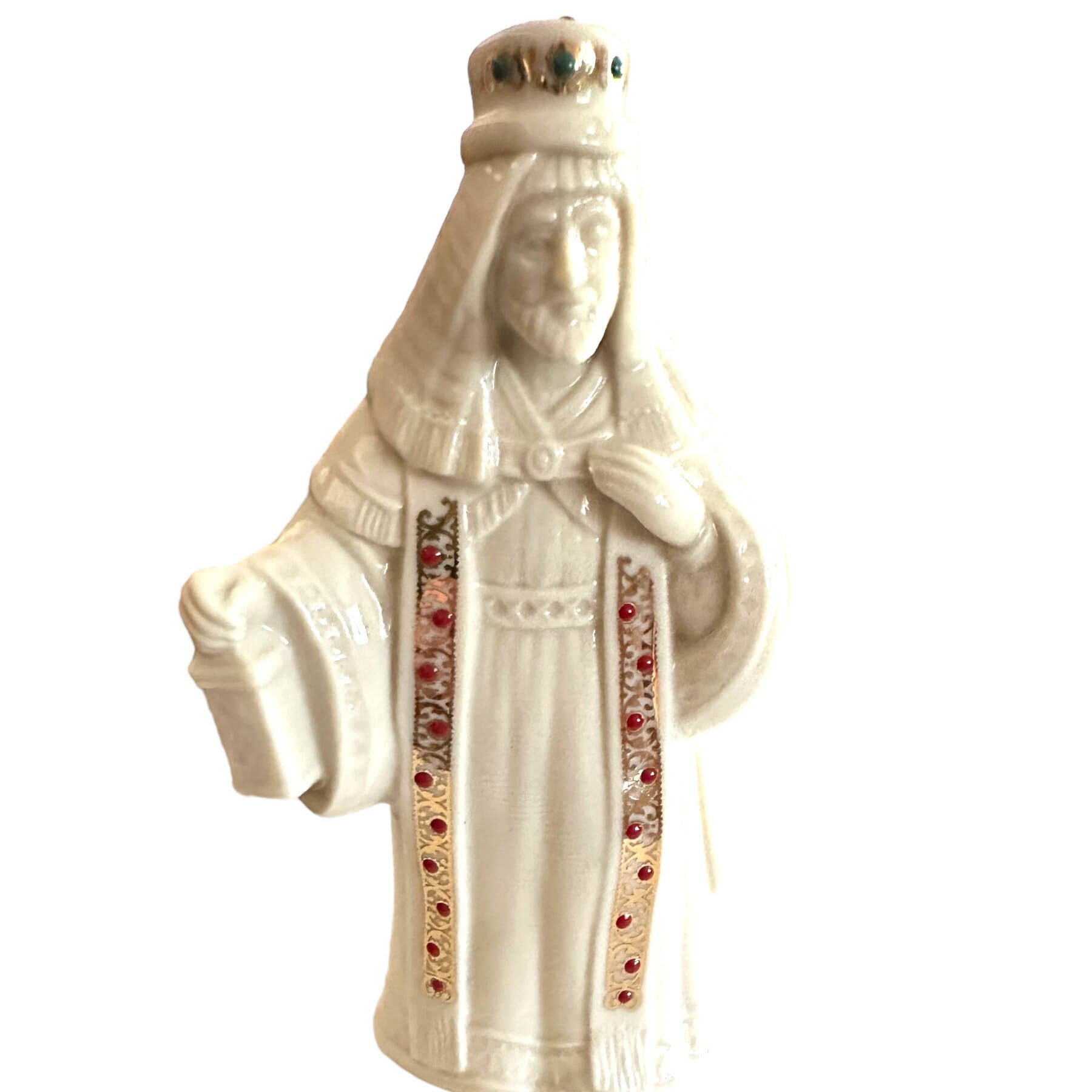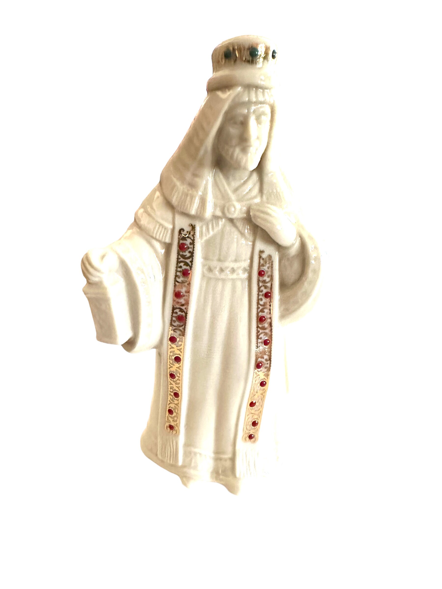 Nativity collection is King Melchior. The off-white ivory vintage figurine comes in the original box. The figure measures 6.5" in height. Adorned in jewels with gold accents.