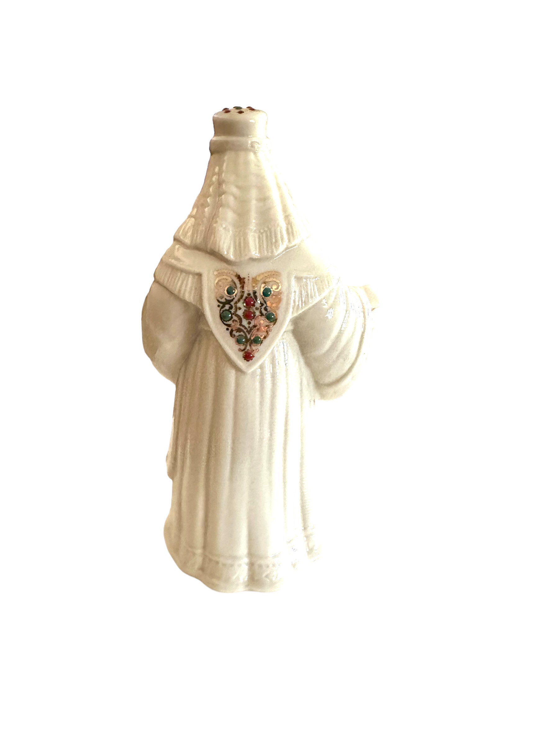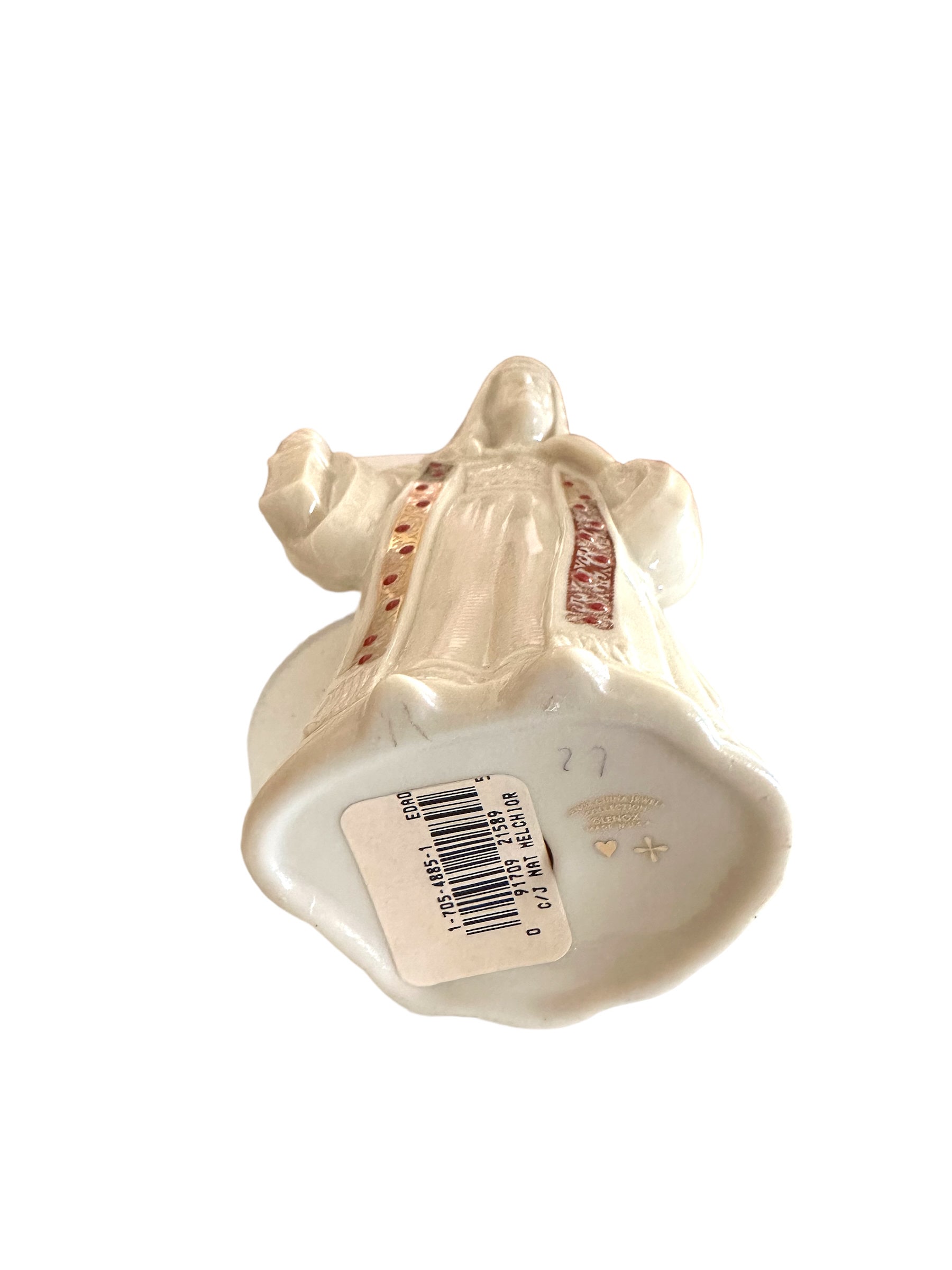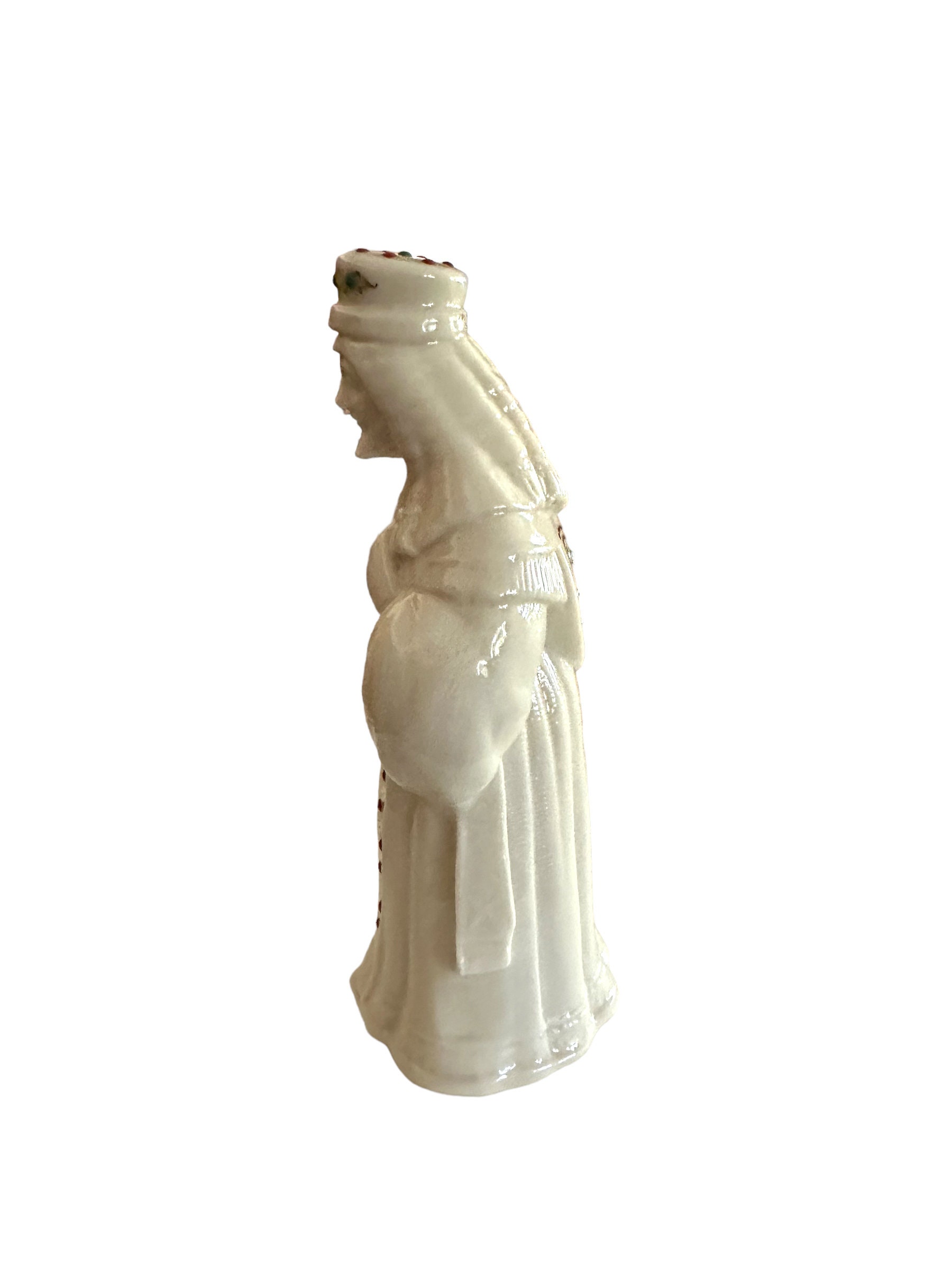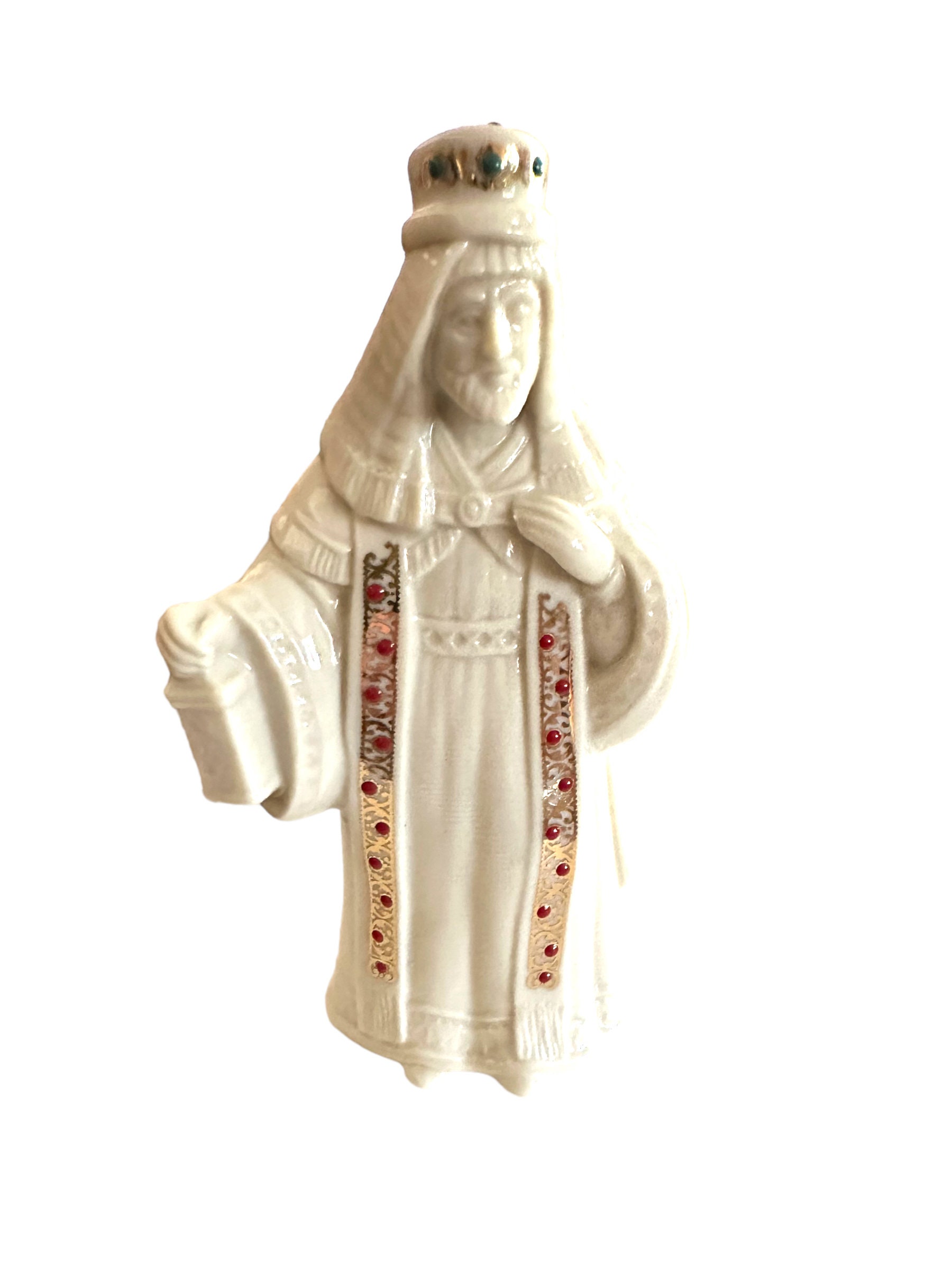 Nativity collection is King Melchior. The off-white ivory vintage figurine comes in the original box. The figure measures 6.5" in height. Adorned in jewels with gold accents.