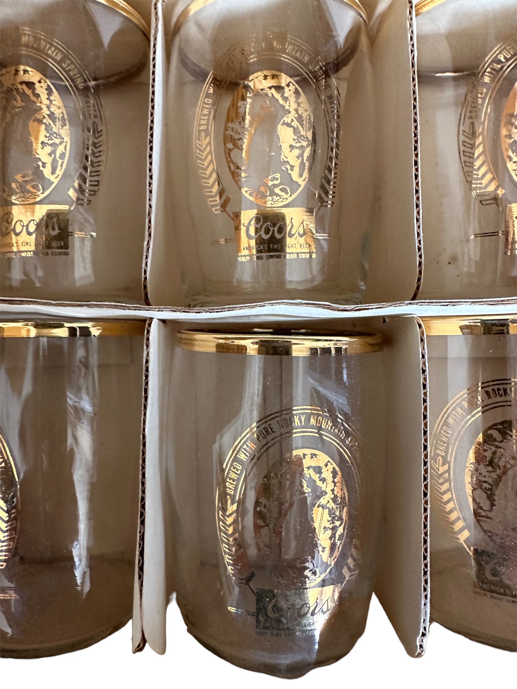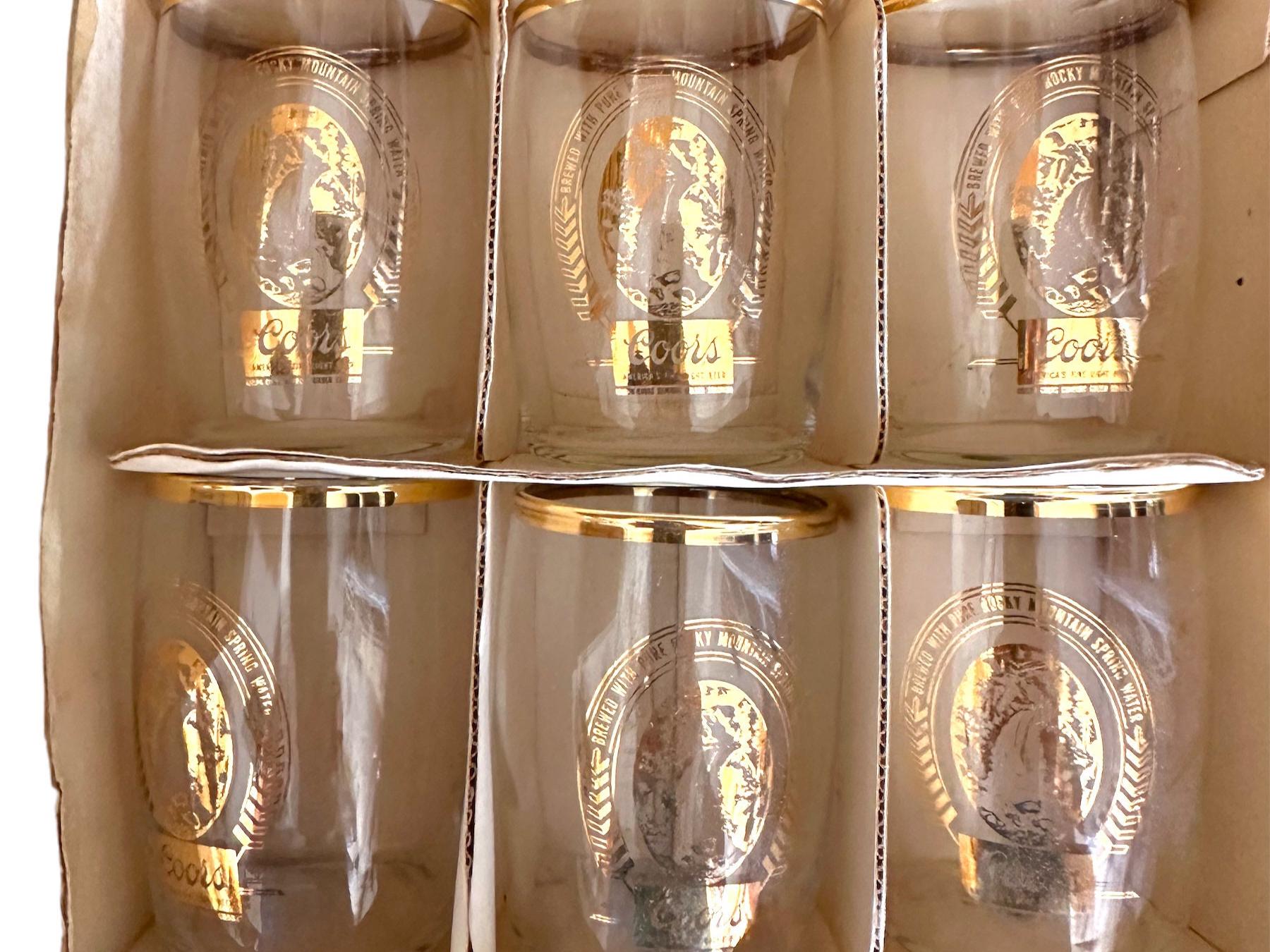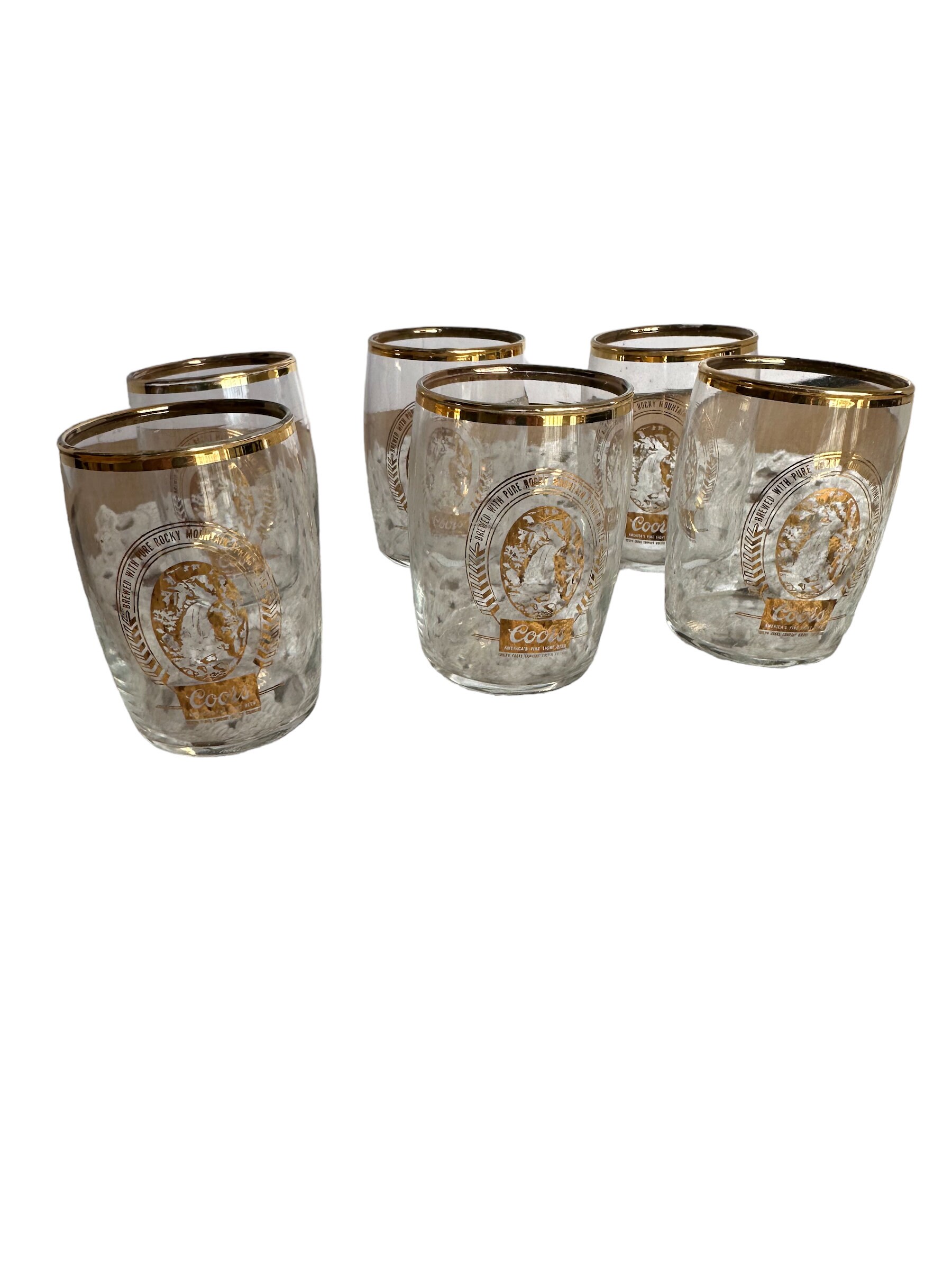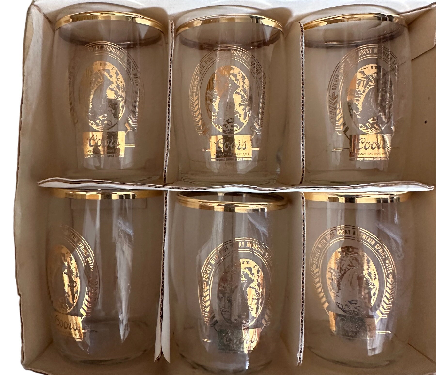 This is a set of 6 (six) Coors Beer sampler or taster glasses. They are rimmed and printed in gold. Very good condition in original box. They measures 3" x 2". They hold 4 fluid ounces.