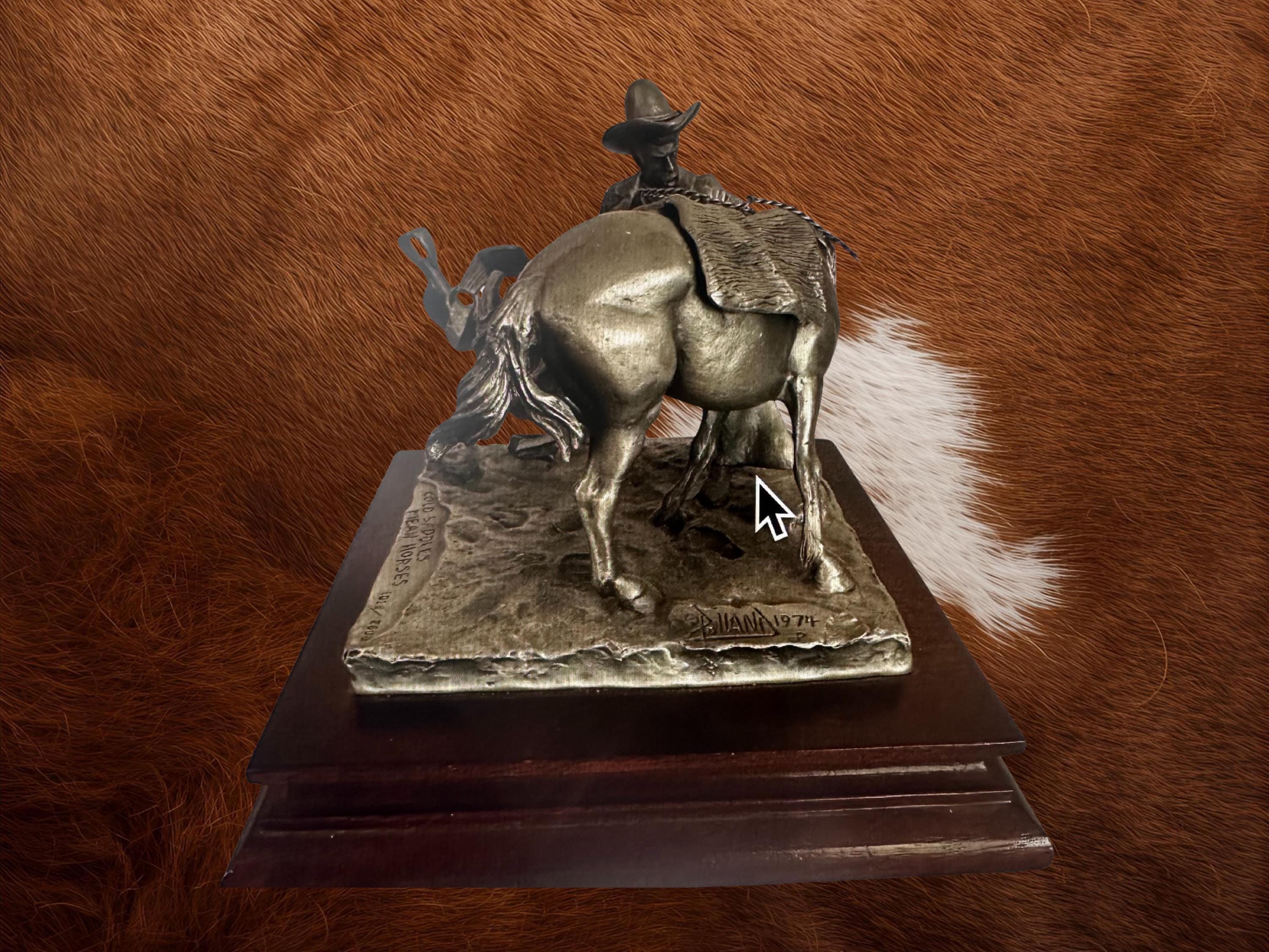 Discover this rare Chilmark Pewter Cowboy Horse Sculpture titled "Cold Saddles, Mean Horses," a stunning vintage piece crafted in 1974. This limited edition western figurine, numbered 1018 out of 2800, captures the rugged spirit of cowboy art with exquisite detail and craftsmanship.