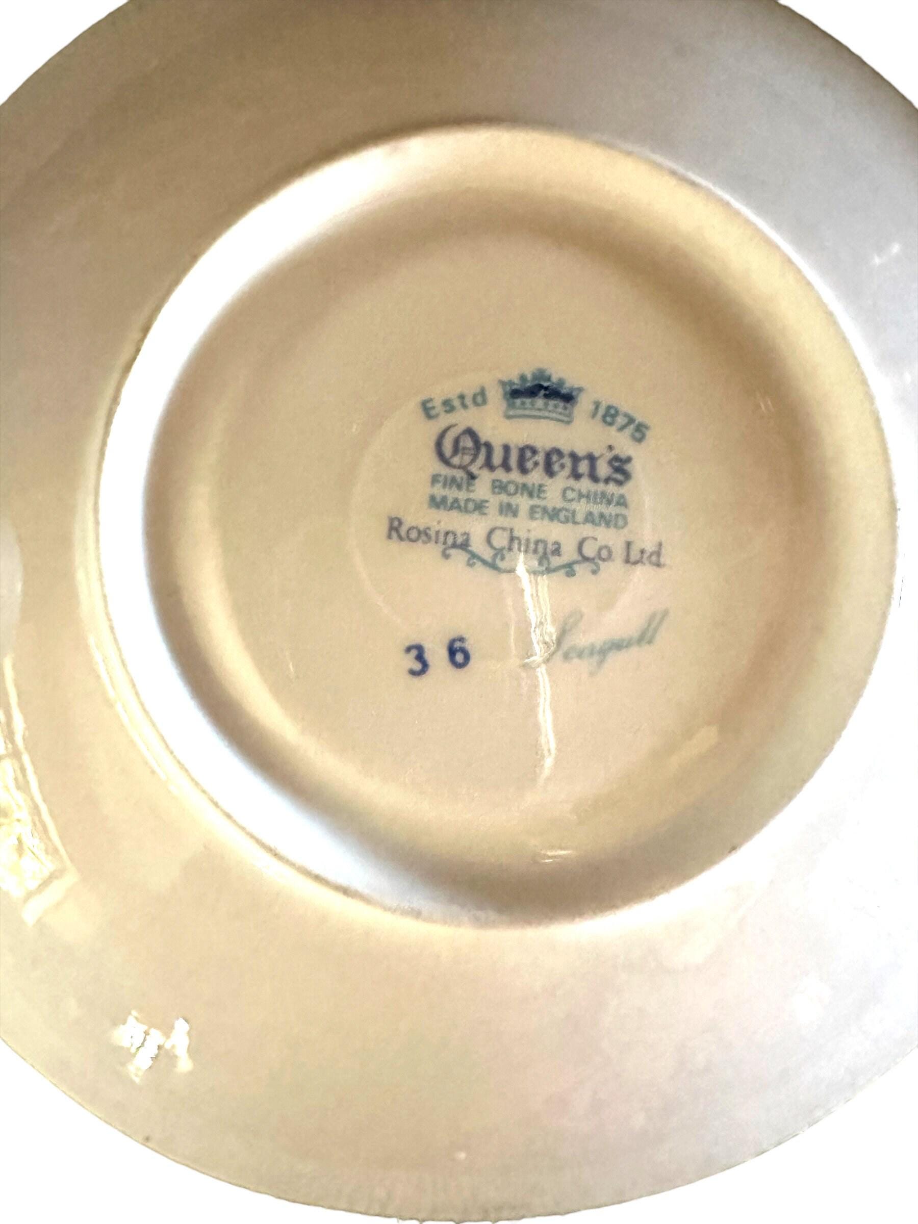 Queen's Rosina China company vintage tea cup & saucer in the Seagull tea cup. This is an English footed bone china tea cup and saucer set. It has a blue rim.