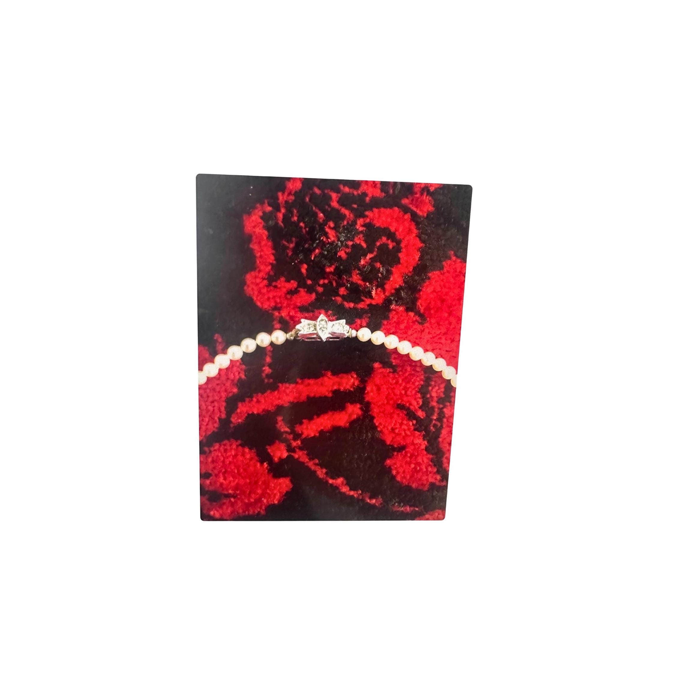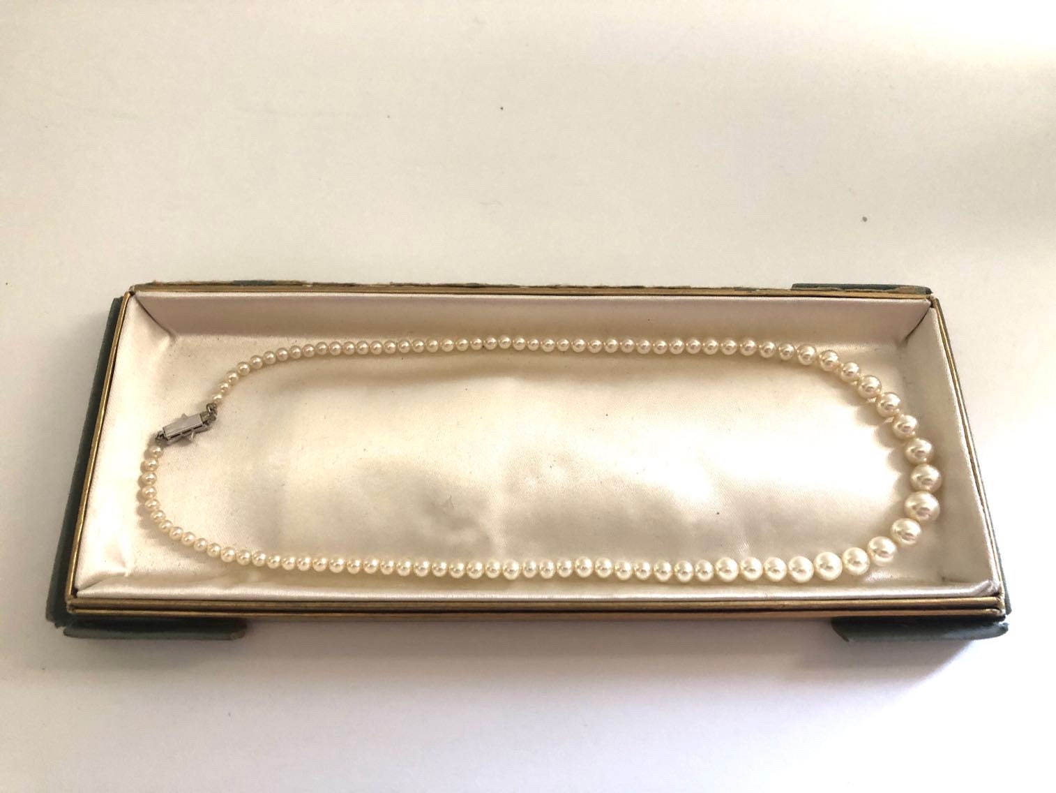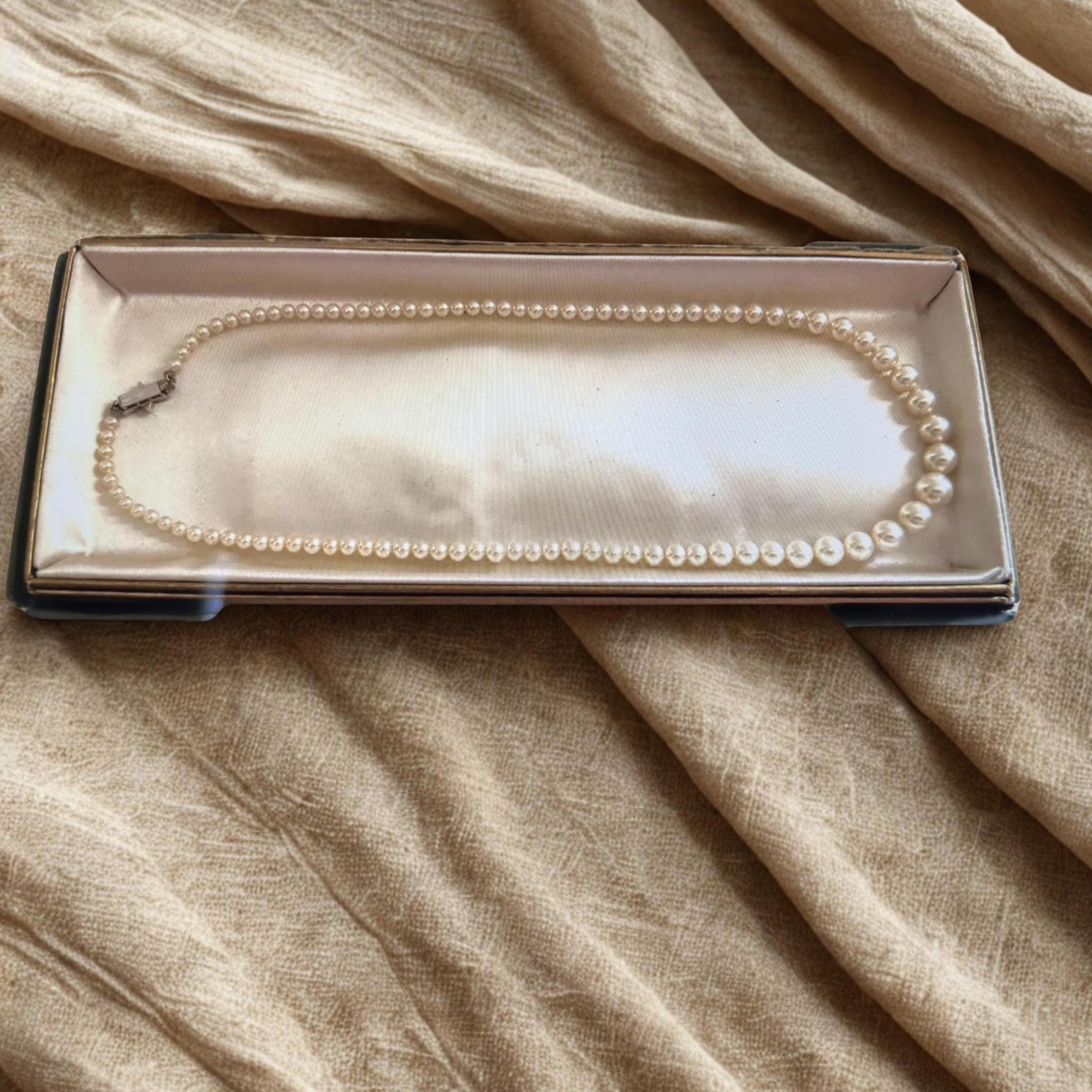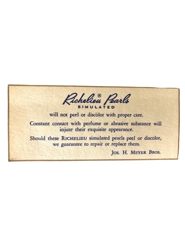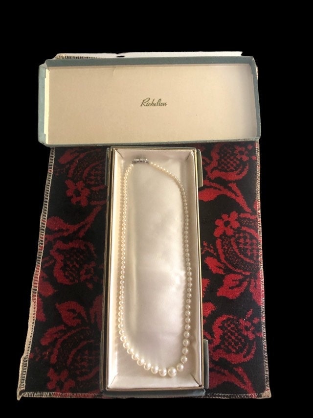 This is a dainty pearl necklace from the 1960's. It closes with a tab box clasp. It comes in the original box. This is a vintage Richelieu simulated pearl necklace. They were produced by the Richelieu Pearls Company.