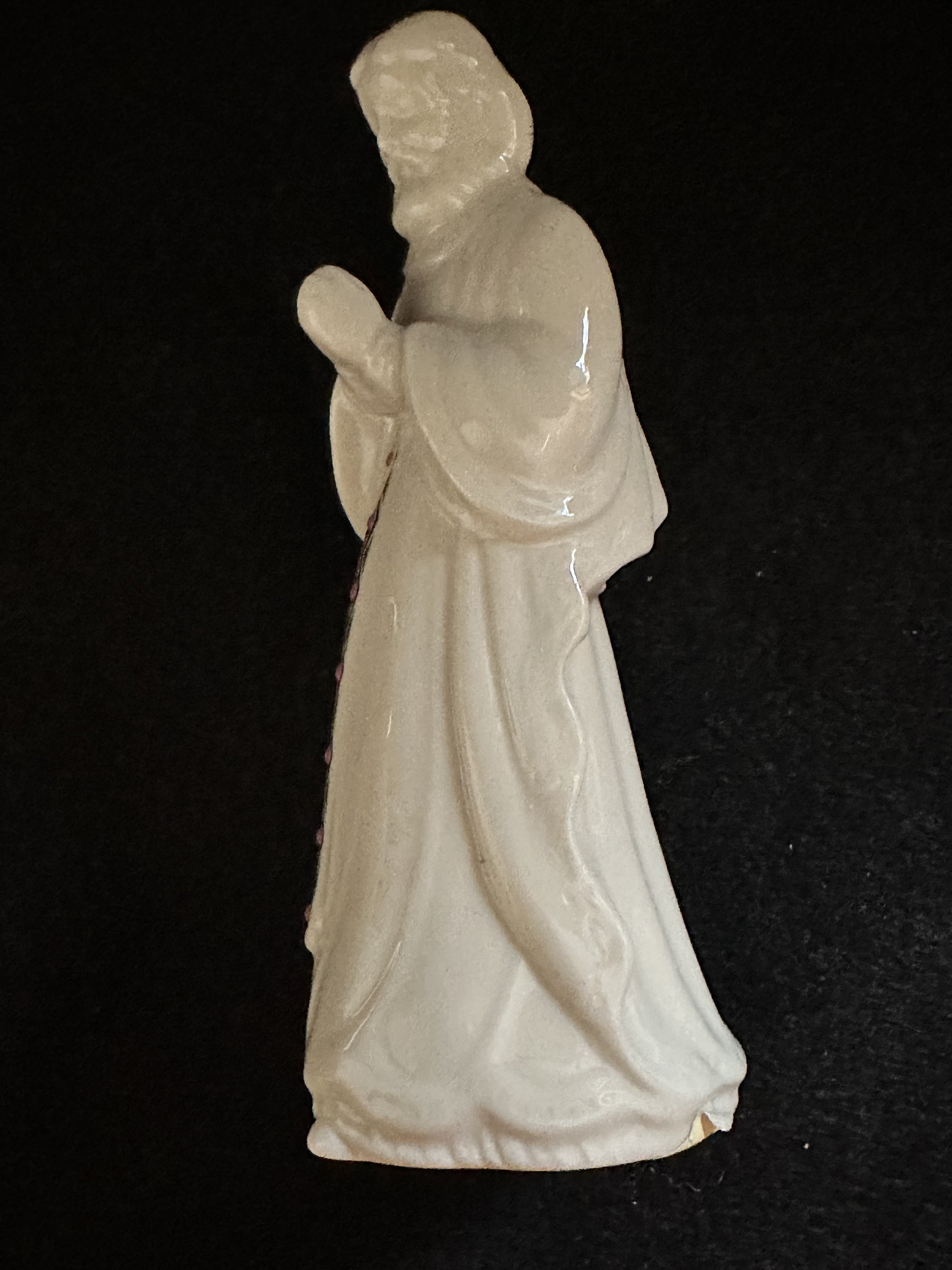This is a set of three Nativity figurines, which is now discontinued. This includes the Holy Family: Jesus, Mary, and Joseph. All of these off-white figures are in excellent condition. They were made in the 1990's. The hand-painted set would be a welcome addition to your holiday collection. They were made in the USA. They have the original stickers.