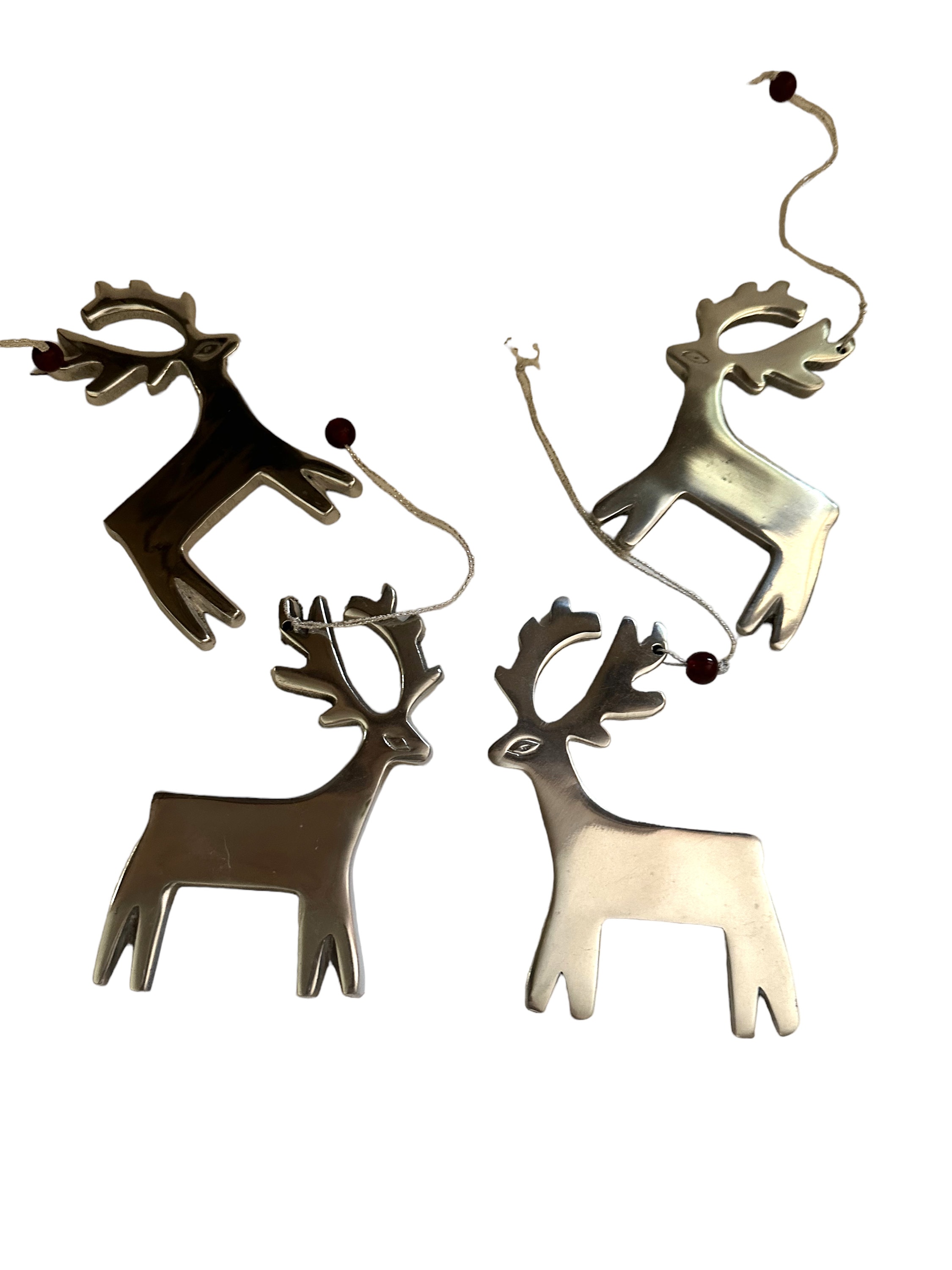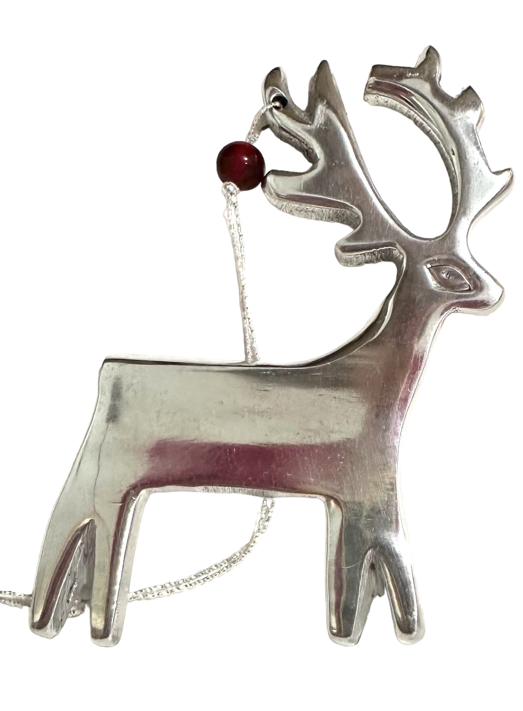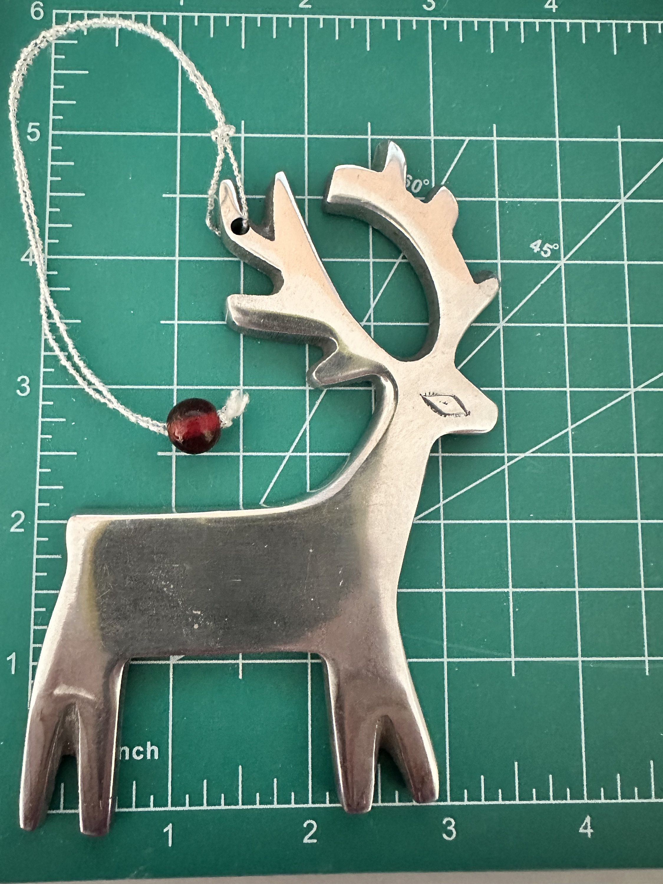This is a vintage pewter reindeer Christmas tree decoration ornament. The silver-colored ornament measures 4.75" high by 3.5" wide. It attaches with a beaded silver looped string. Easy to hang on the tree branches.