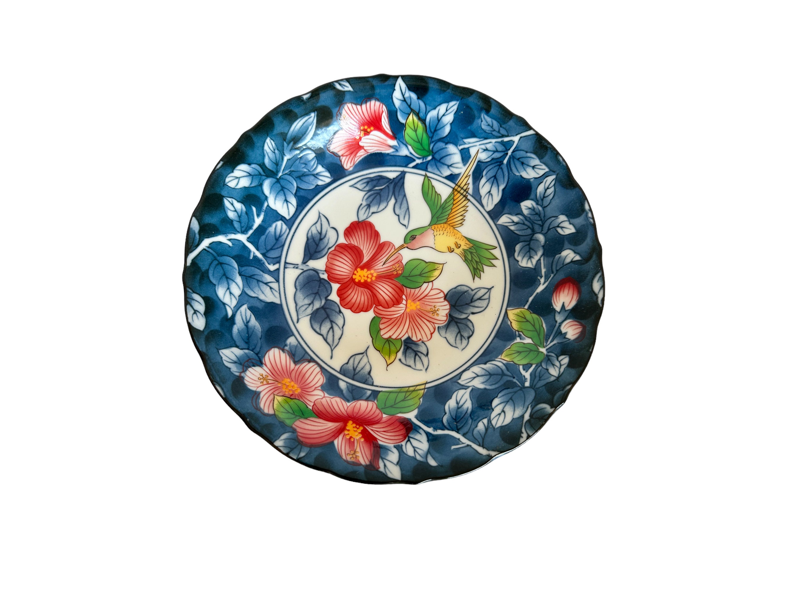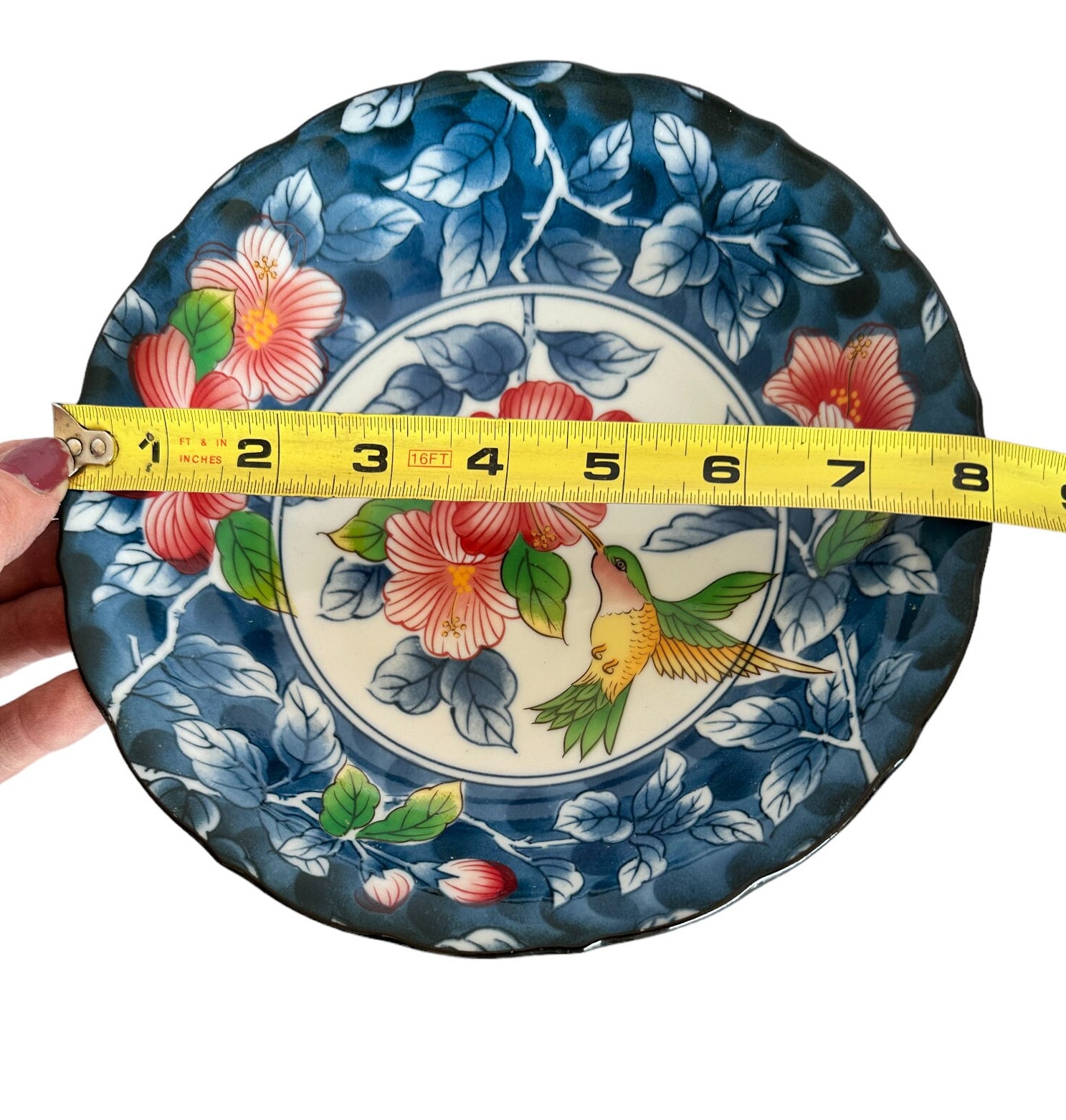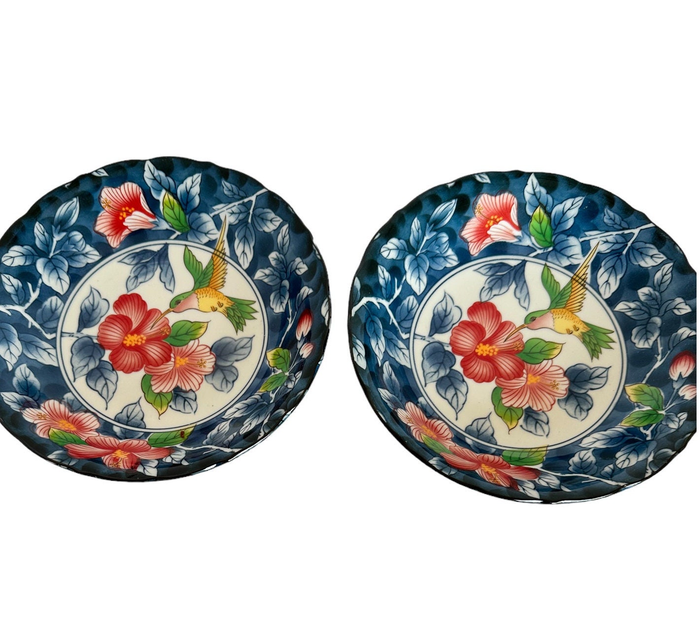 This is an oriental blue and red porcelain 8-inch-diameter soup or cereal bowl. The bowl is decorated with red and pink hibiscus flowers. The hummingbird bowl measures 2 inches deep. This is for a set of two dishes. It is in excellent condition. It has a blue leaf background. Add this beauty to your kitchen collection today.
