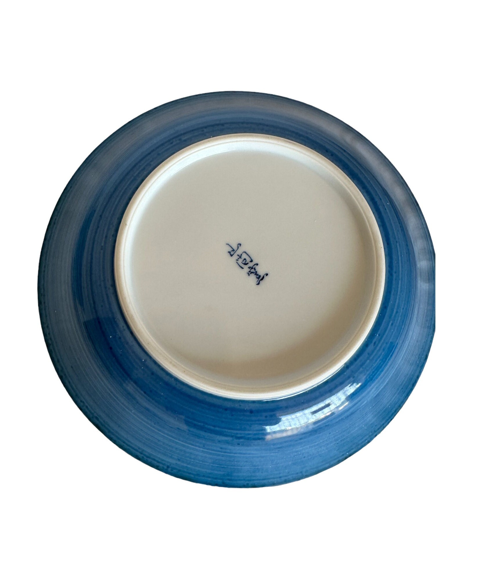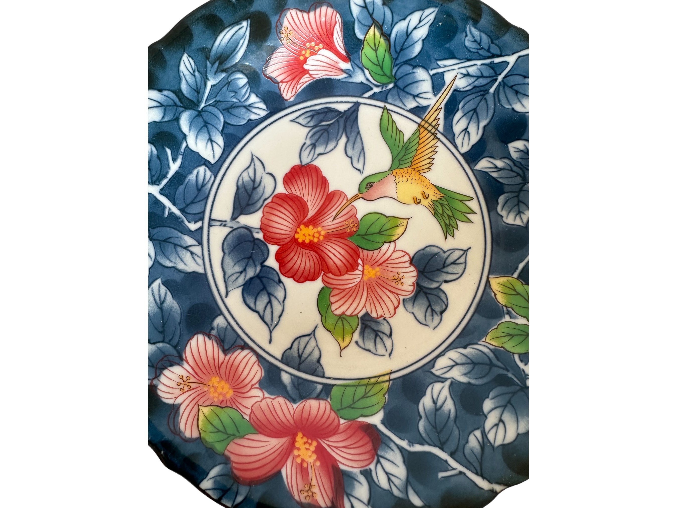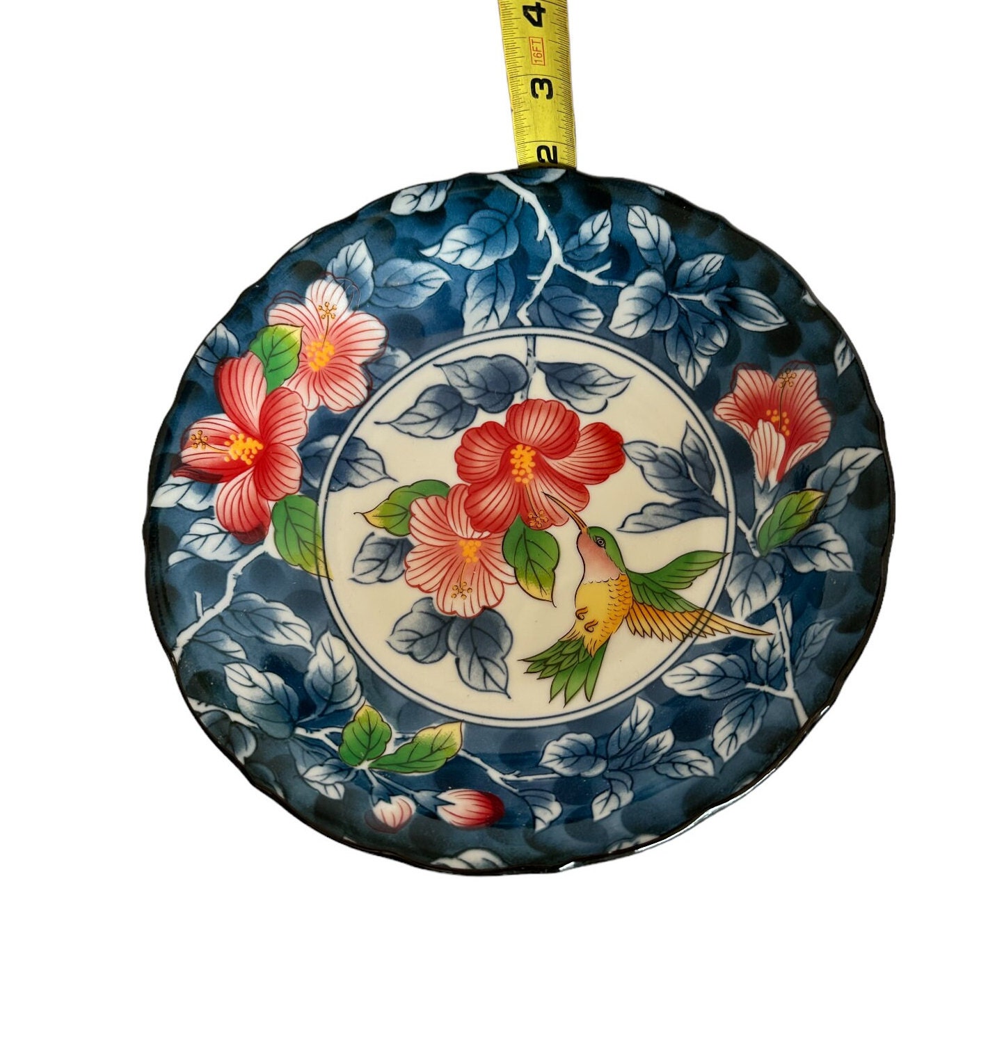 This is an oriental blue and red porcelain 8-inch-diameter soup or cereal bowl. The bowl is decorated with red and pink hibiscus flowers. The hummingbird bowl measures 2 inches deep. This is for a set of two dishes. It is in excellent condition. It has a blue leaf background. Add this beauty to your kitchen collection today.