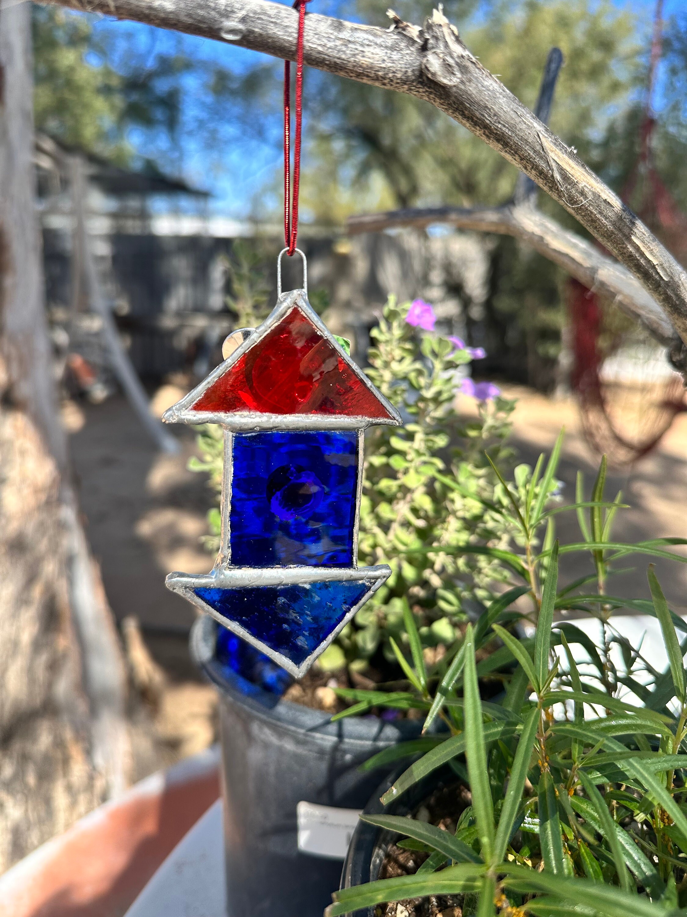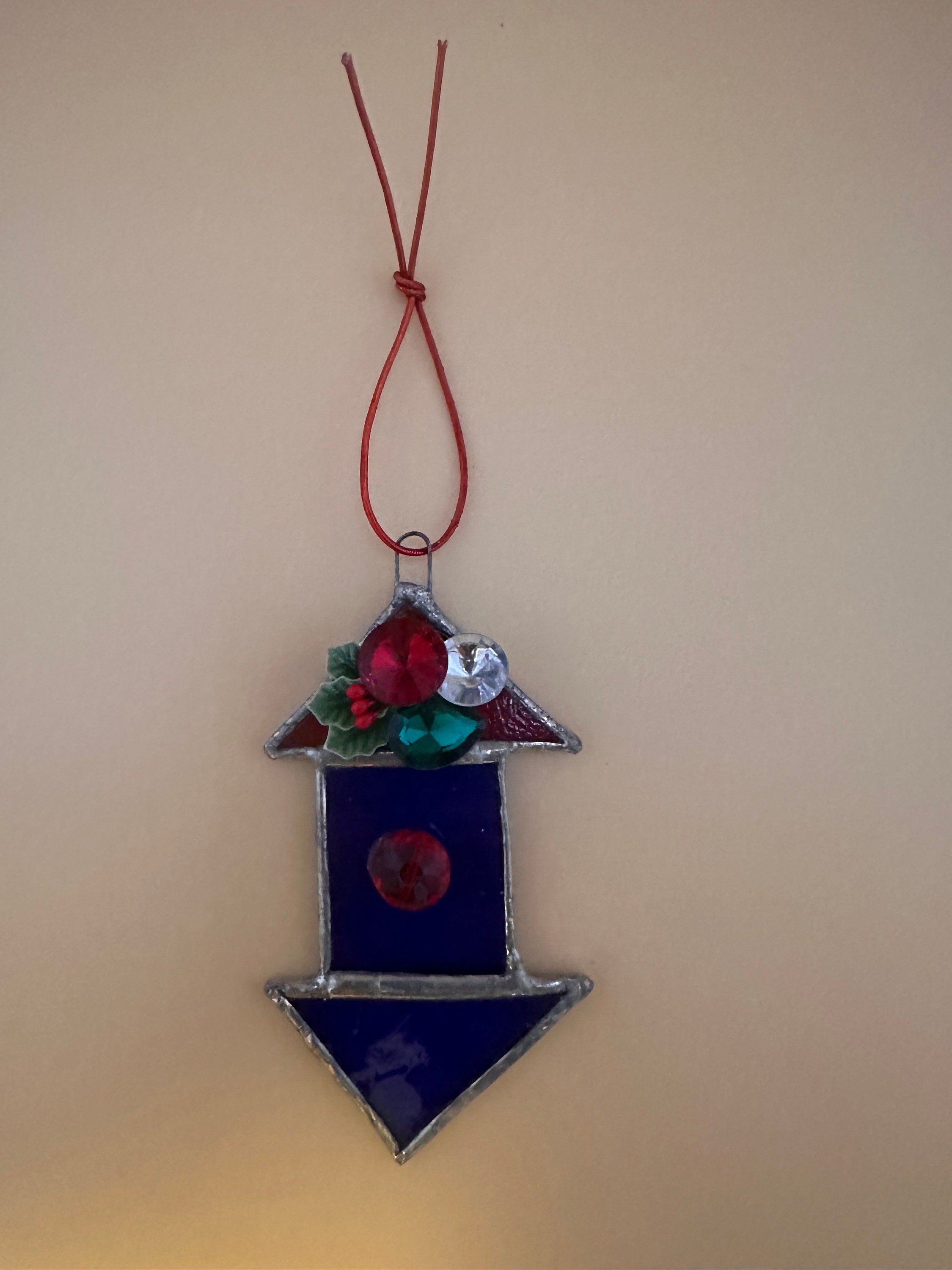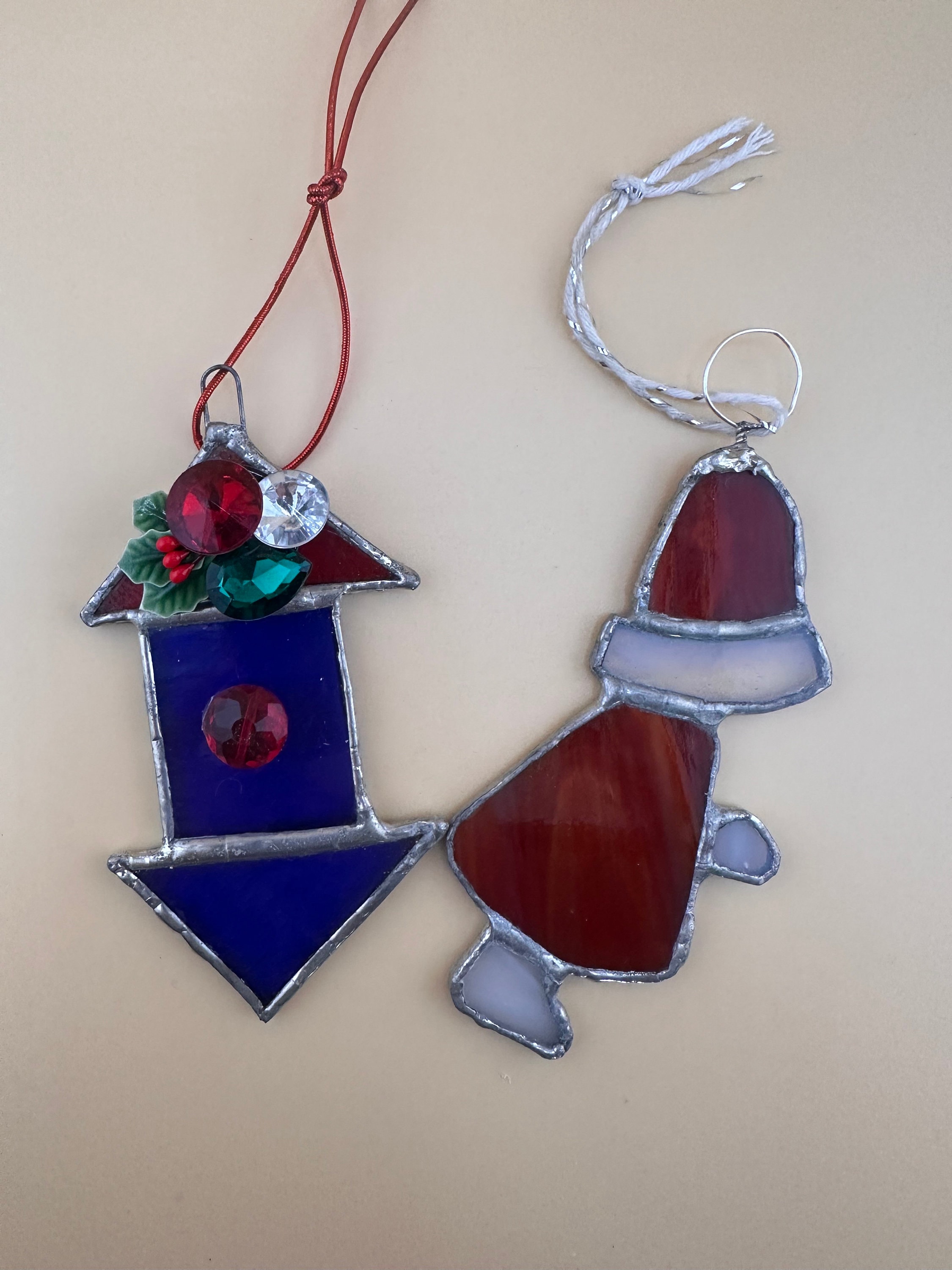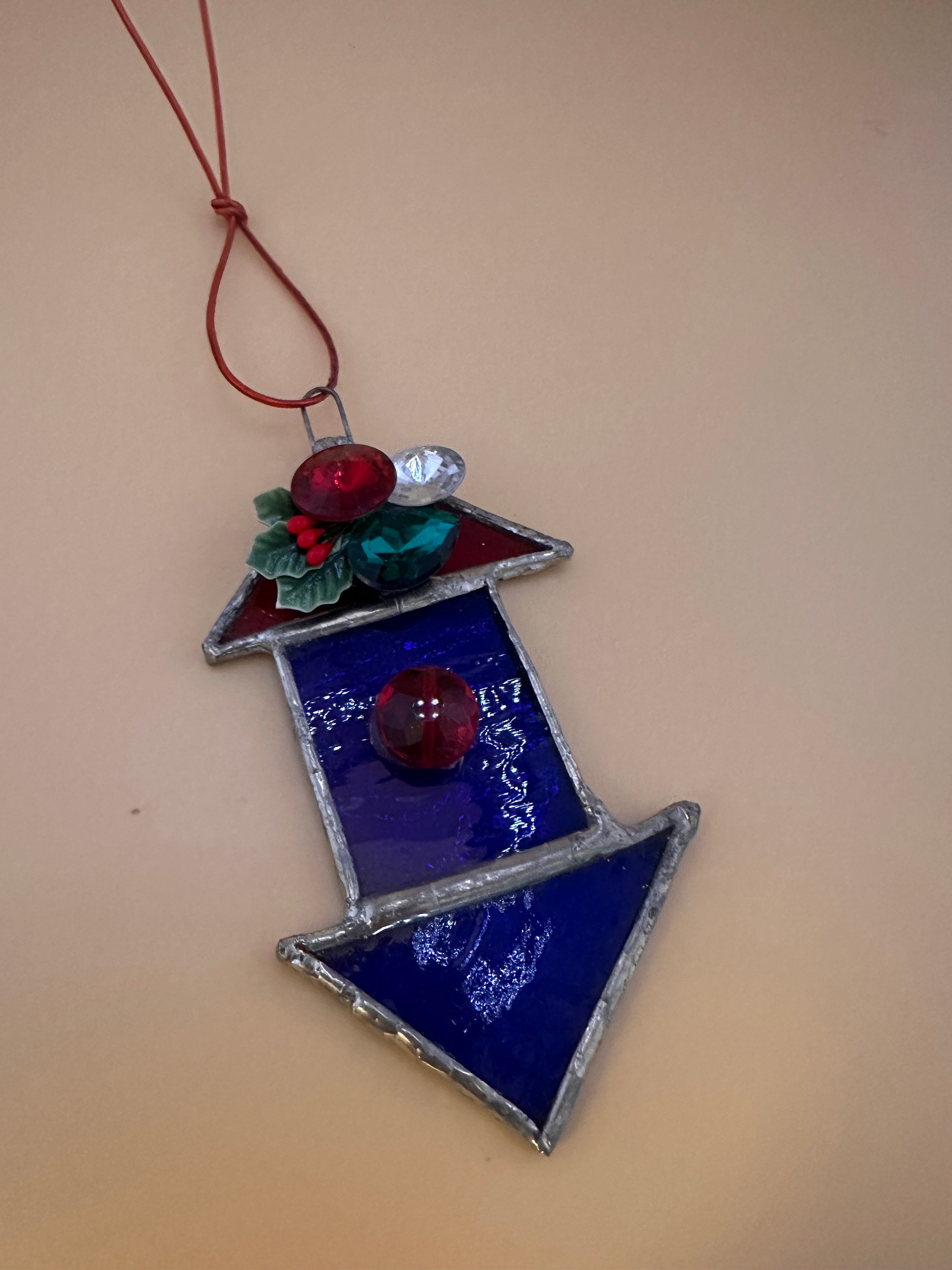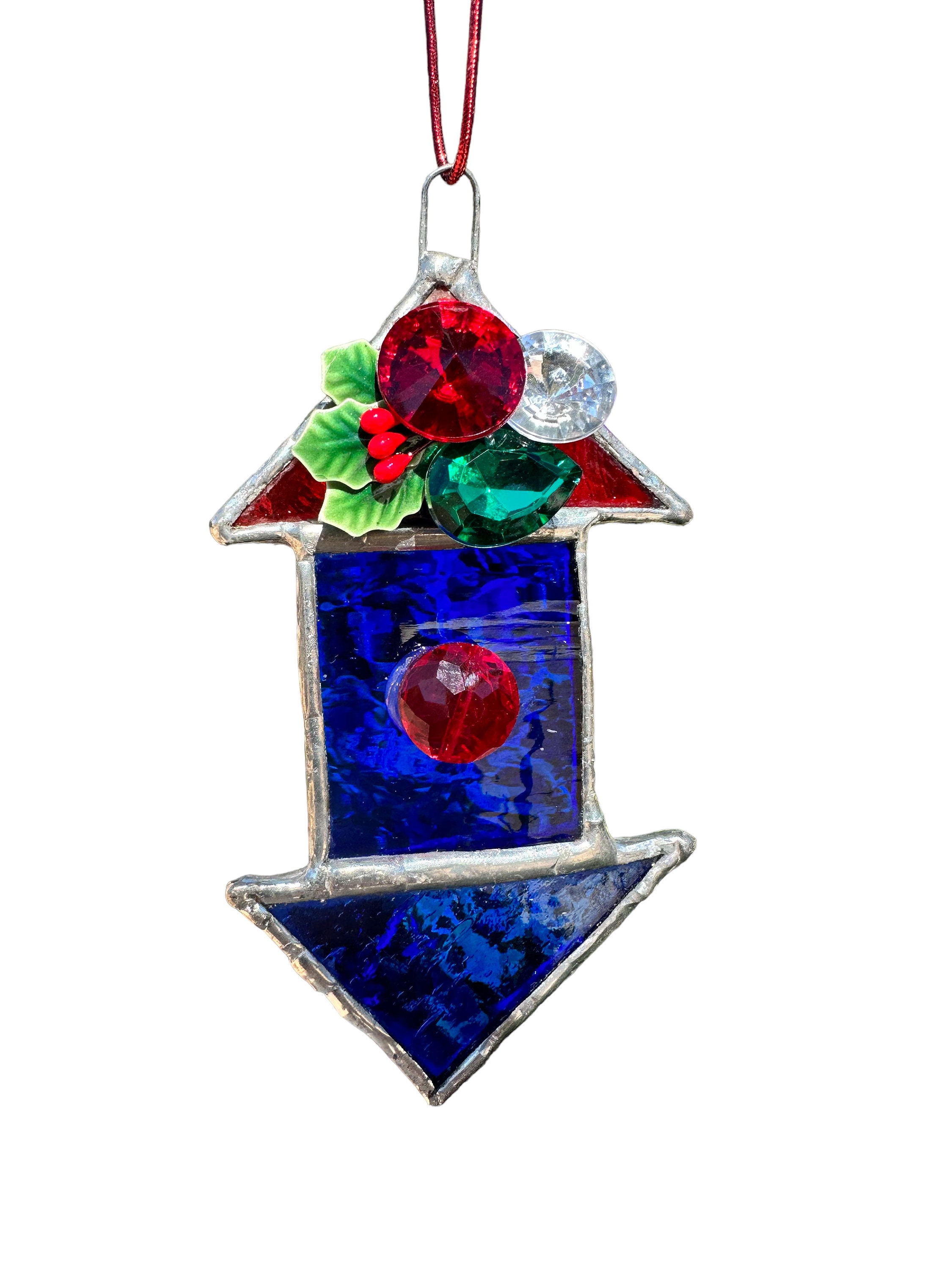 Add a touch of vintage charm to your holiday decor with this handcrafted stained glass Christmas ornament. Measuring 2 inches wide by 4 inches high, this unique keepsake features a vibrant blue and red color palette, capturing the festive spirit perfectly. Made in the USA during the 1980s using the traditional copper foil method, each ornament showcases the craftsmanship and timeless appeal of old-fashioned stained glass artistry.
