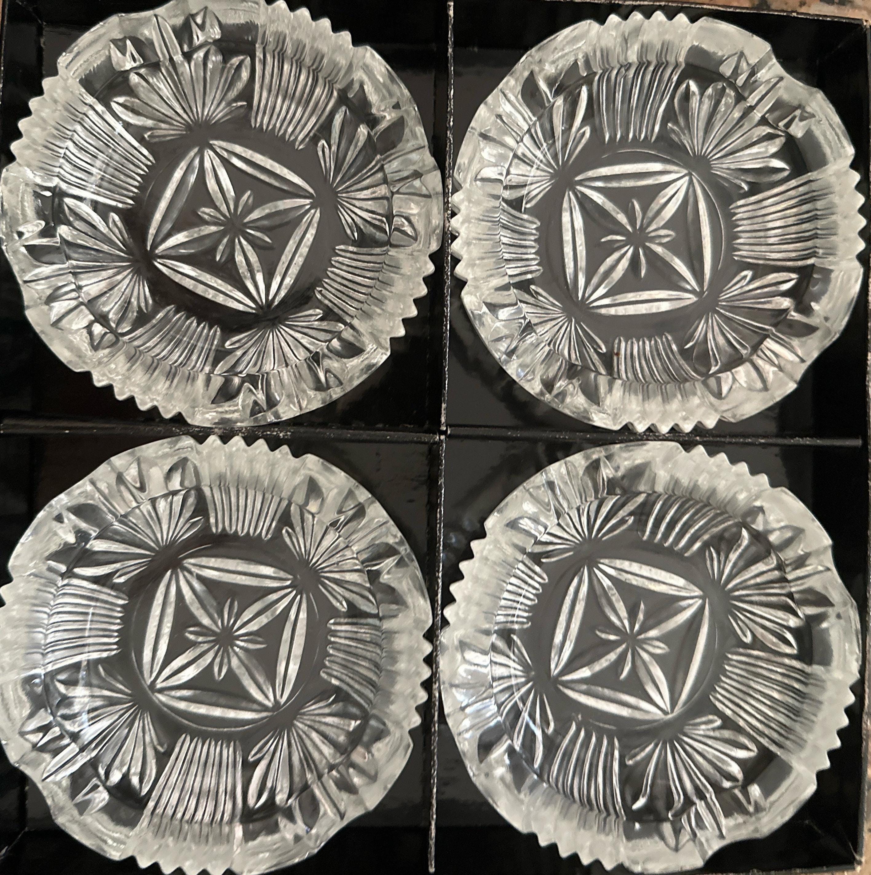 Elevate your collection or gift-giving with this stunning set of four Federal Glass Georgetown Crystal vintage ashtray set. The crafted ash tray set is etched glass, these vintage crystal ash trays are a perfect blend of mid-century modern design and timeless elegance. Each piece measures approximately 4 inches in diameter, making them ideal for use as stylish smoking accessories or versatile trinket dishes.