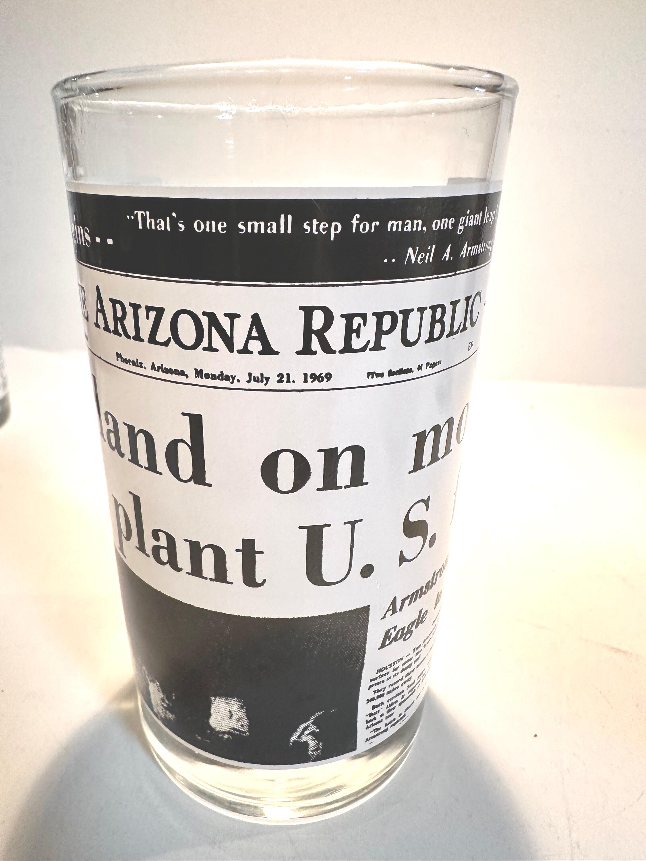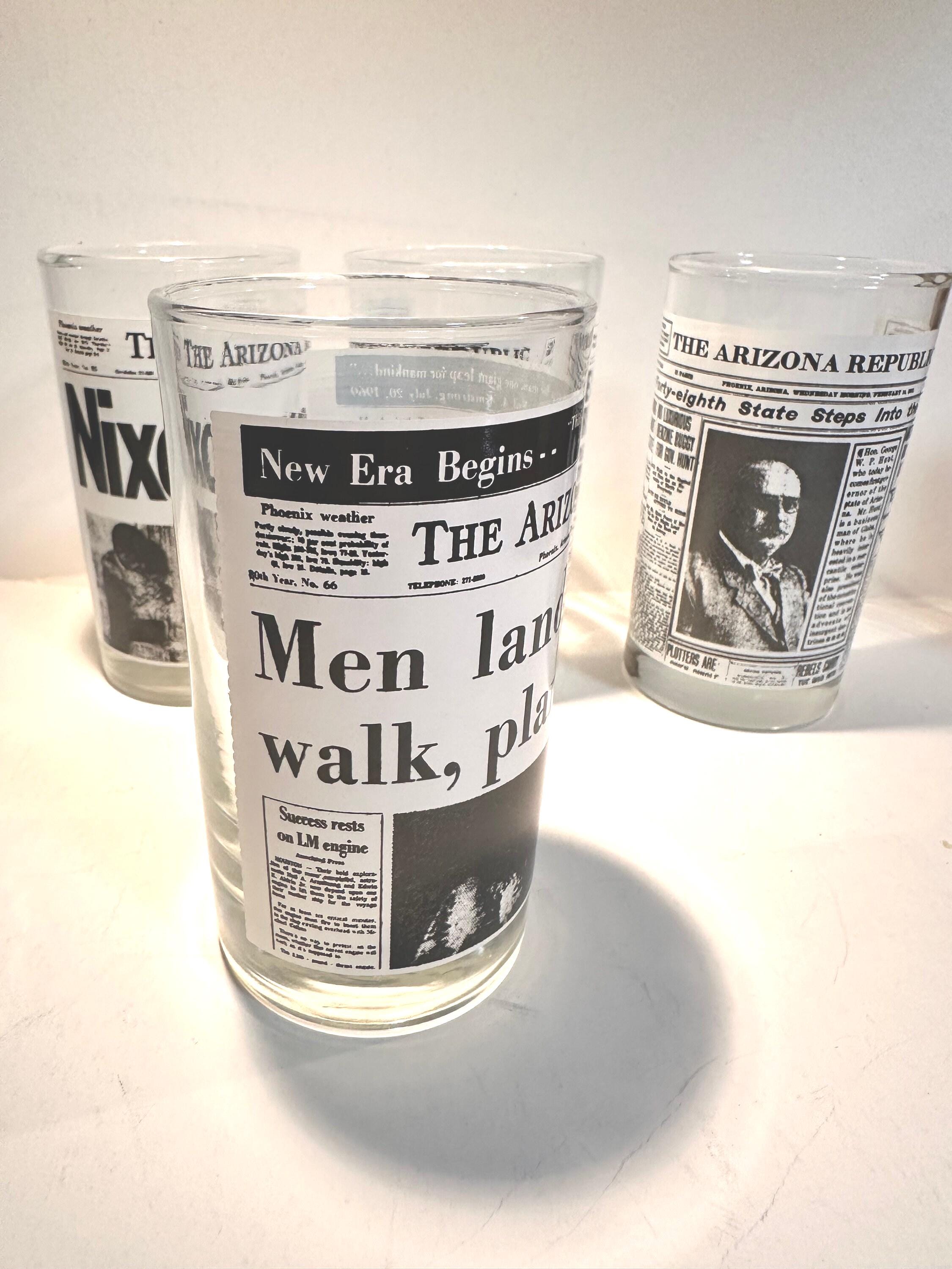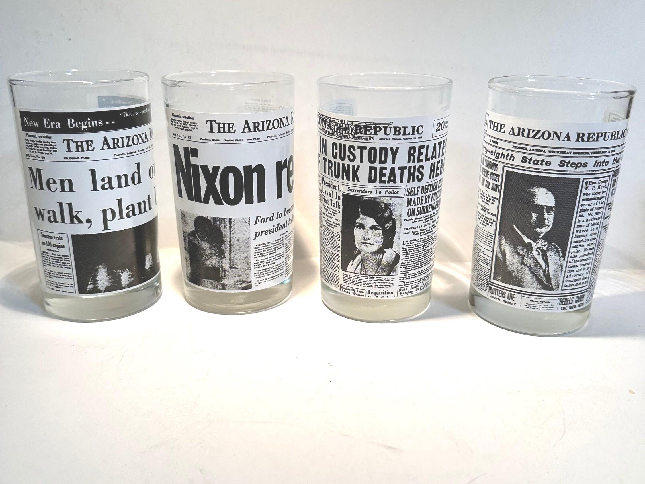 This is a set of 4 Libbey drinking glasses that features the famous Arizona Republic newspapers headlines pages. These are from the 1970s and are in excellent condition. They measures 5" tall x 2.75" diameter. They hold 8 fluid ounces.