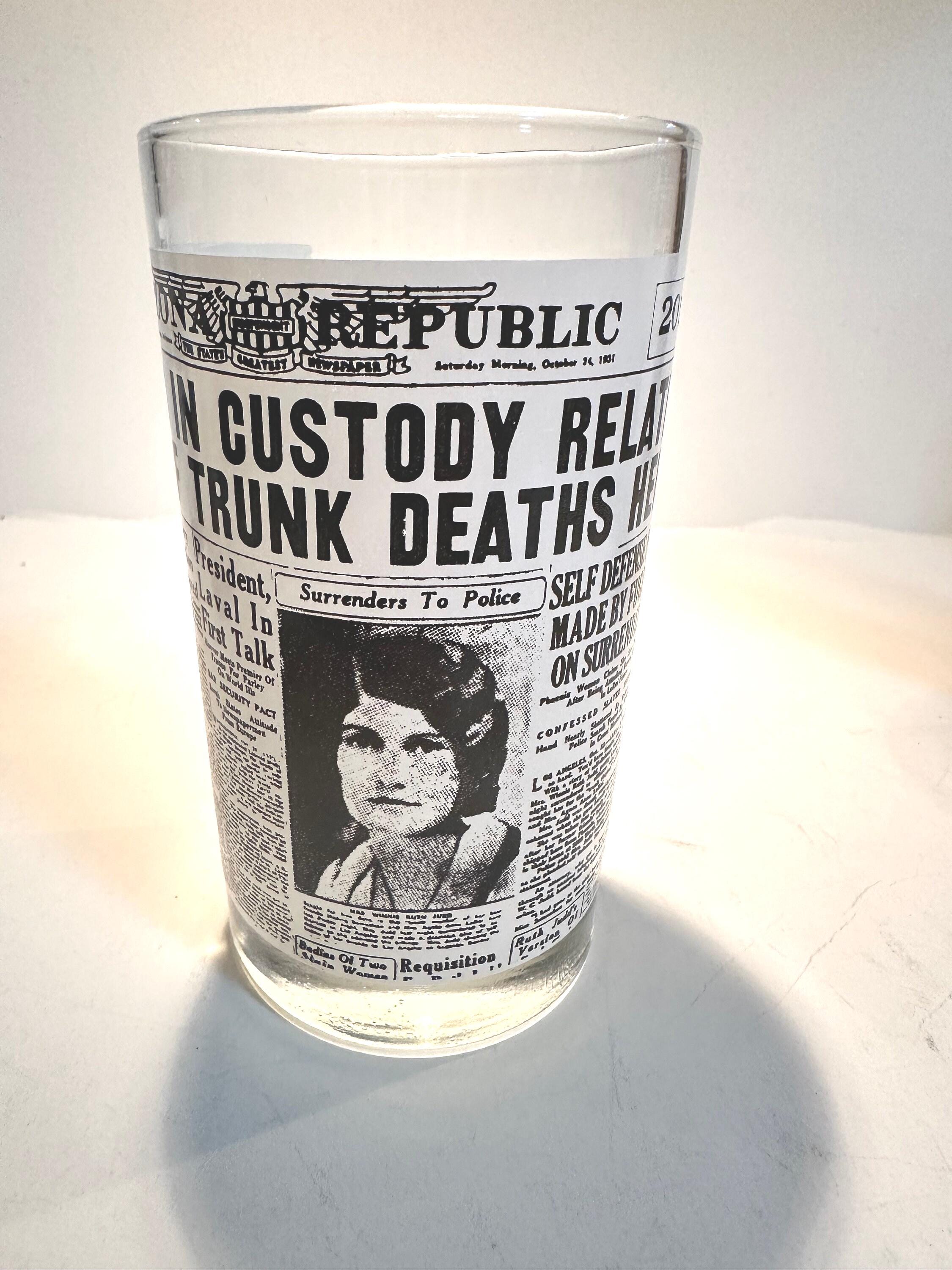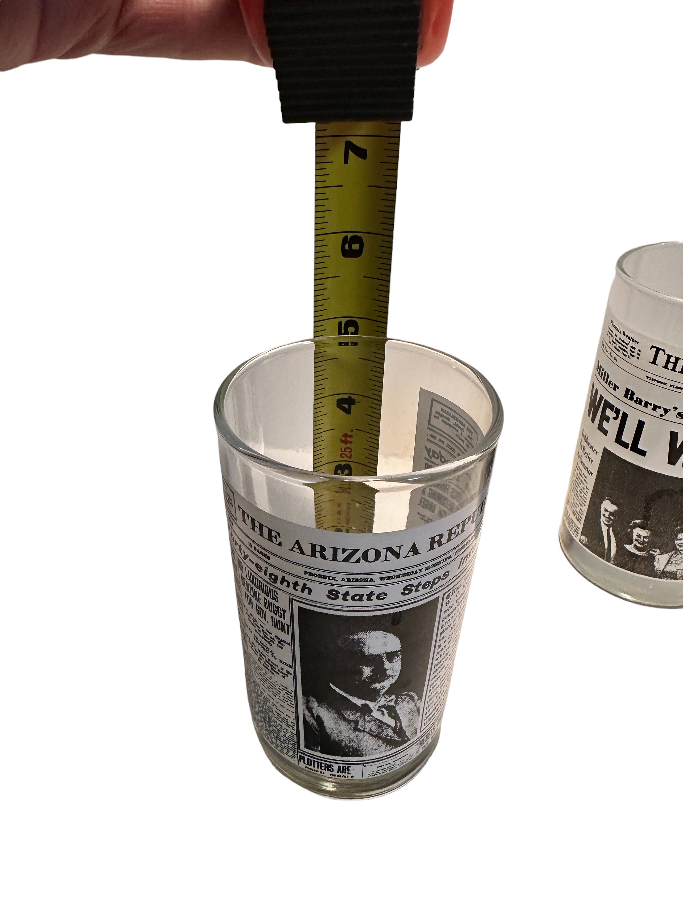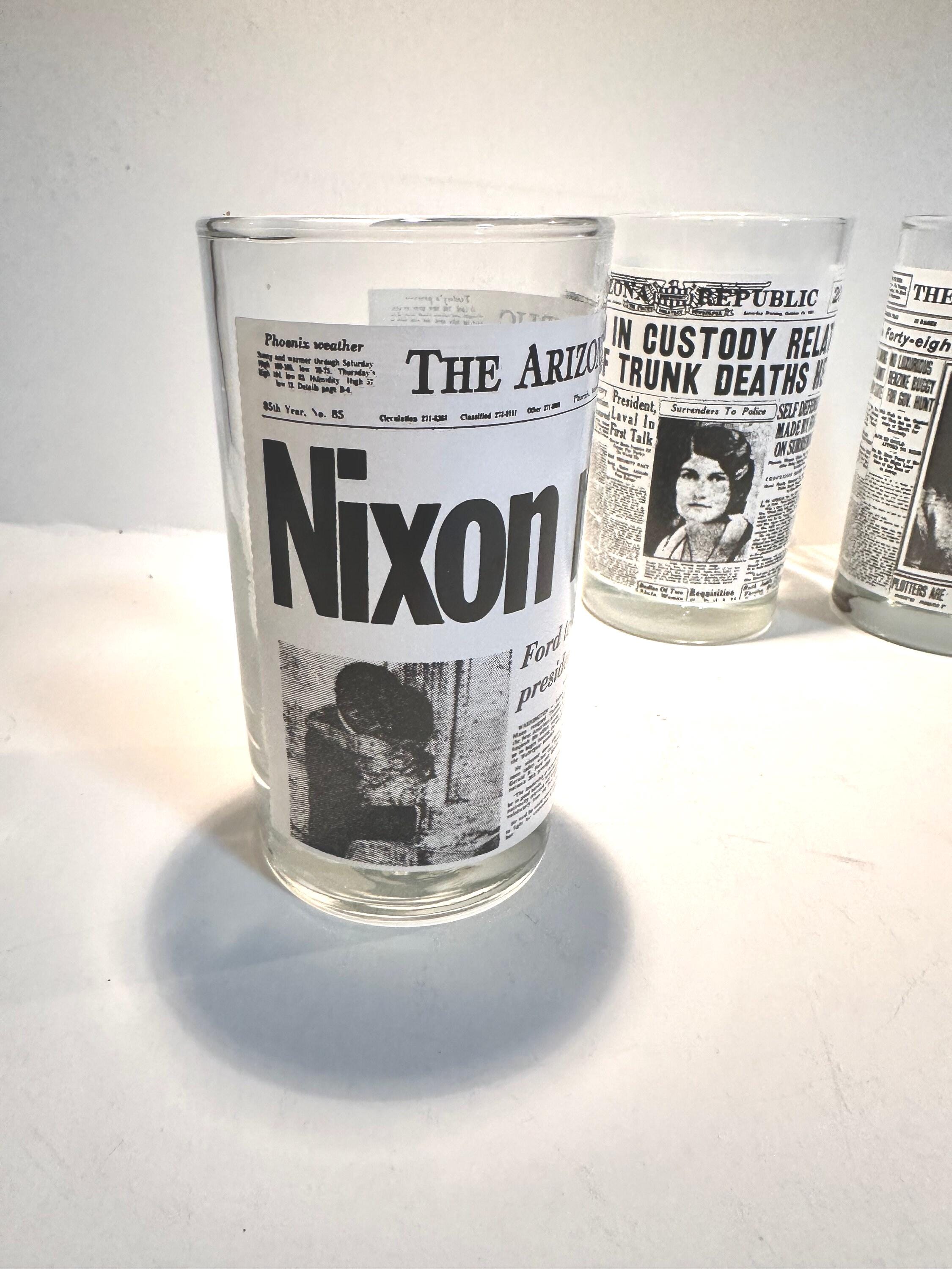 This is a set of 4 Libbey drinking glasses that features the famous Arizona Republic newspapers headlines pages. These are from the 1970s and are in excellent condition. They measures 5" tall x 2.75" diameter. They hold 8 fluid ounces.