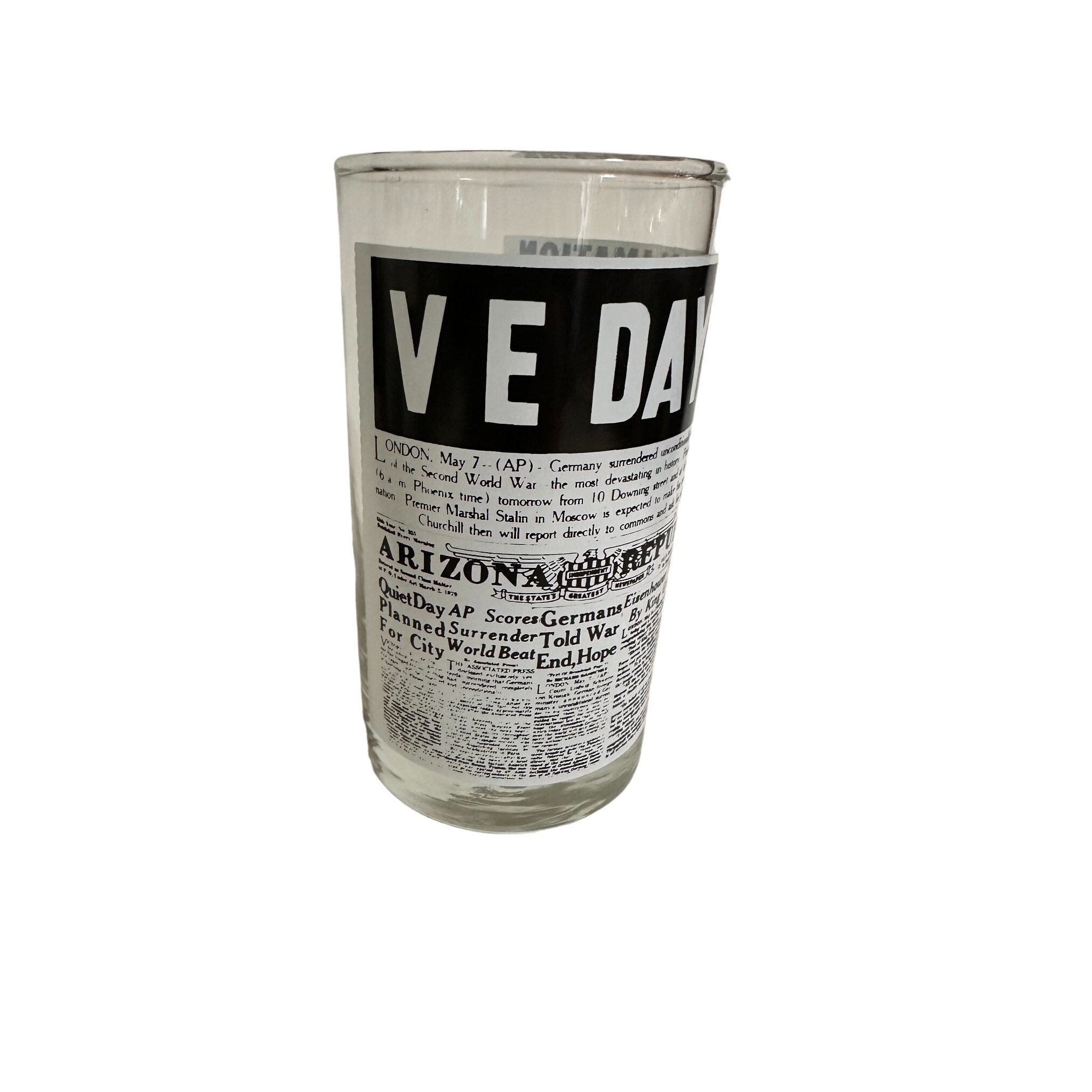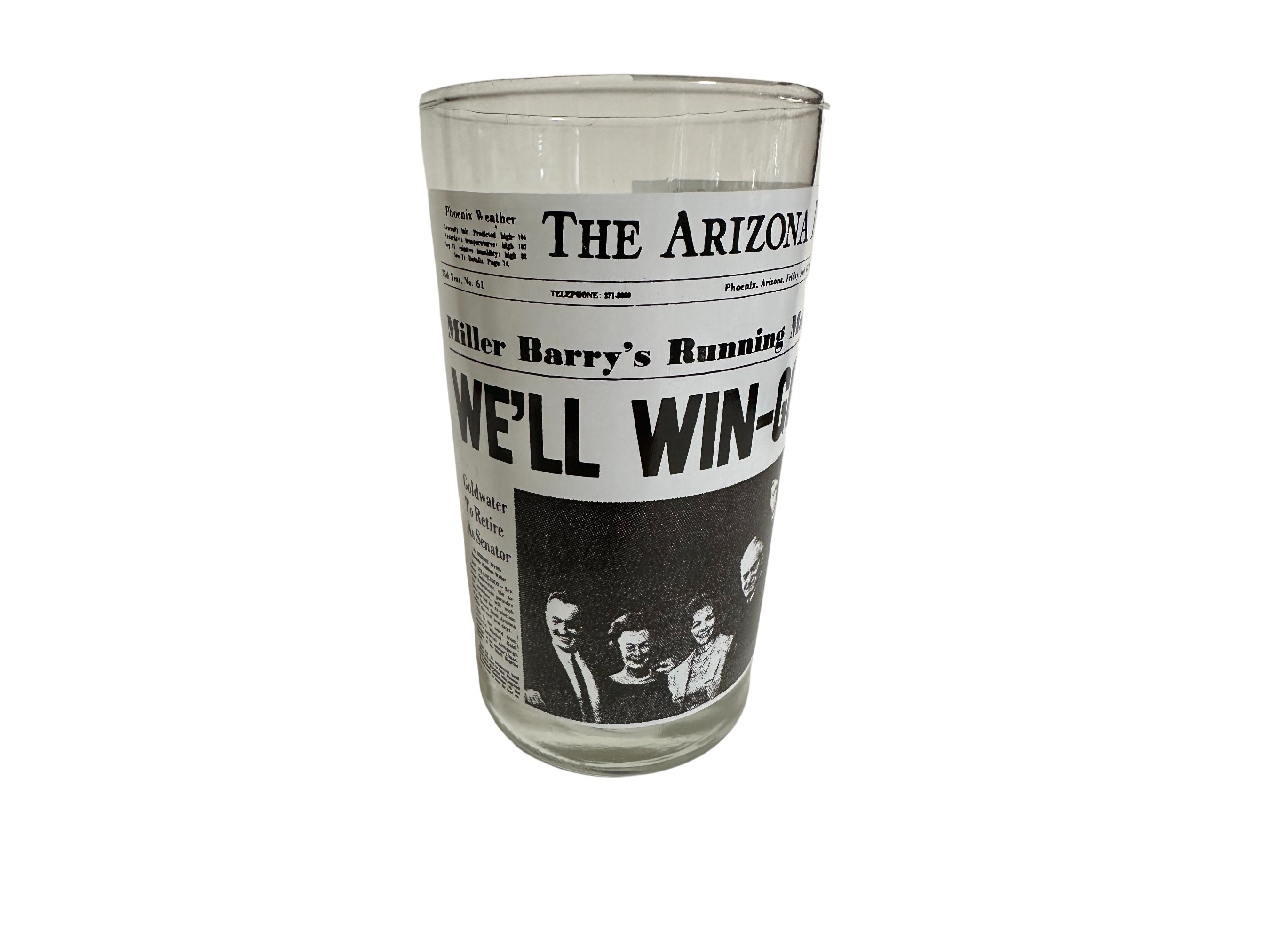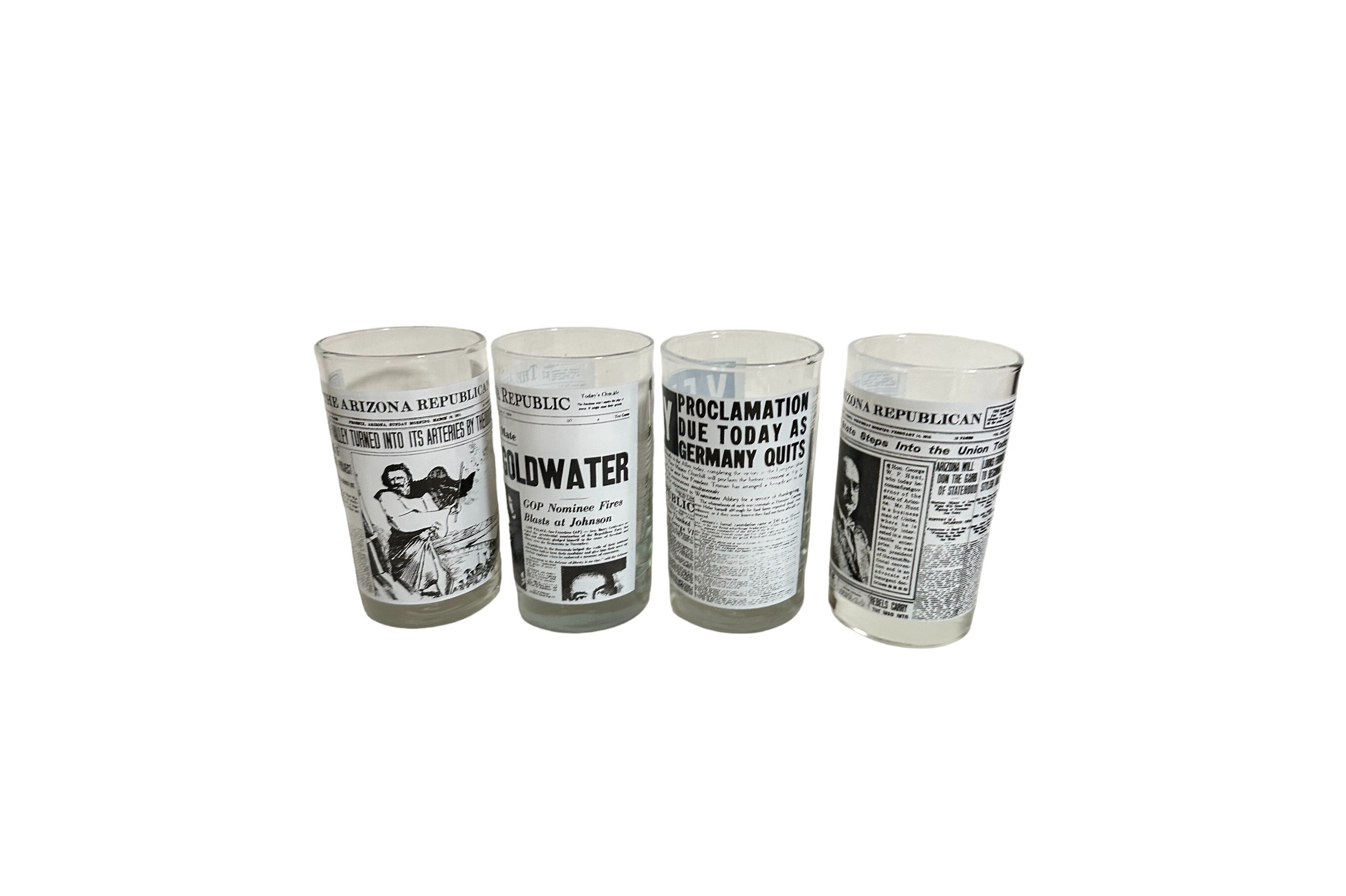 This is a set of 4 Libbey drinking glasses that features the famous Arizona Republic newspapers headlines pages. These highball glasses are from the 1970s and are in excellent condition. They measures 5" tall x 2.75" diameter. They hold 8 fluid ounces.