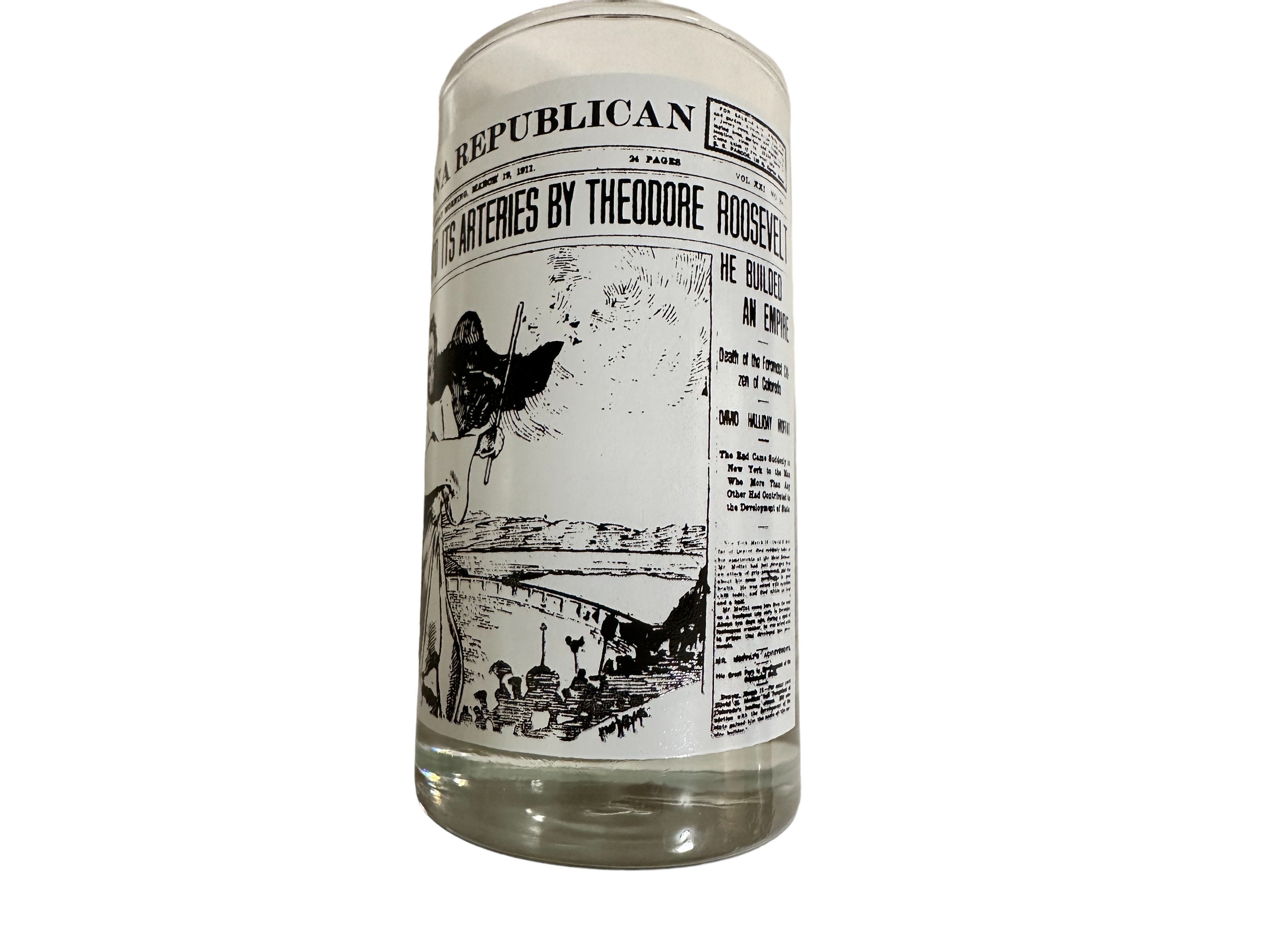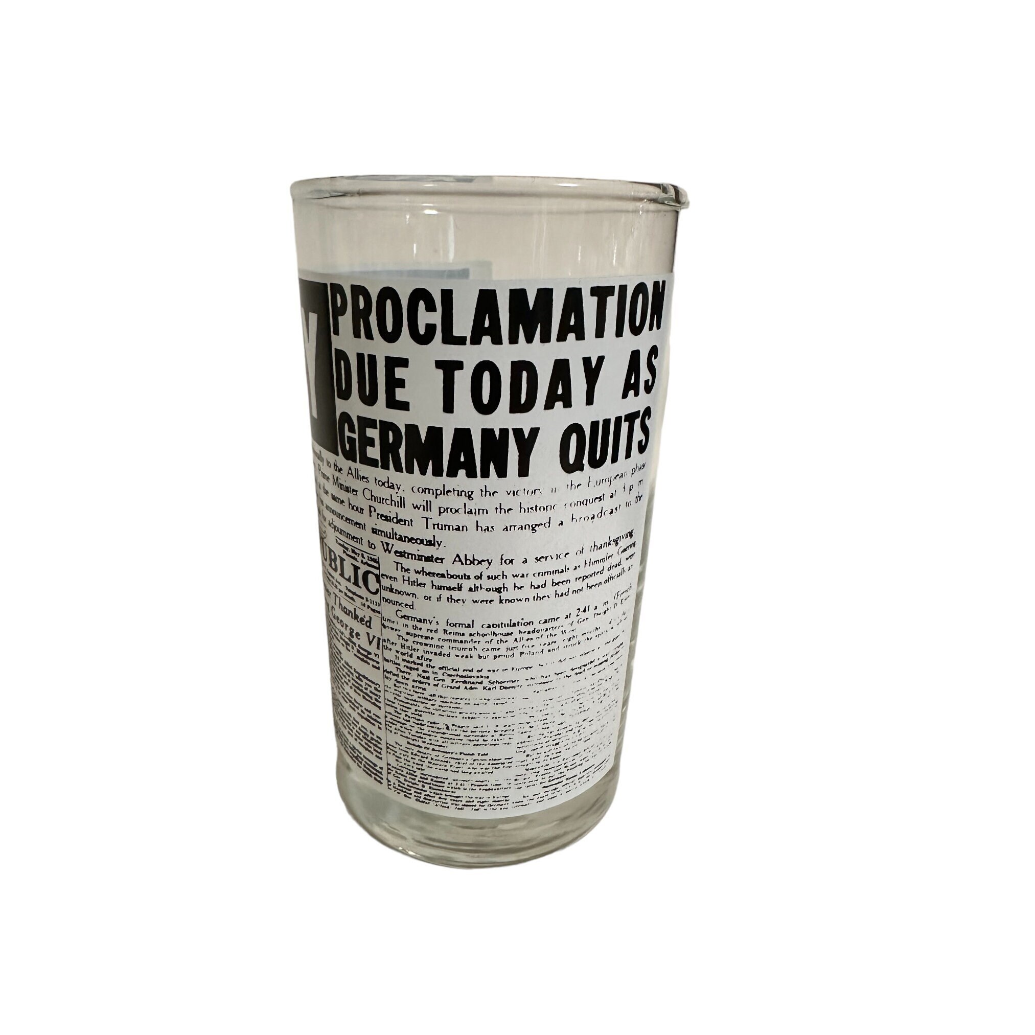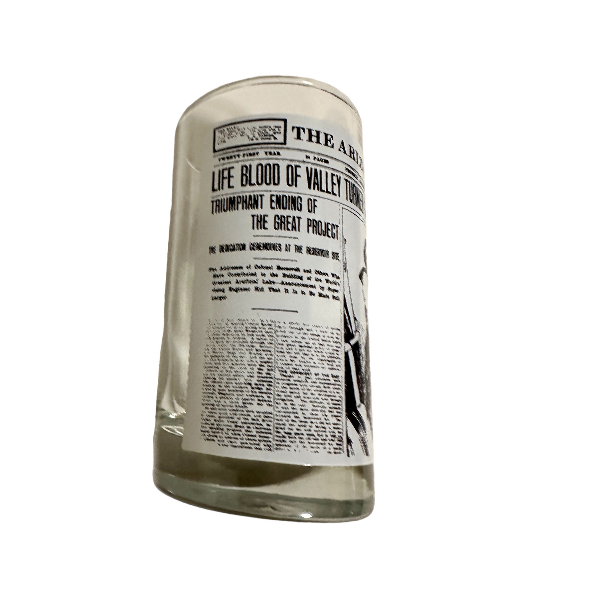 This is a set of 4 Libbey drinking glasses that features the famous Arizona Republic newspapers headlines pages. These highball glasses are from the 1970s and are in excellent condition. They measures 5" tall x 2.75" diameter. They hold 8 fluid ounces.