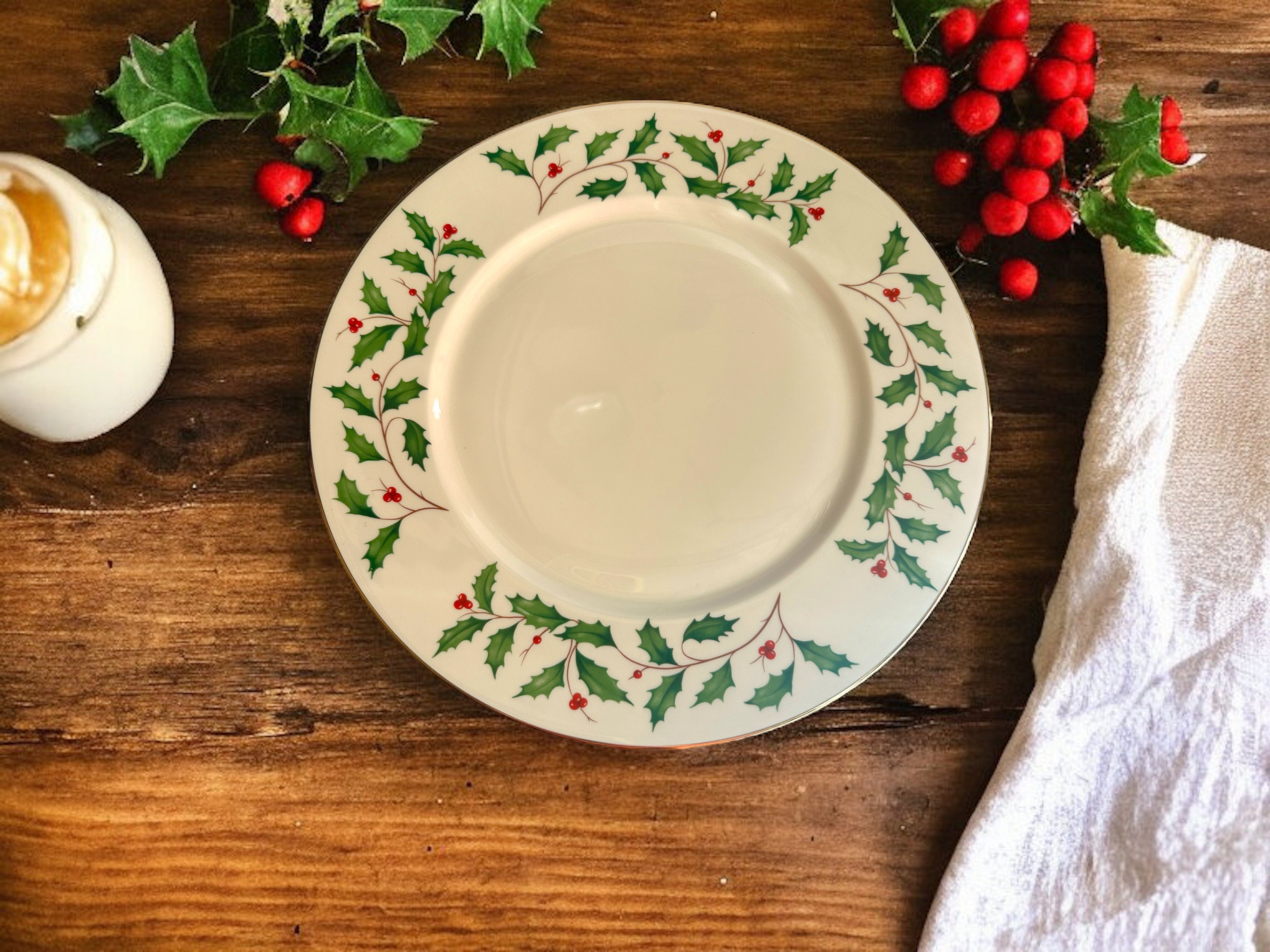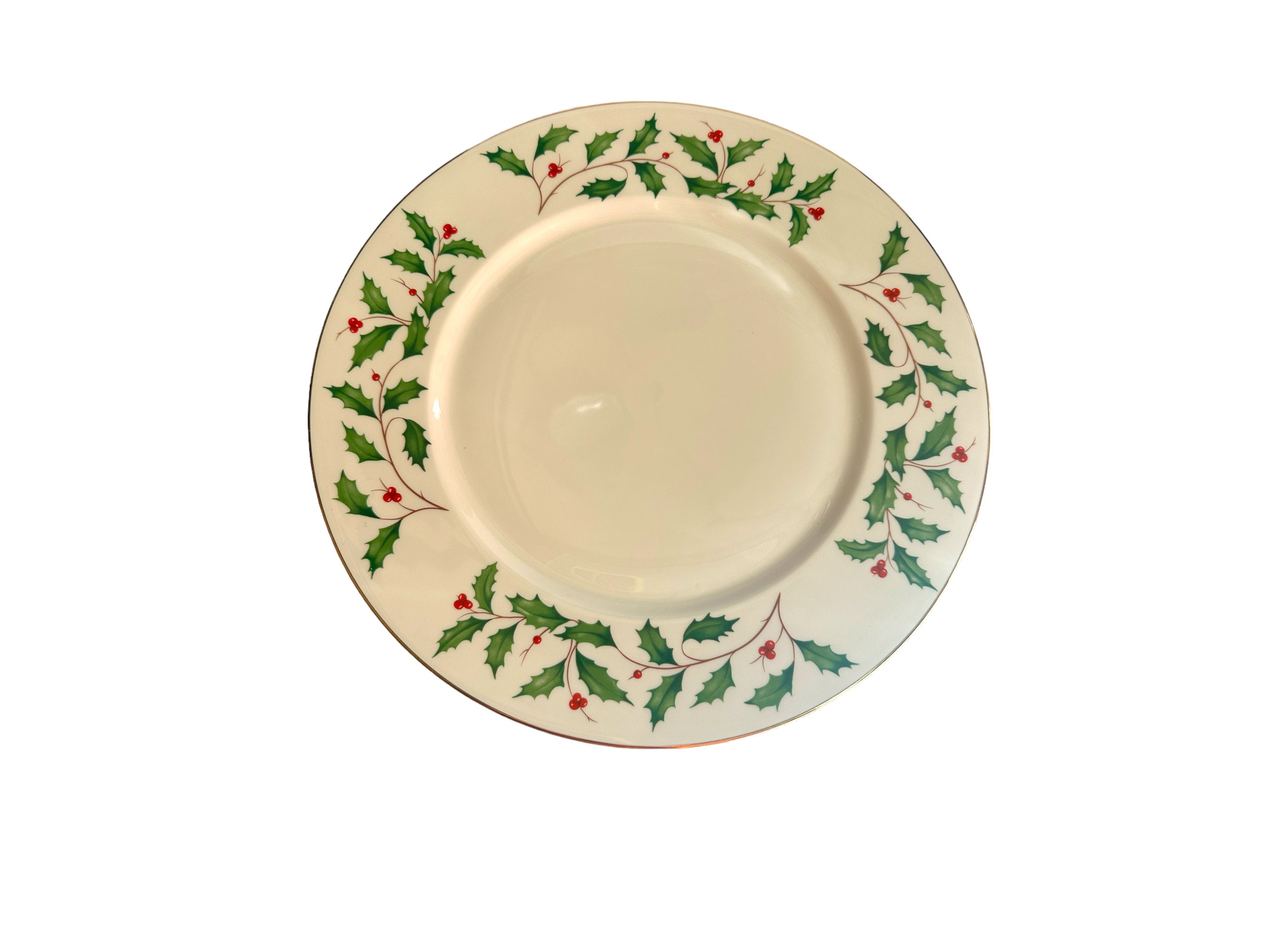 This is a cream-colored porcelain Lenox Christmas cookie tray plate. It measures 11 7/8 inches in diameter. It has festive green holly and red holly berries on the outer rim. The edges are trimmed in 24k gold. It is in unused condition.