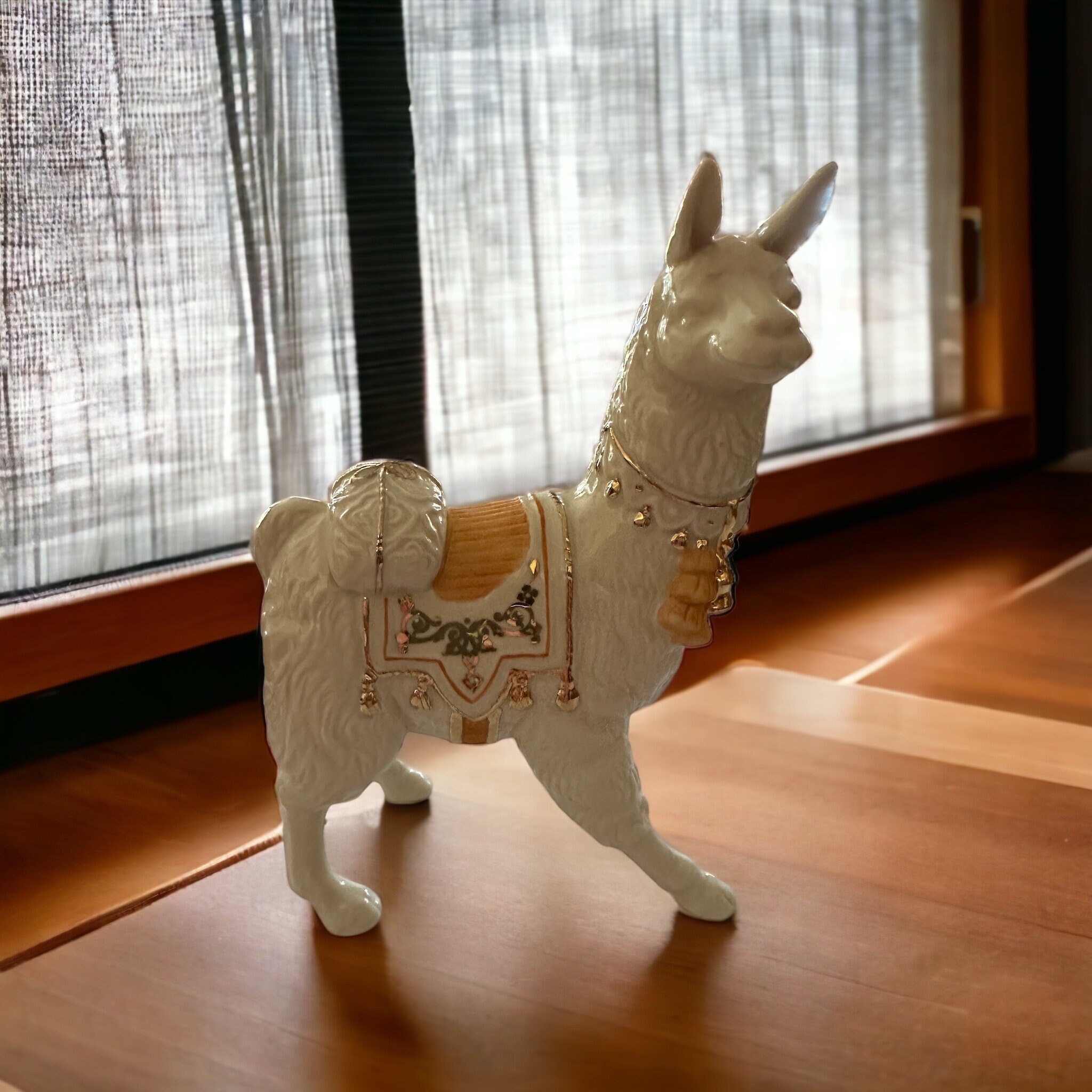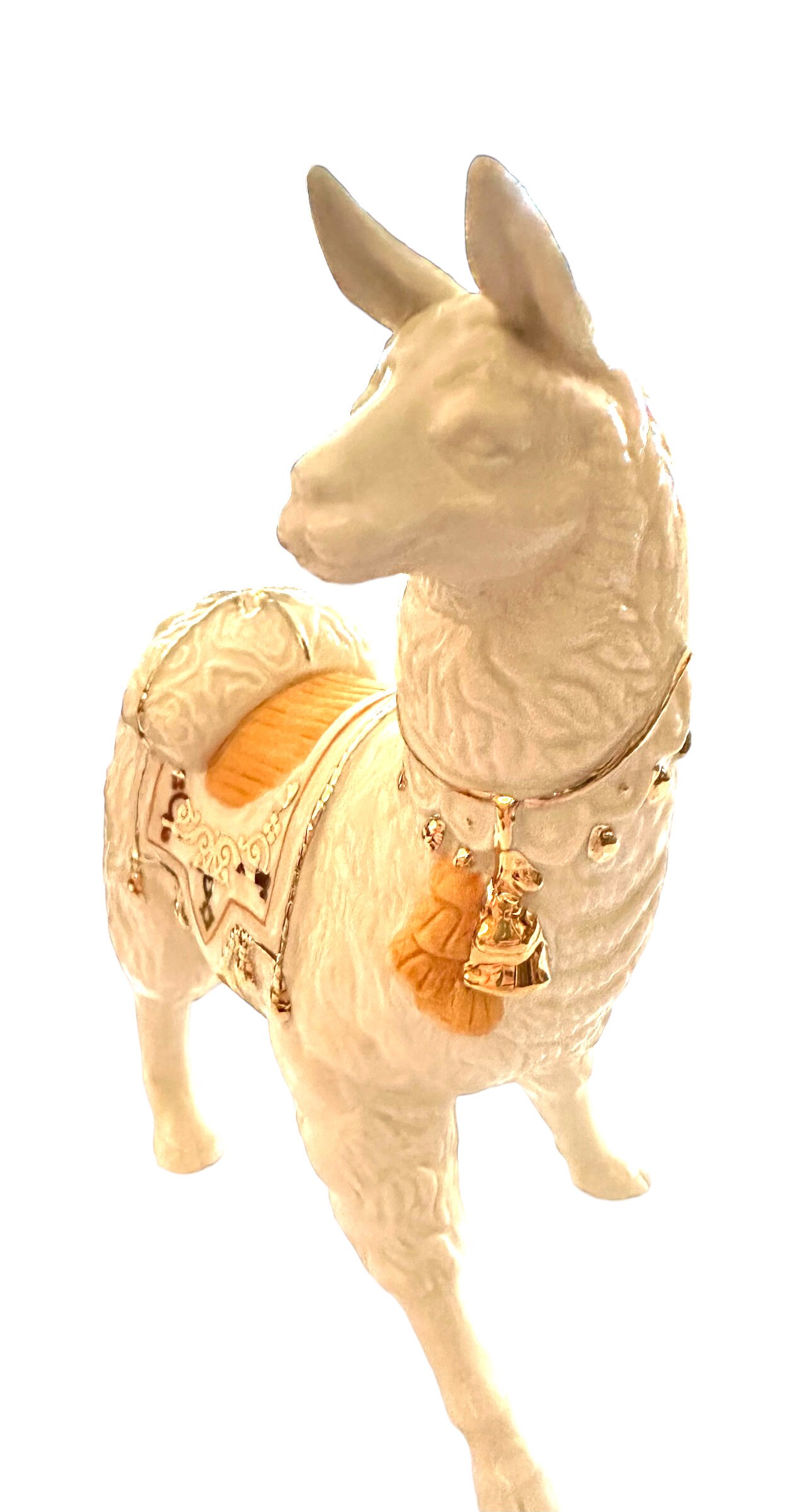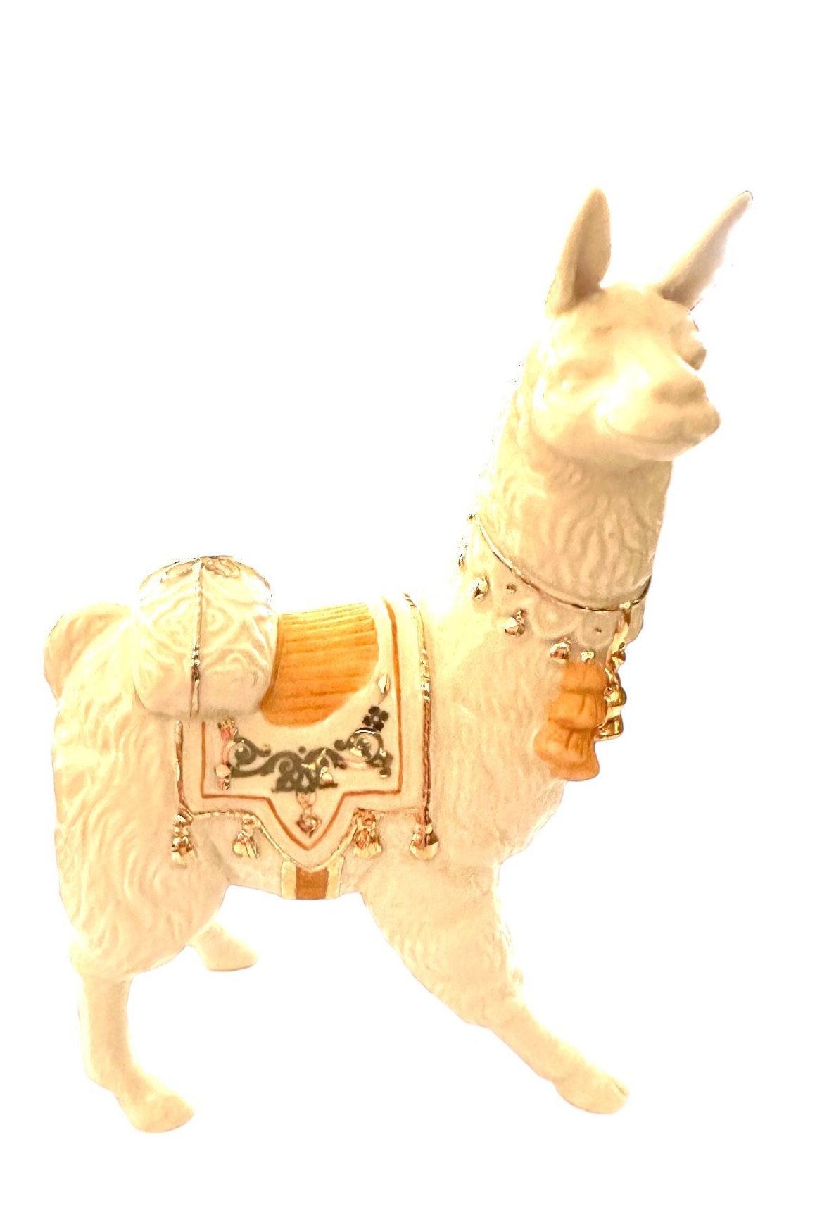 Beautiful Christmas llama figurine from the First Blessings Collection. New in the box. This hand-painted llama measures 6.5" high and is off-white in color. It is in excellent condition. Cute porcelain animal.