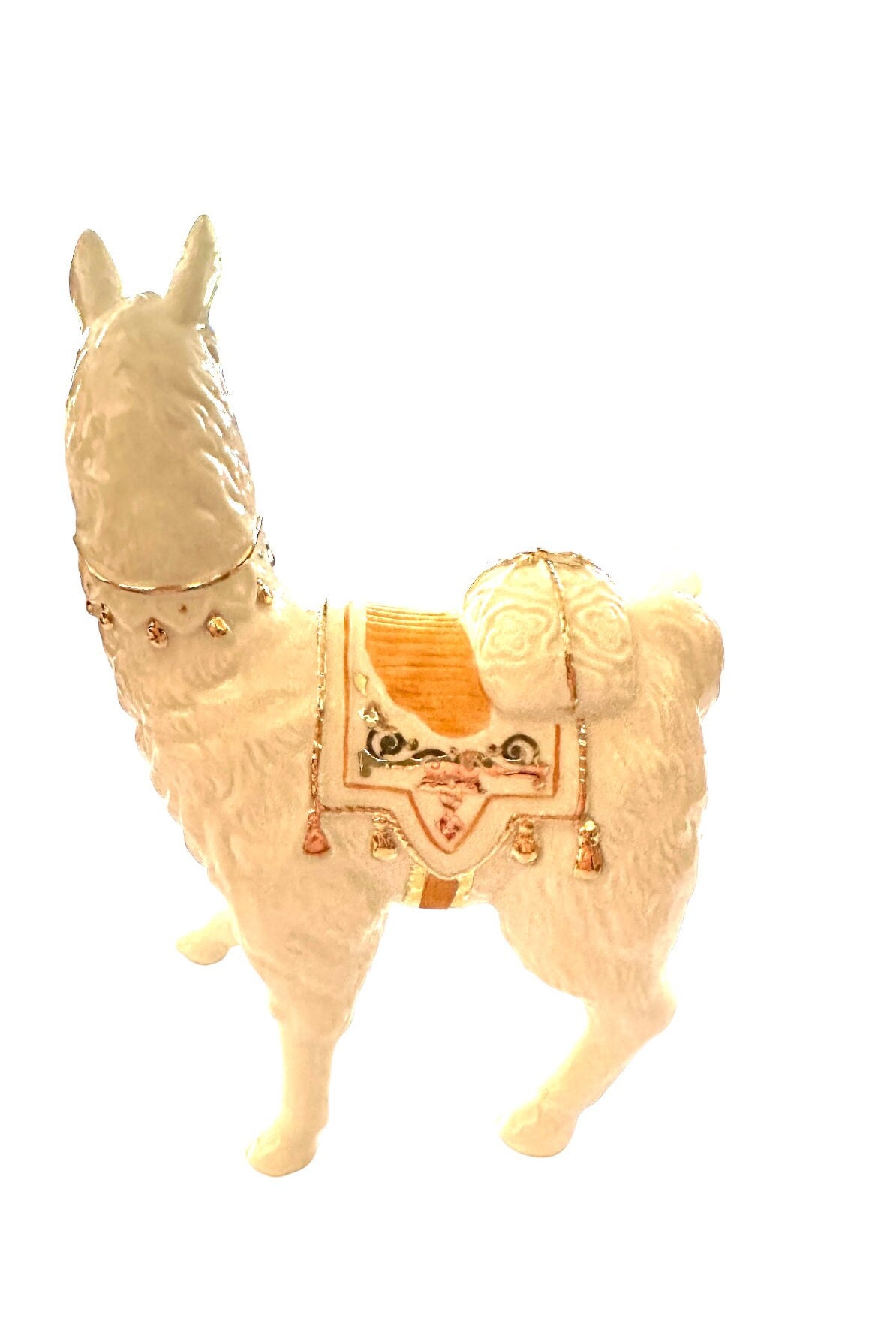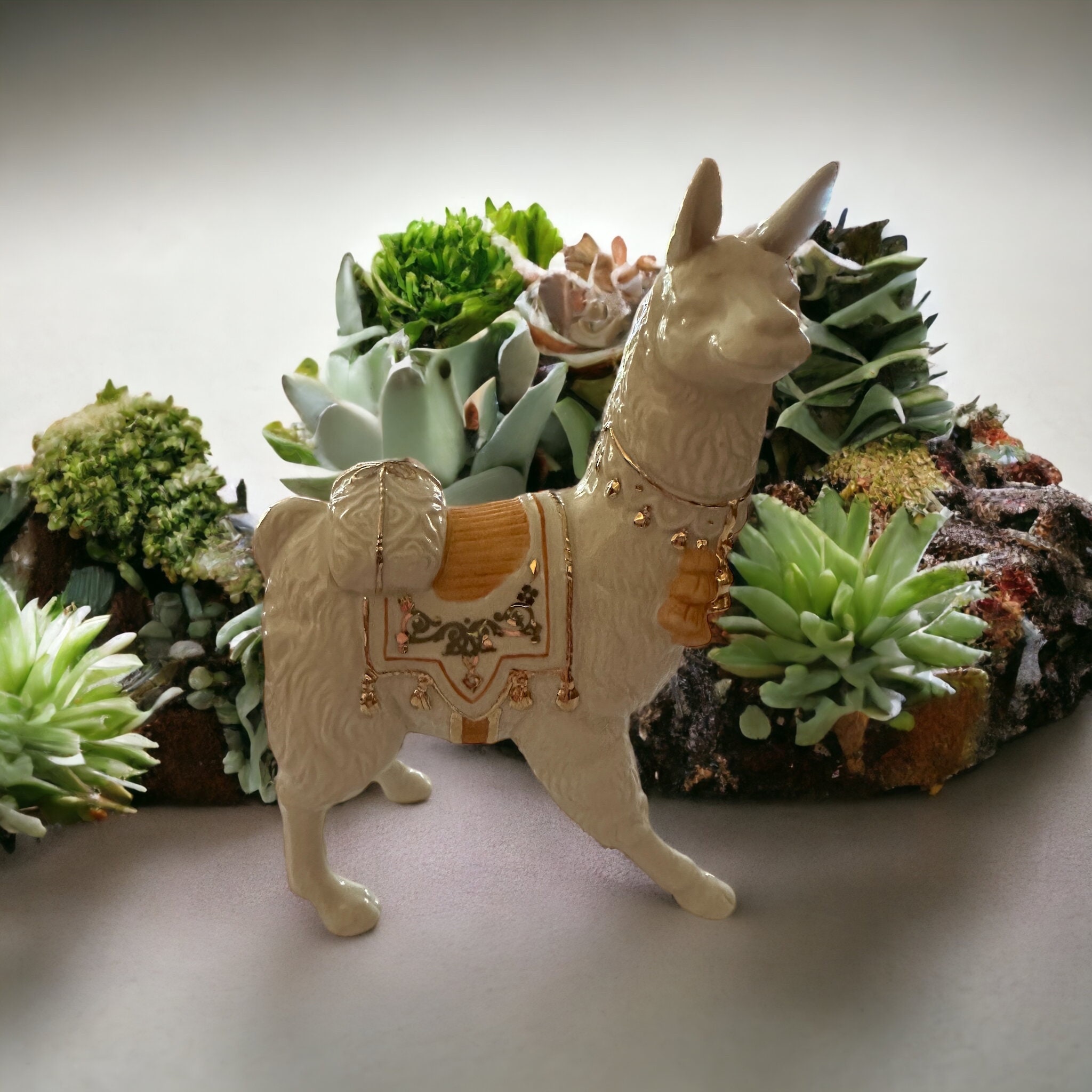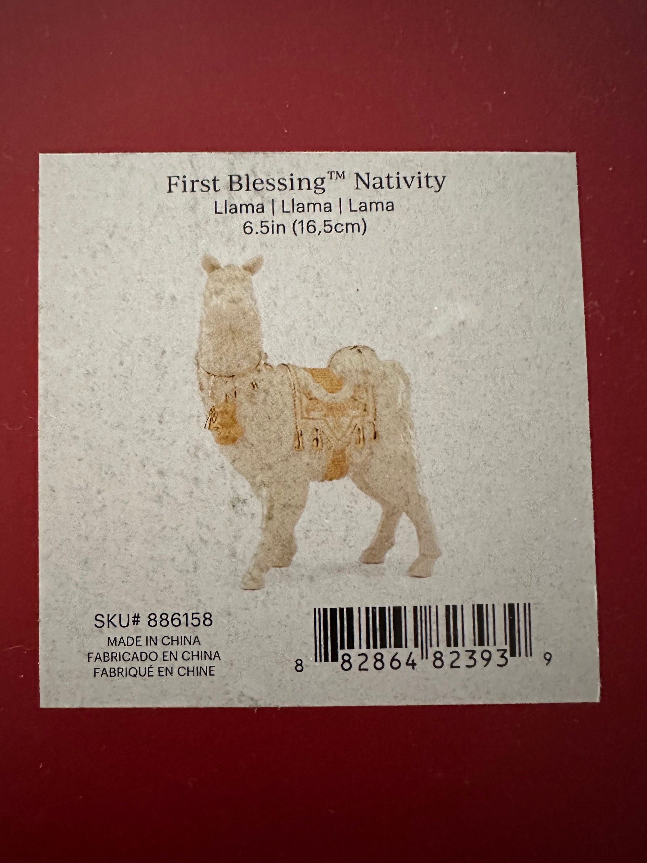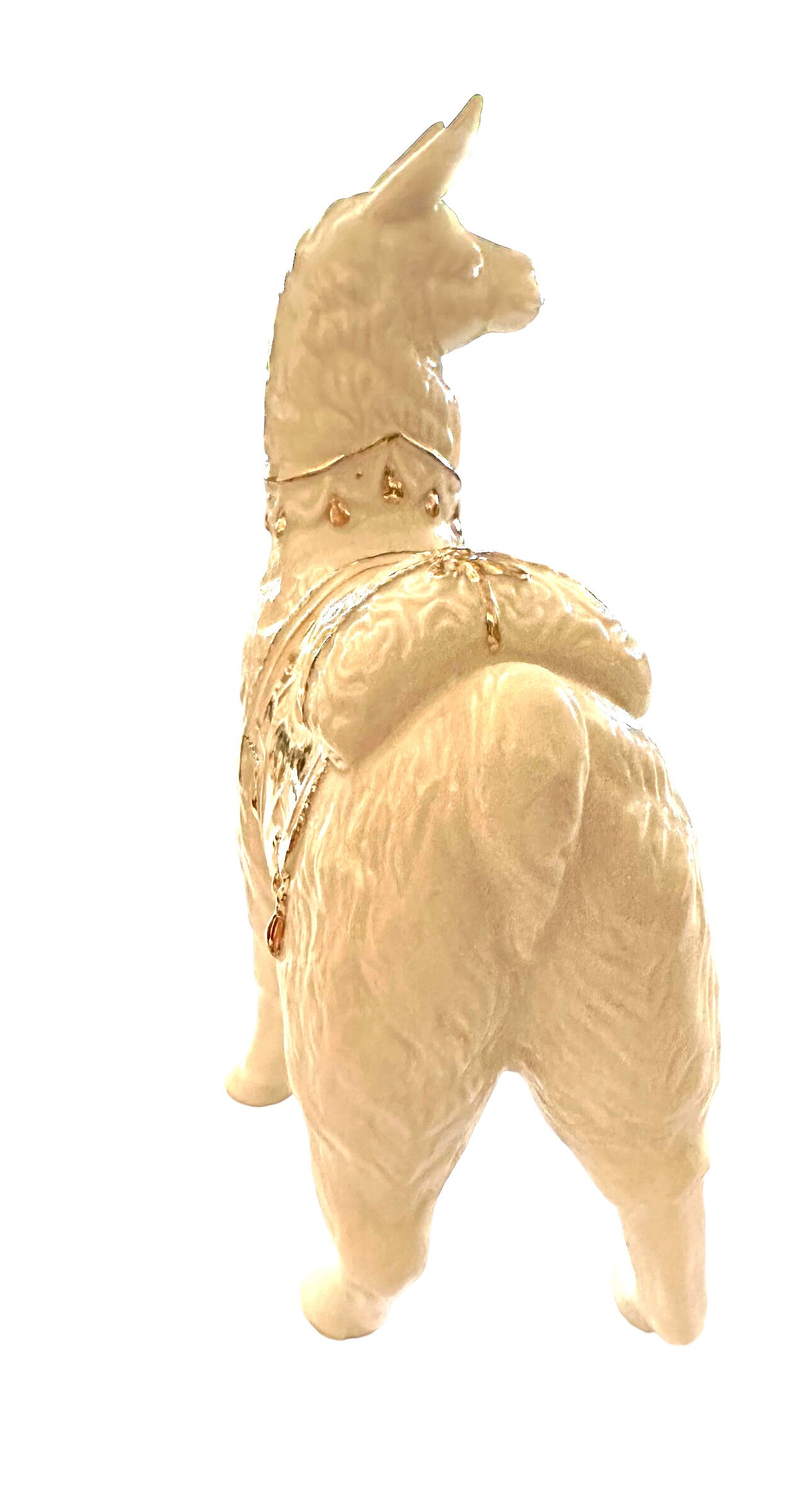 Beautiful Christmas llama figurine from the First Blessings Collection. New in the box. This hand-painted llama measures 6.5" high and is off-white in color. It is in excellent condition. Cute porcelain animal.