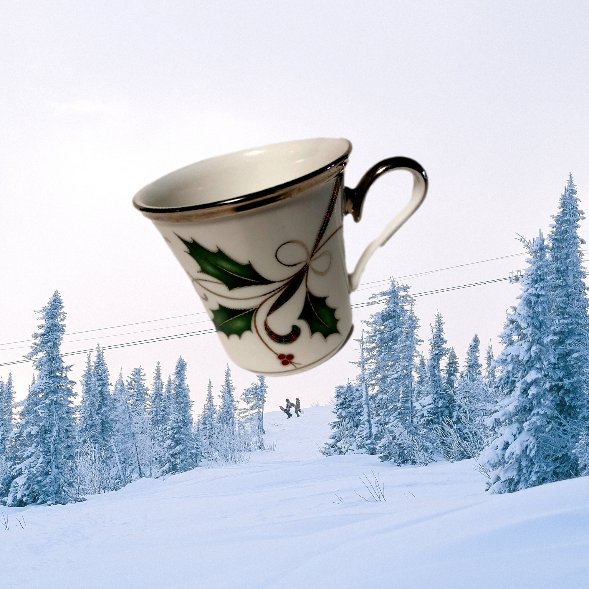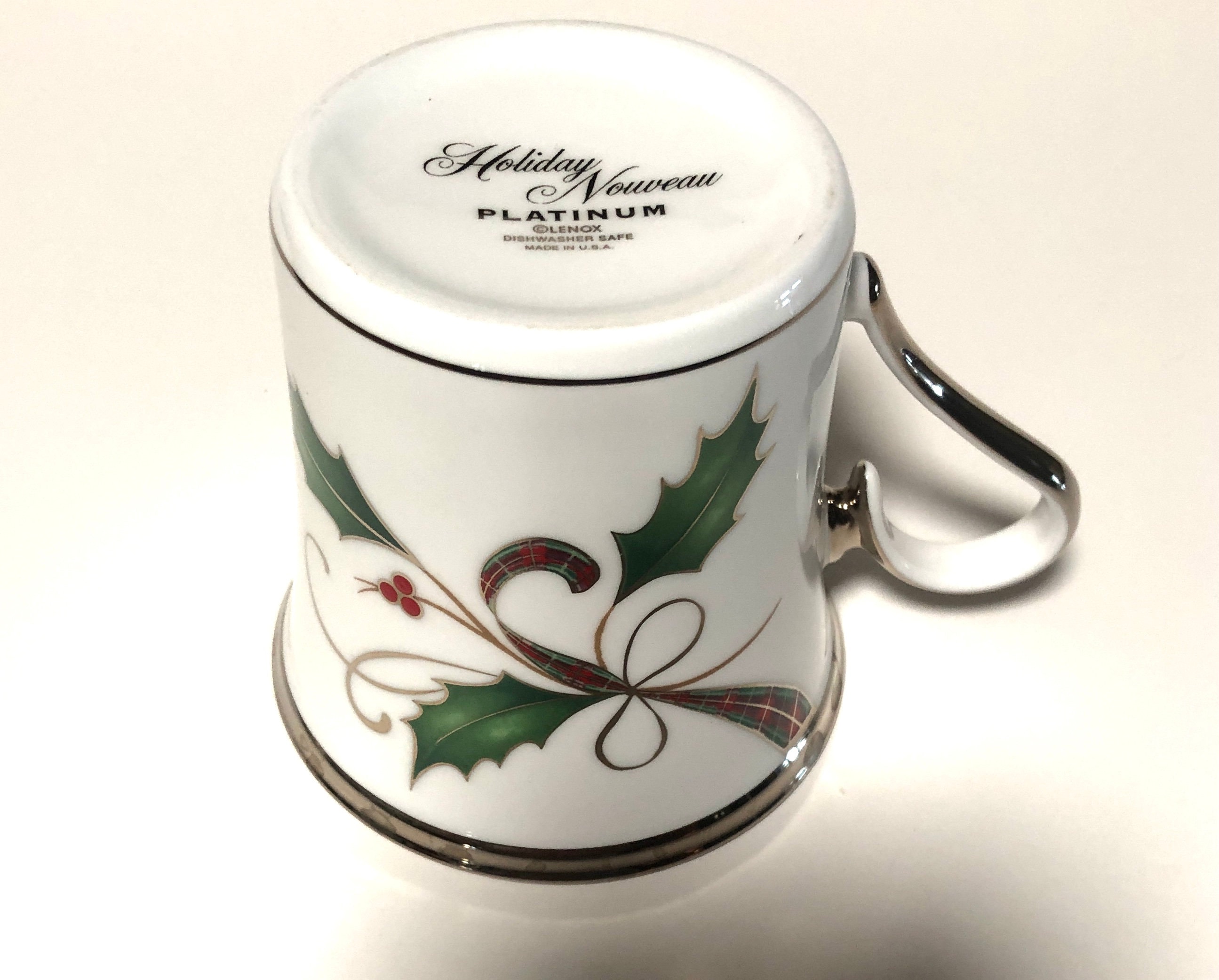 This is a new rare set of four (4) china Lenox Holiday China in the holly-berry Holiday Nouveau, ivory-colored with platinum, Christmas cups or mugs.
