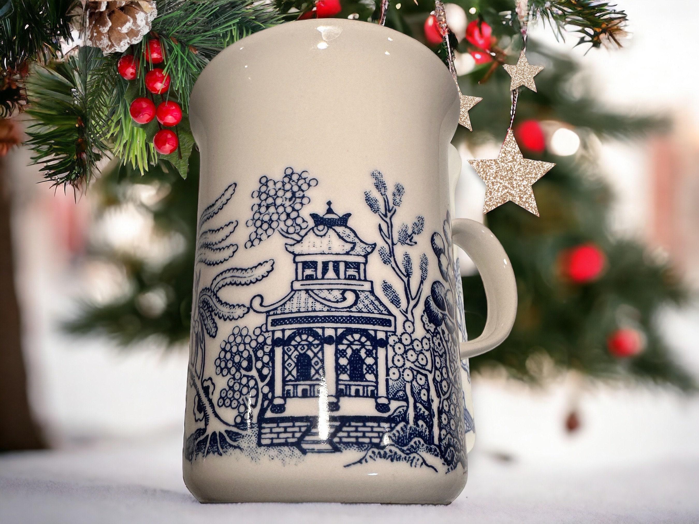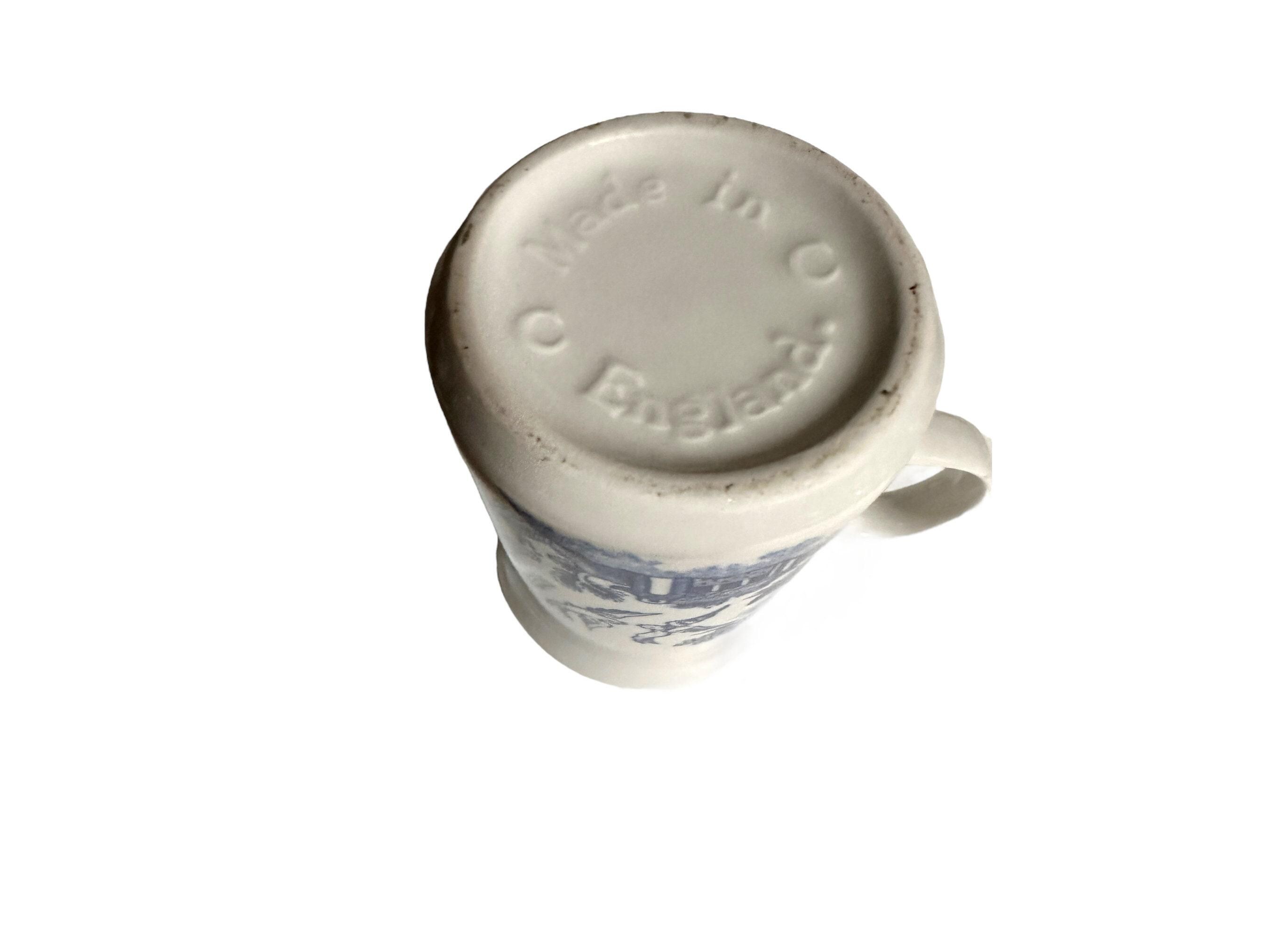 Experience the timeless charm of our beautifully crafted vintage Asian blue mug from Staffordshire, England, that brings an authentic touch to your tea time. With its stunning blue and white design and collectible appeal, this mug makes an ideal gift for tea lovers—add it to your collection today and savor every sip! This is a vintage blue willow coffee mug. It holds eight fluid ounces. It features an Asian pagoda design and is Georgian-shaped.