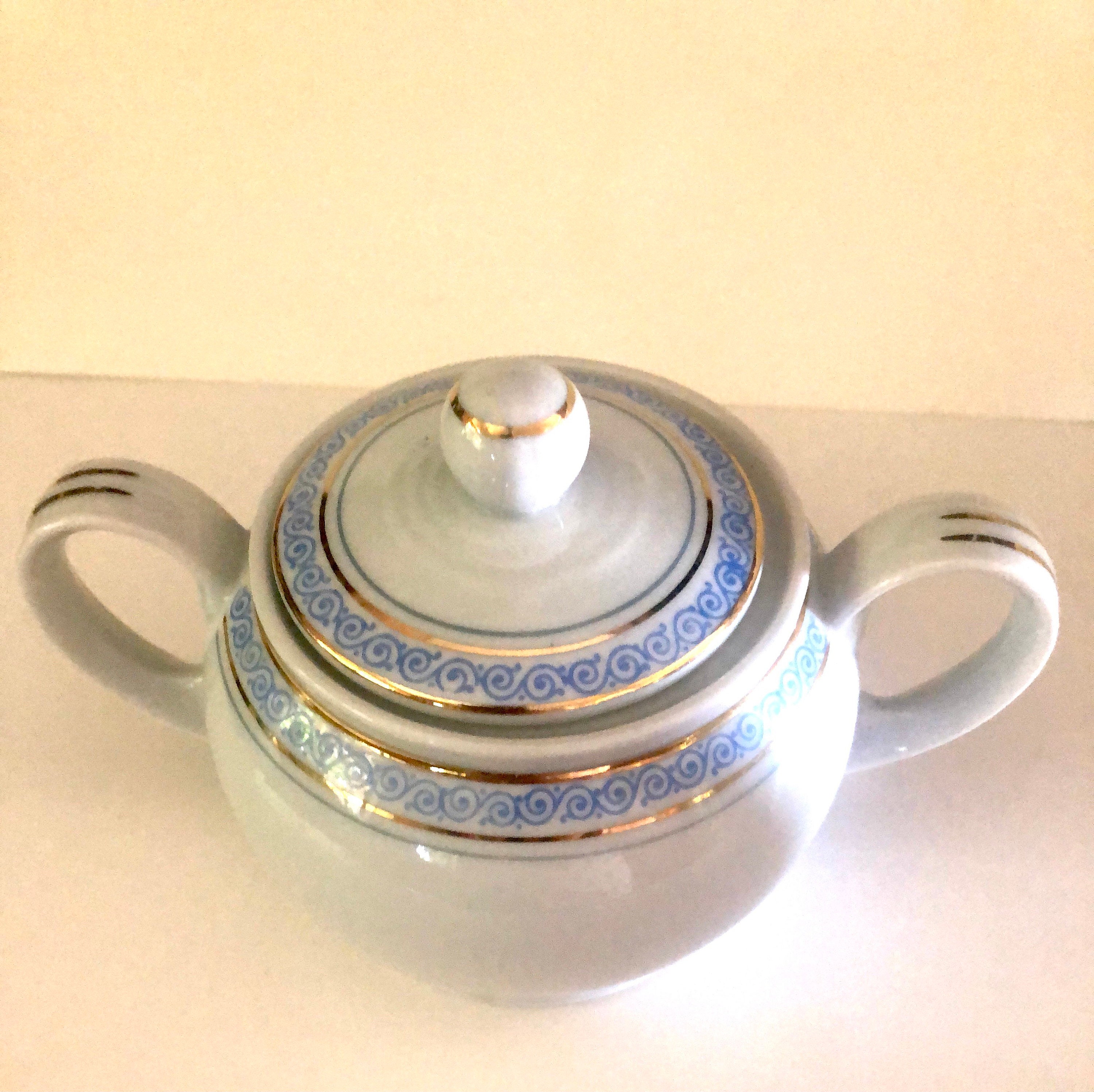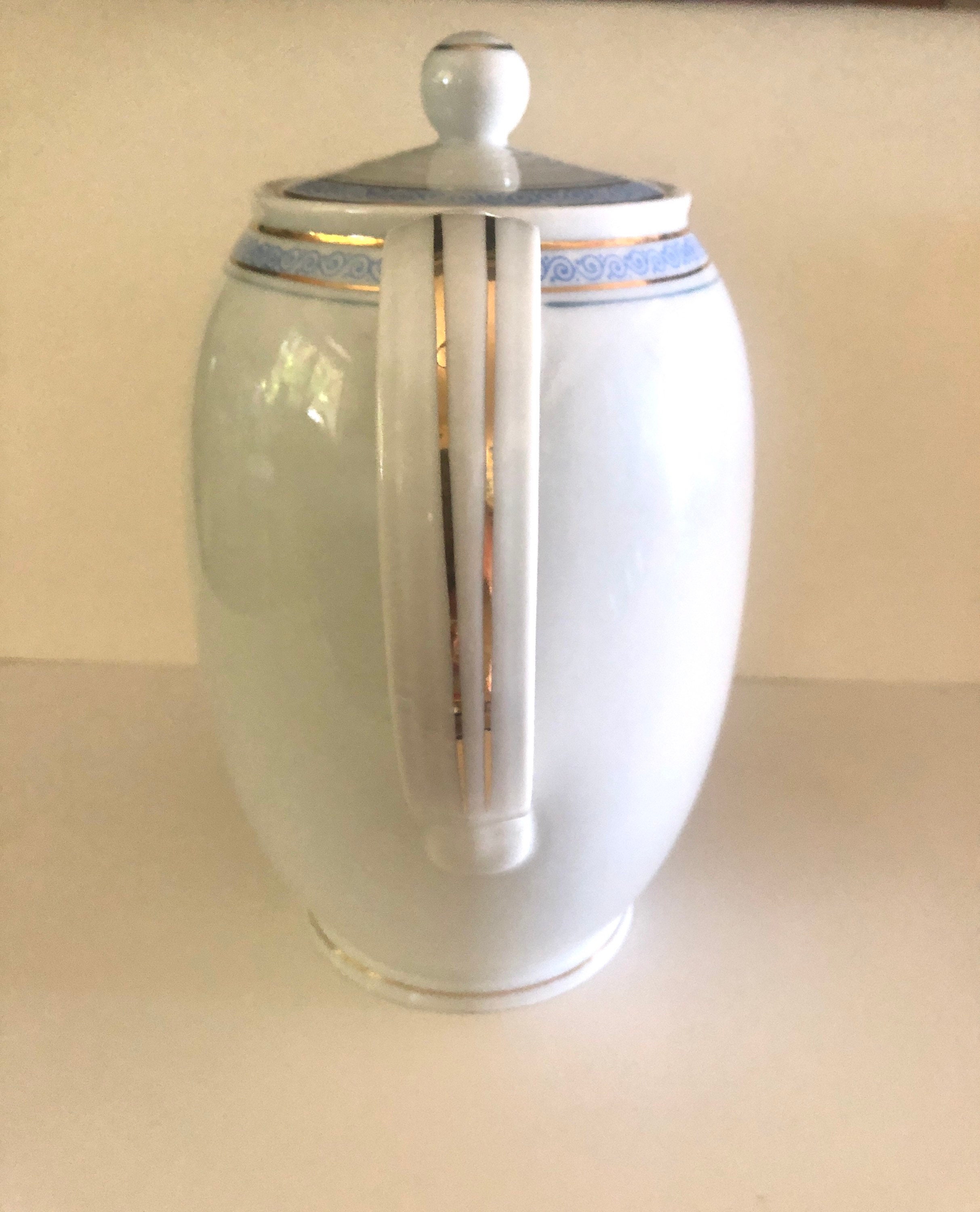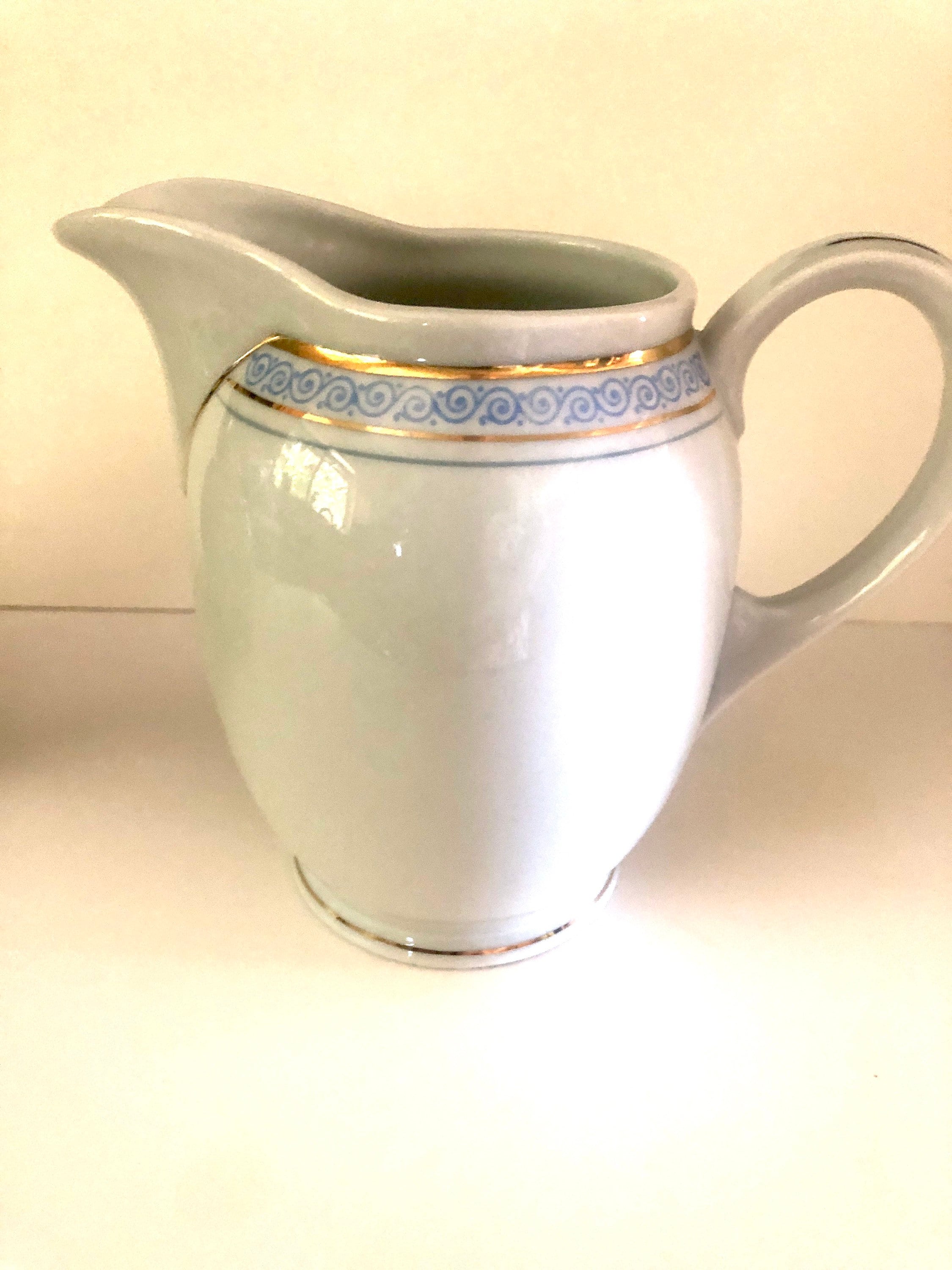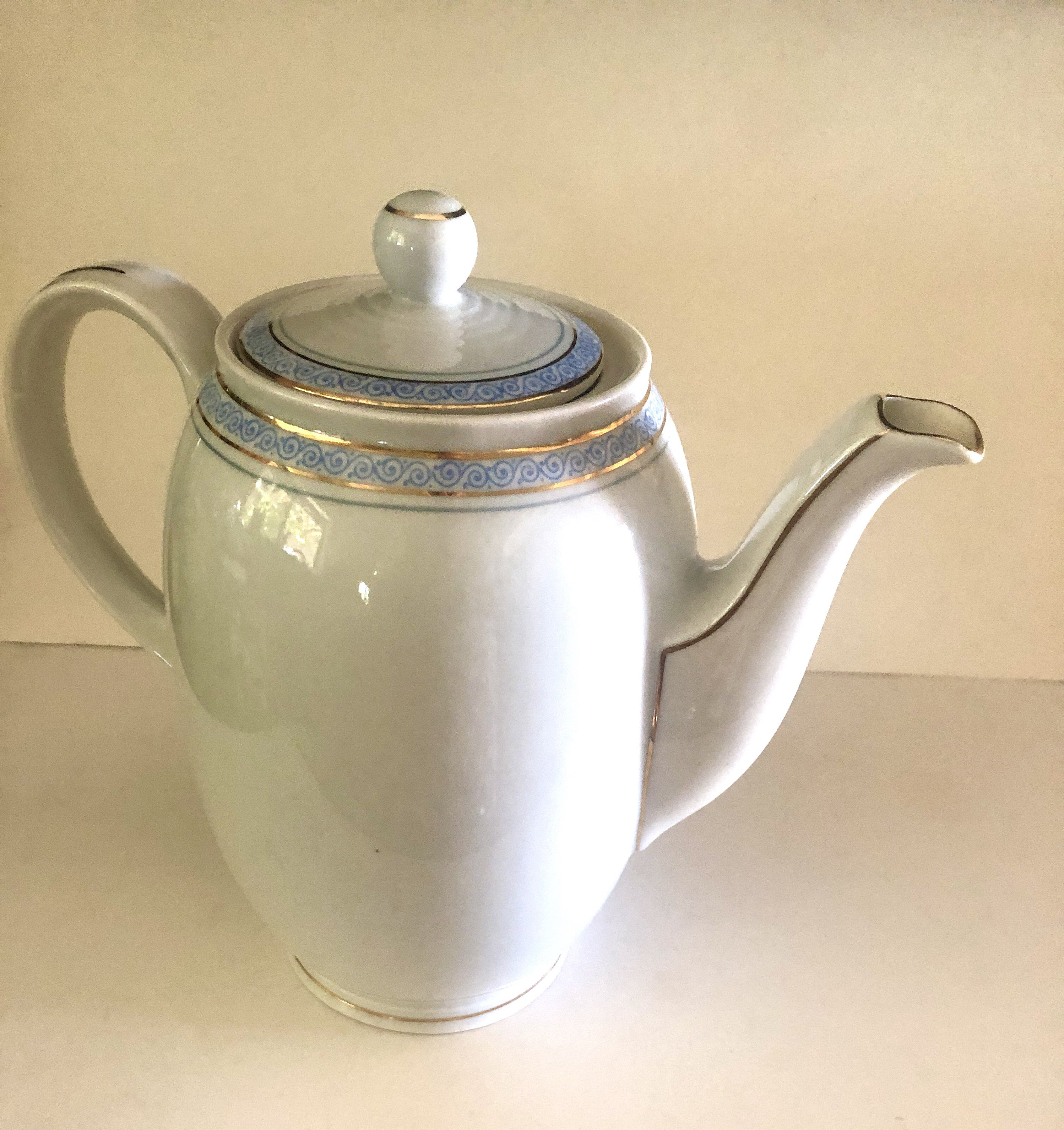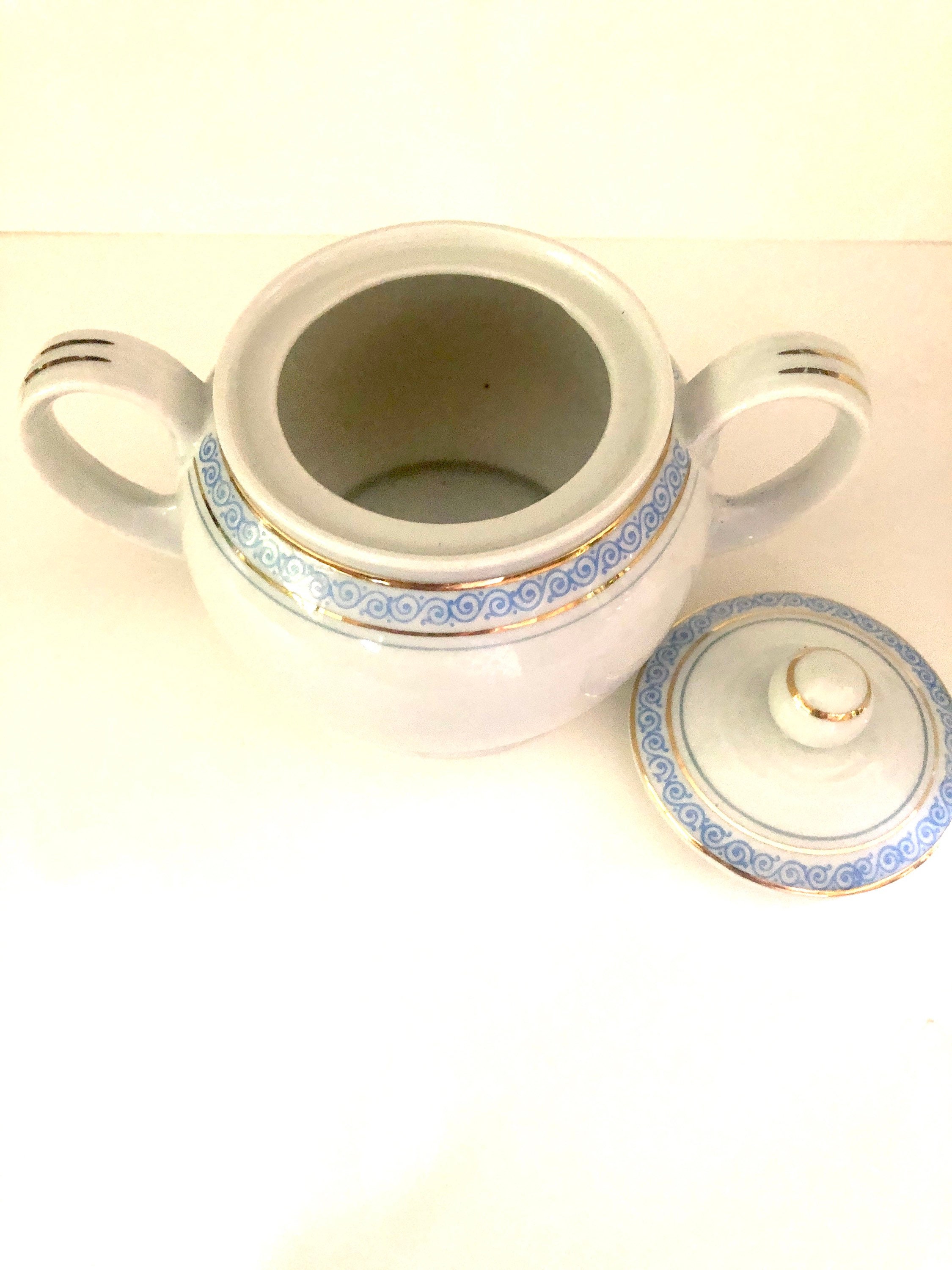 The PMR Bavarian Jaeger Eisenberg Tea Set includes a covered sugar bowl, teapot, and creamer. The Bavarian china is in excellent condition with no chips, cracks, or crazing. Lovely white with a blue scroll design and outlined in gold.