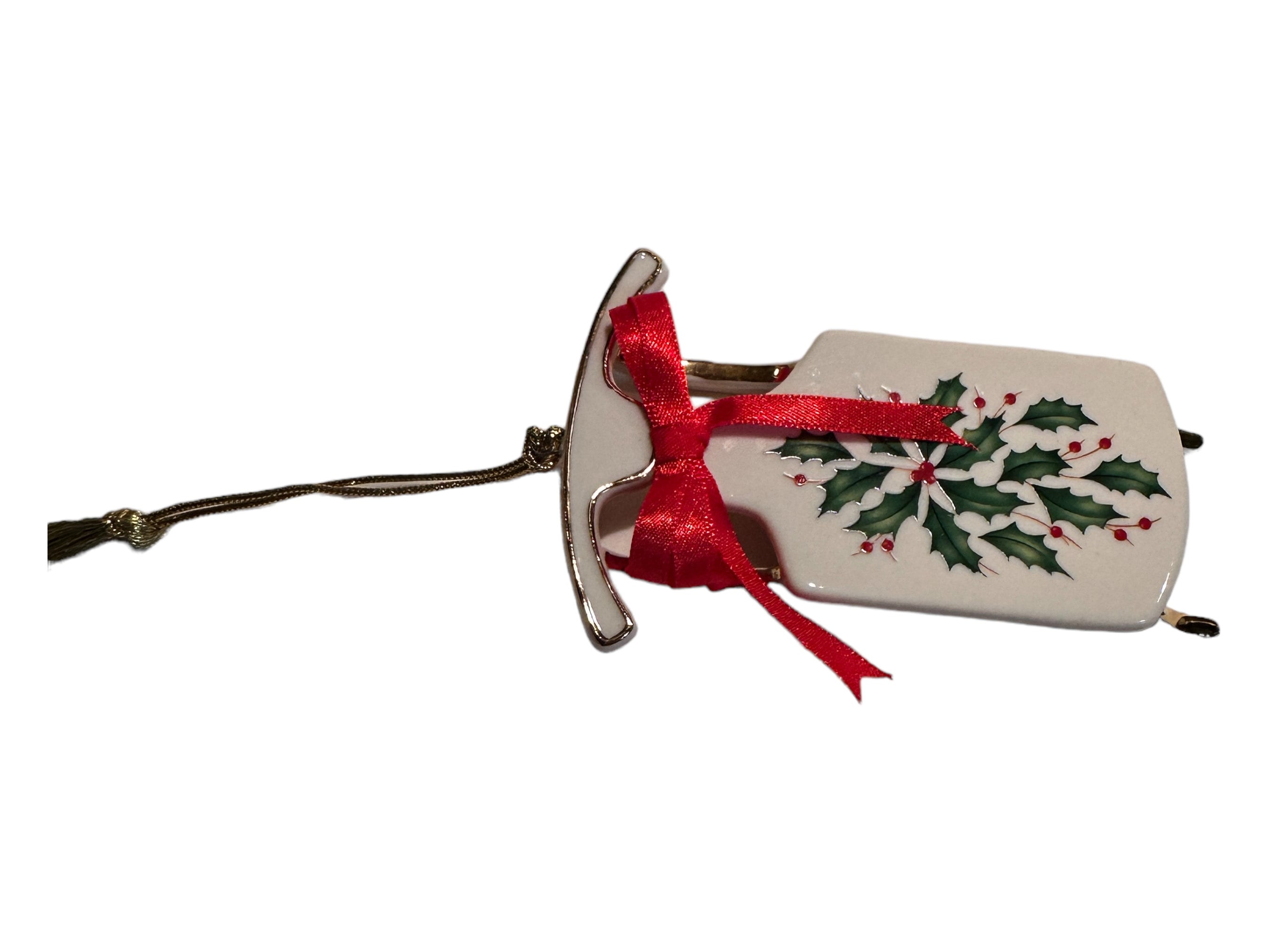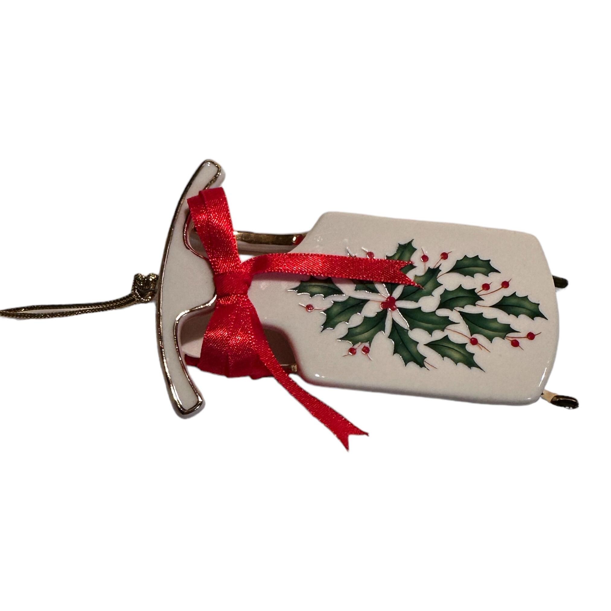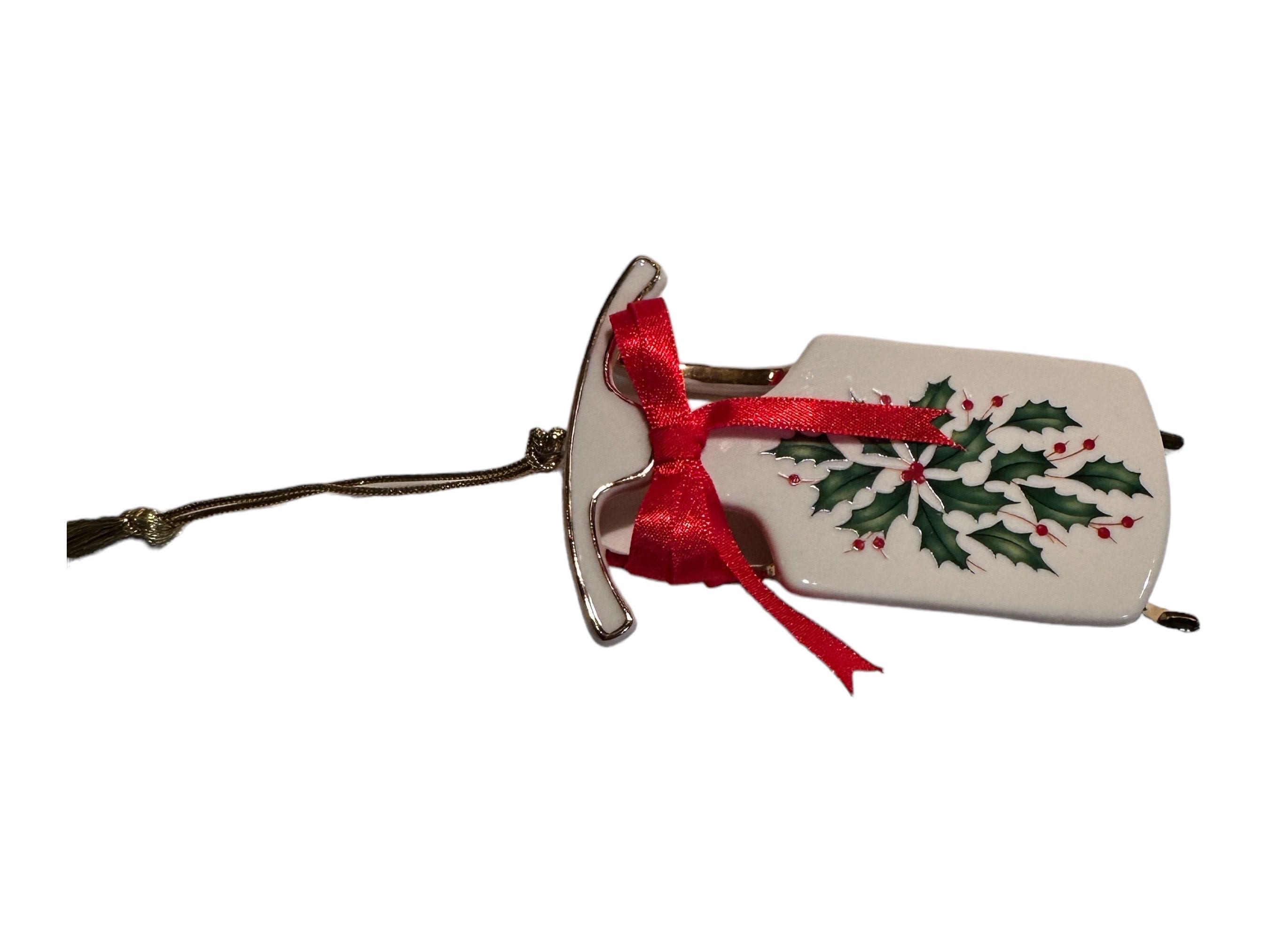 * Exquisite 4.5 inch Lenox porcelain sleigh ornament, new in box, featuring elegant ivory design with festive red and green holiday patterns