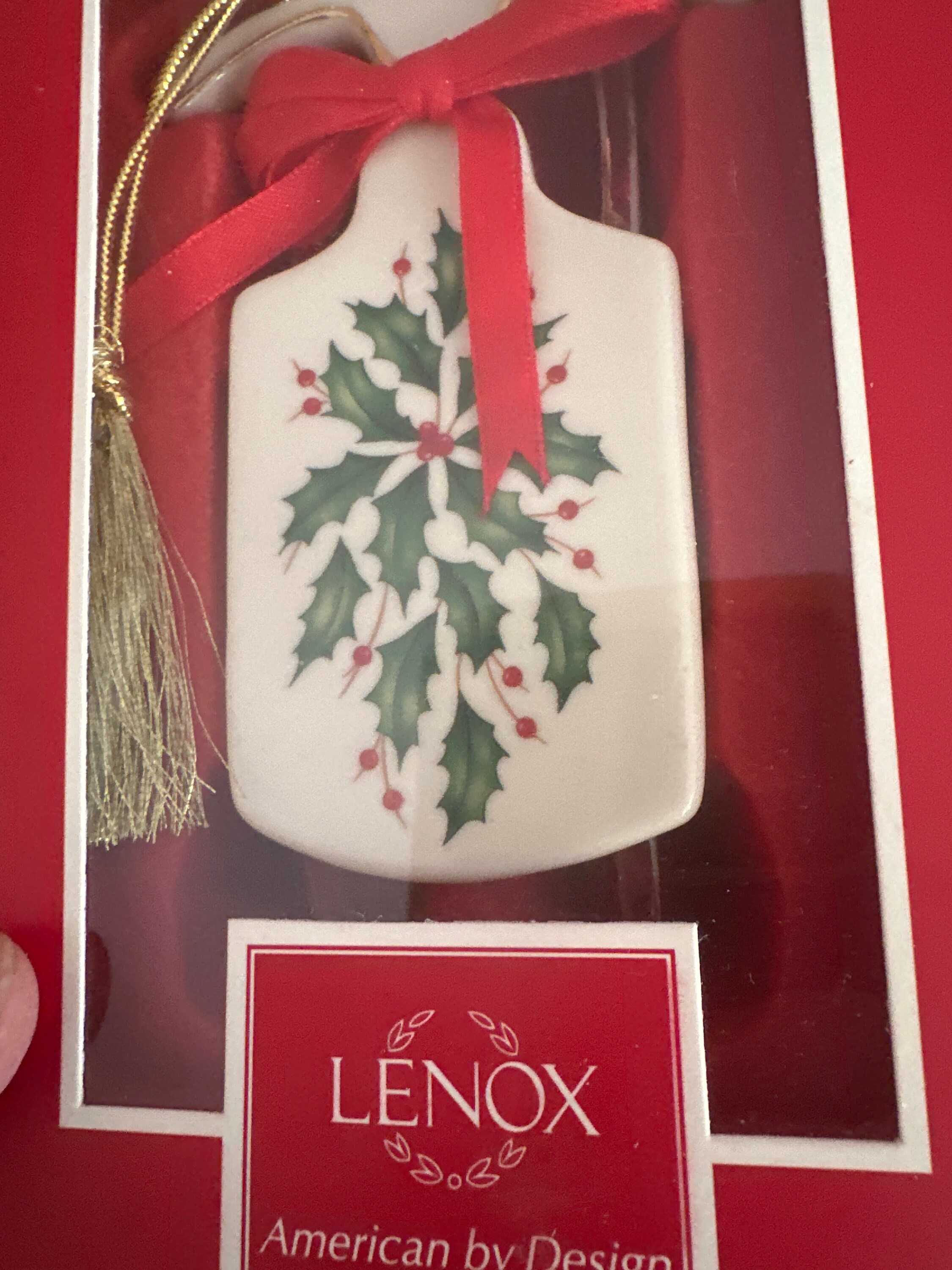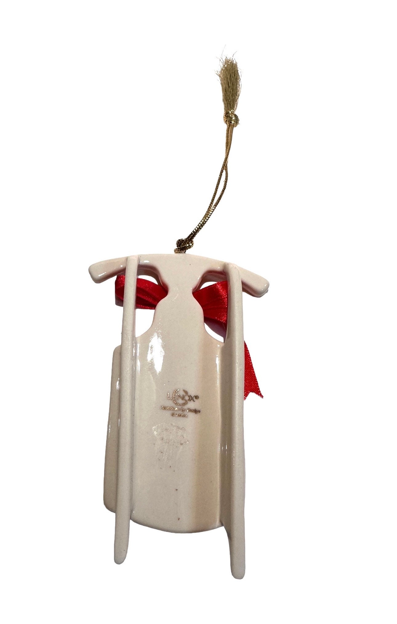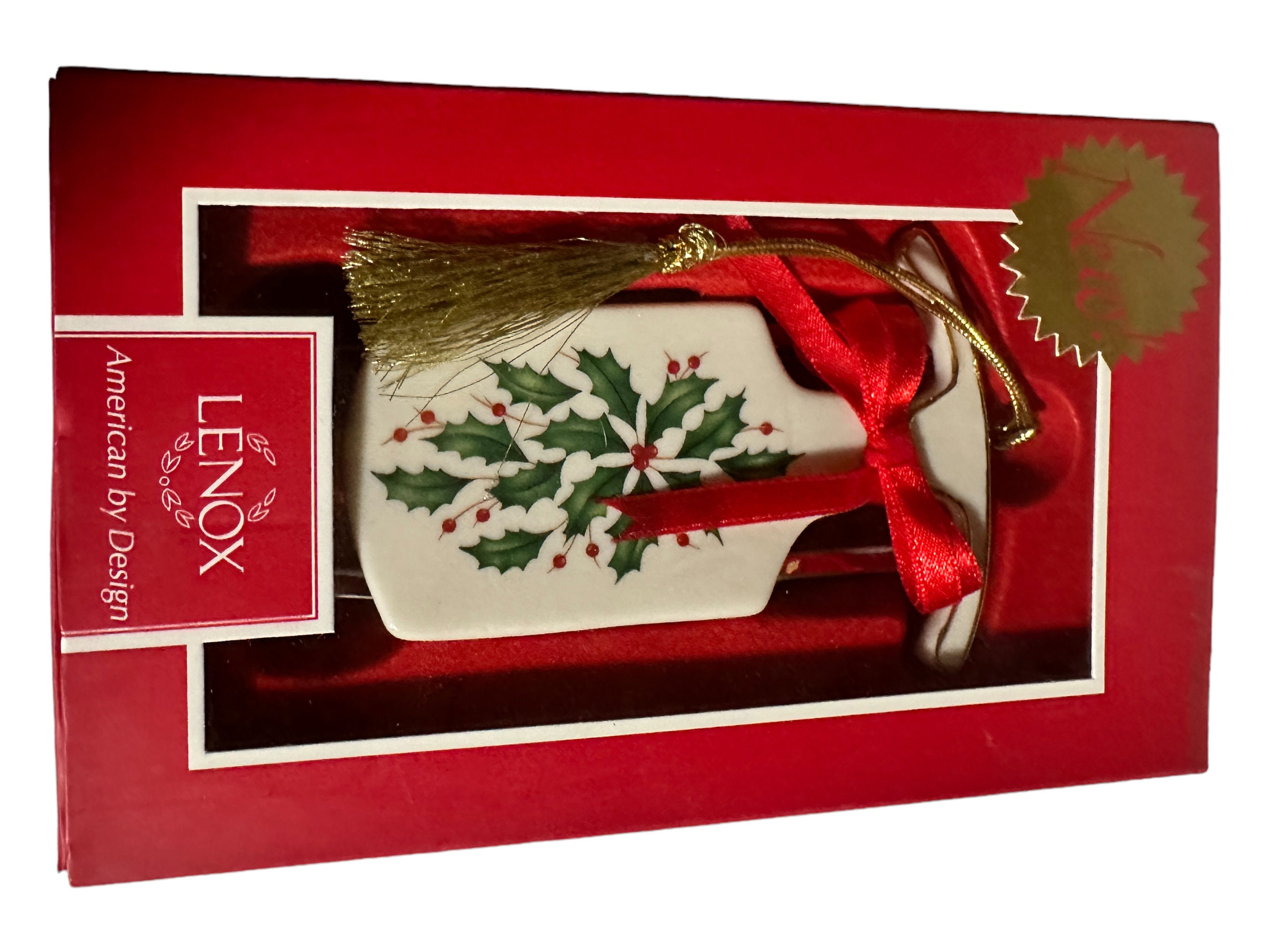 * Exquisite 4.5 inch Lenox porcelain sleigh ornament, new in box, featuring elegant ivory design with festive red and green holiday patterns