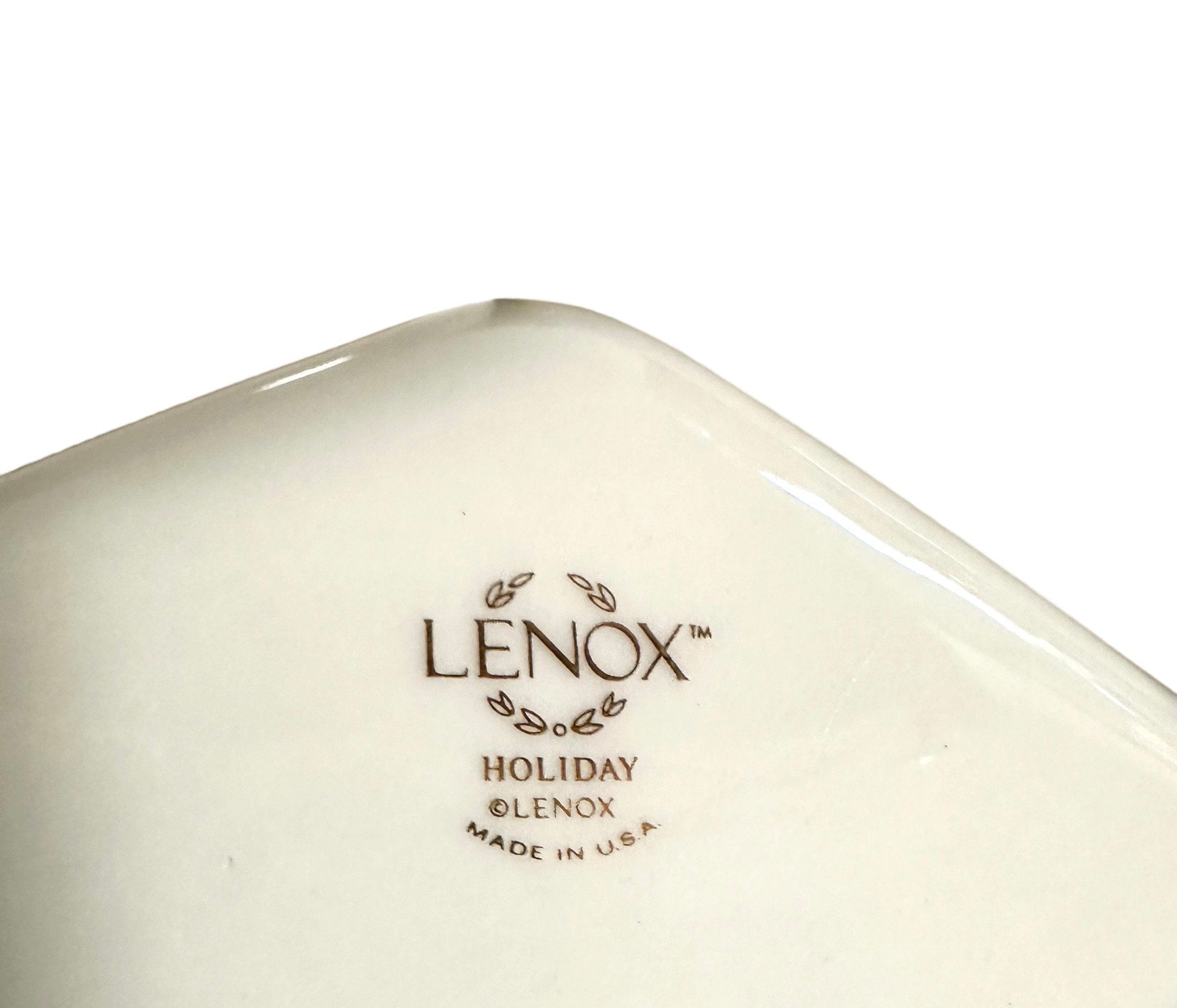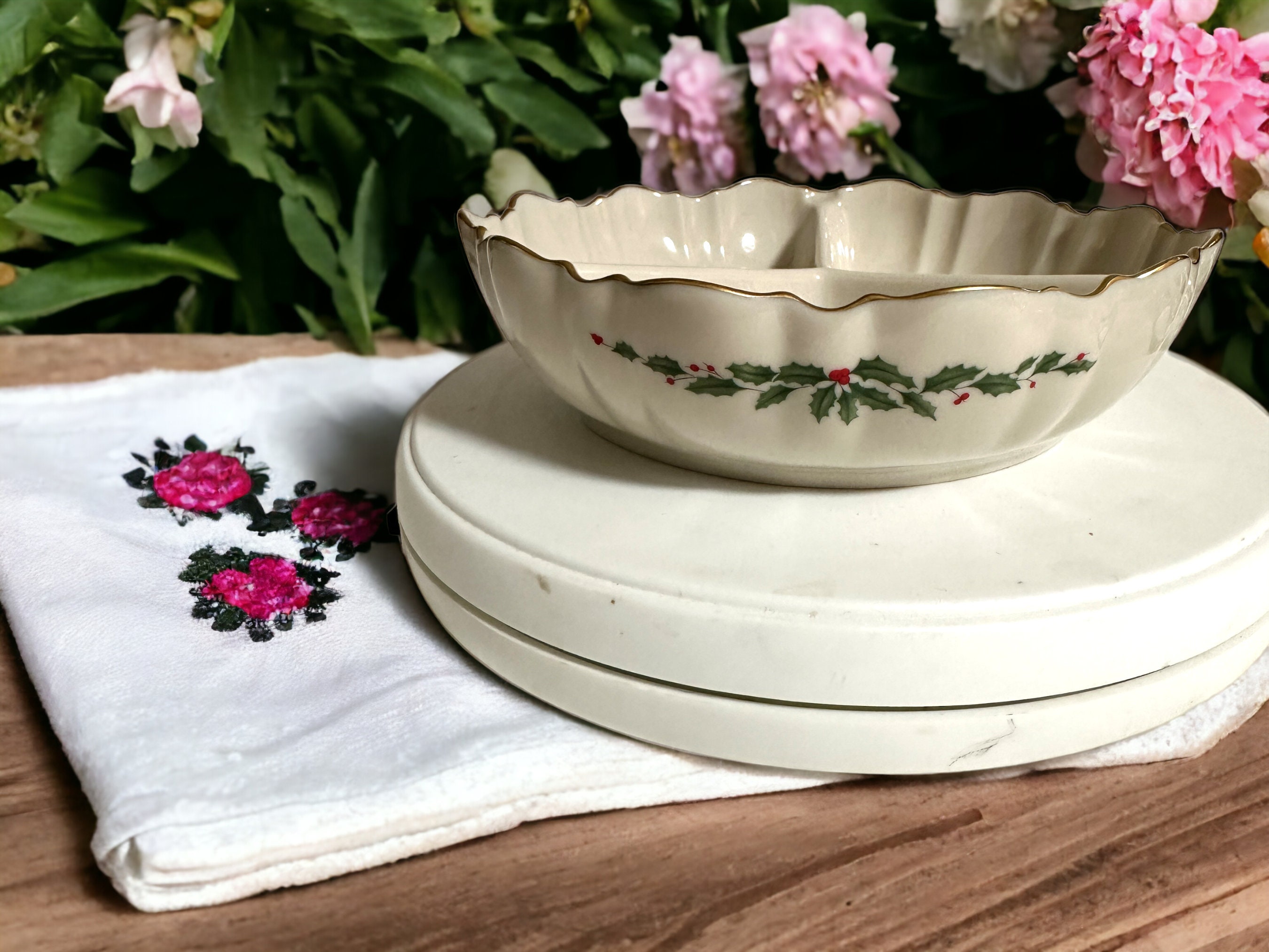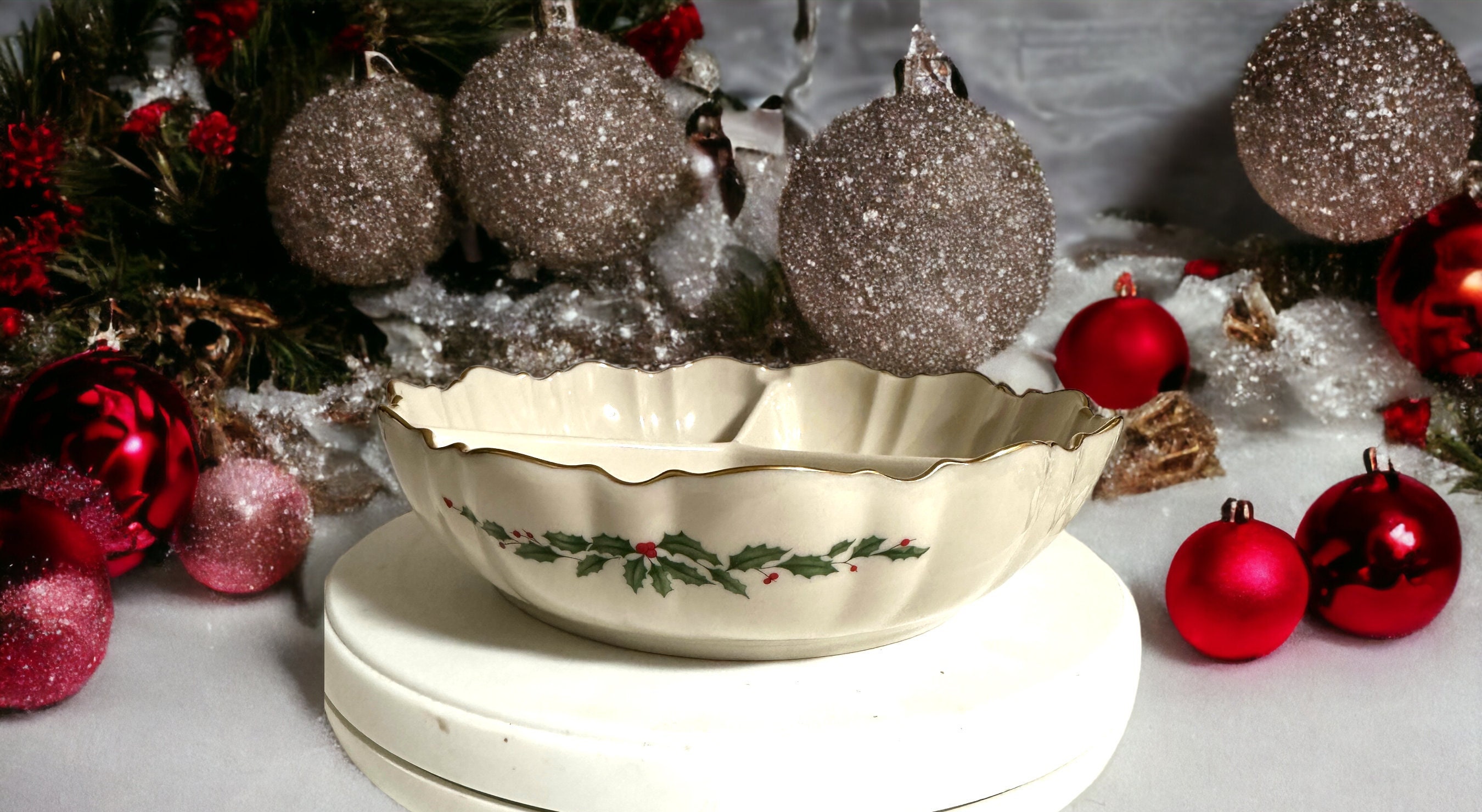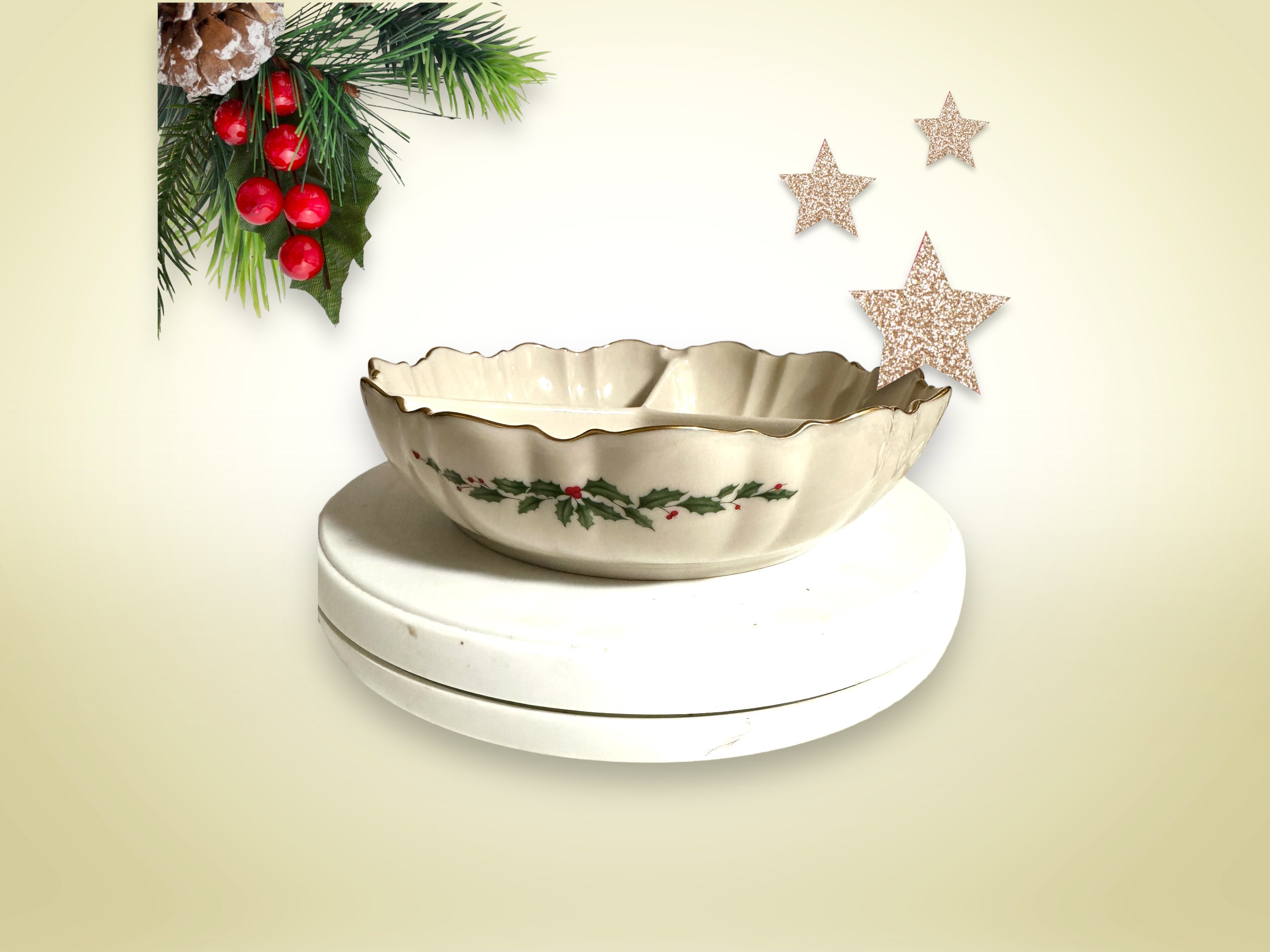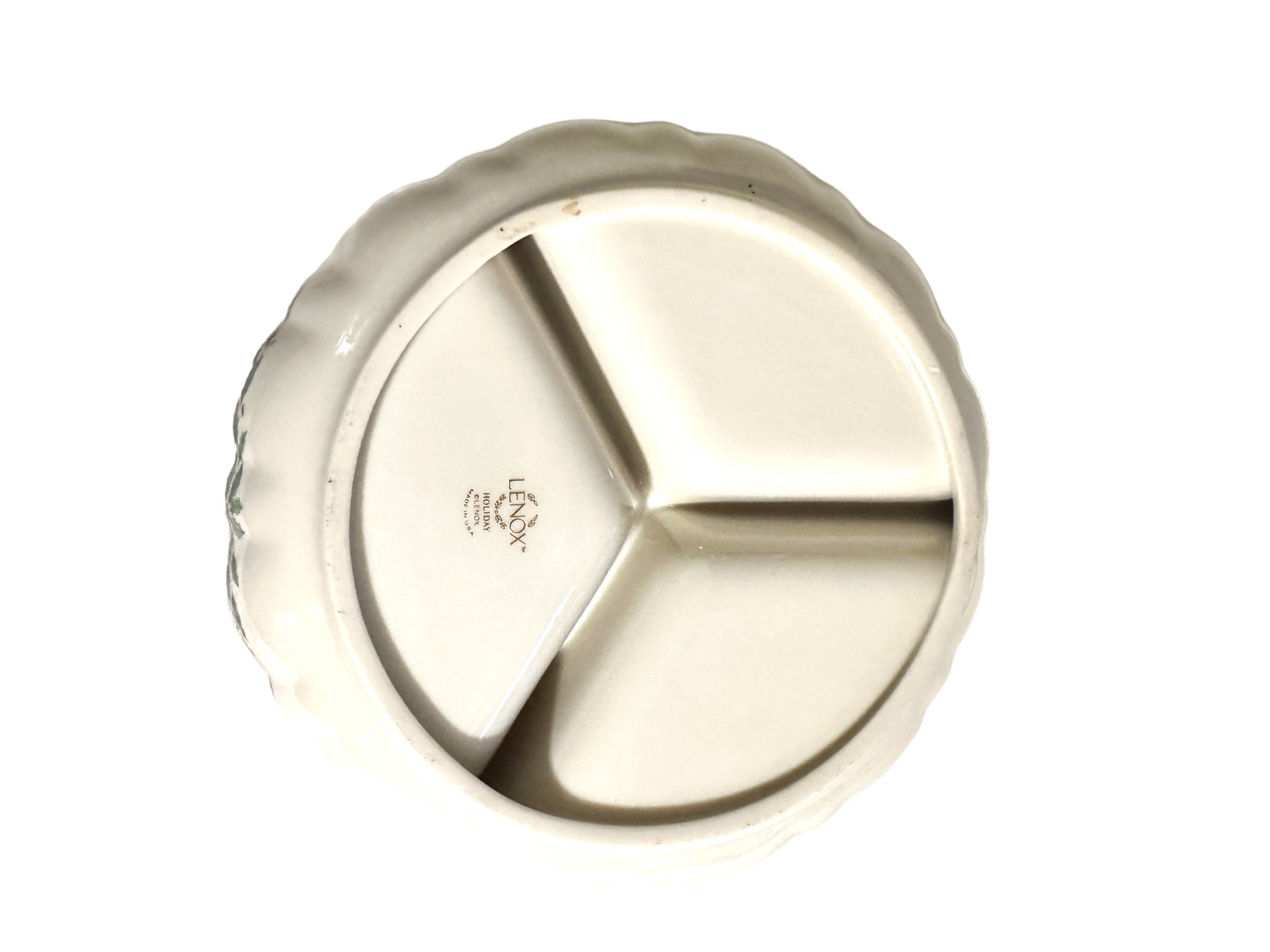 Christmas Lenox China holiday three-part divided bowl with a green holly design is a new item. It measures 7.75 inches in diameter and 2 inches high. It has three separate sections. This holly-berry ivory-colored dish is cream-colored porcelain. Unused item.