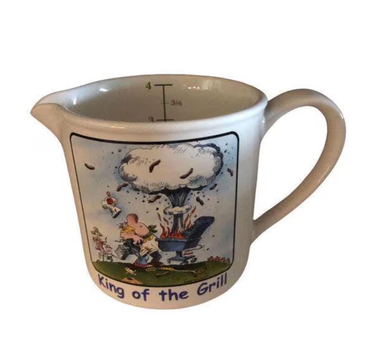 Elevate your grilling game with our charming Gary Patterson Porcelain Grill Measuring Cup, featuring a playful clay design that brings personality and fun to your kitchen. This 4-cup measuring cup is not just a practical tool for precise cooking; it also makes a hilarious gift for Dad, celebrating his "King of the Grill" status—perfect for adding a dash of humor to your outdoor gatherings!Looking for a special grill gift for someone special on your list? Something that is vintage and humorous at the same time?