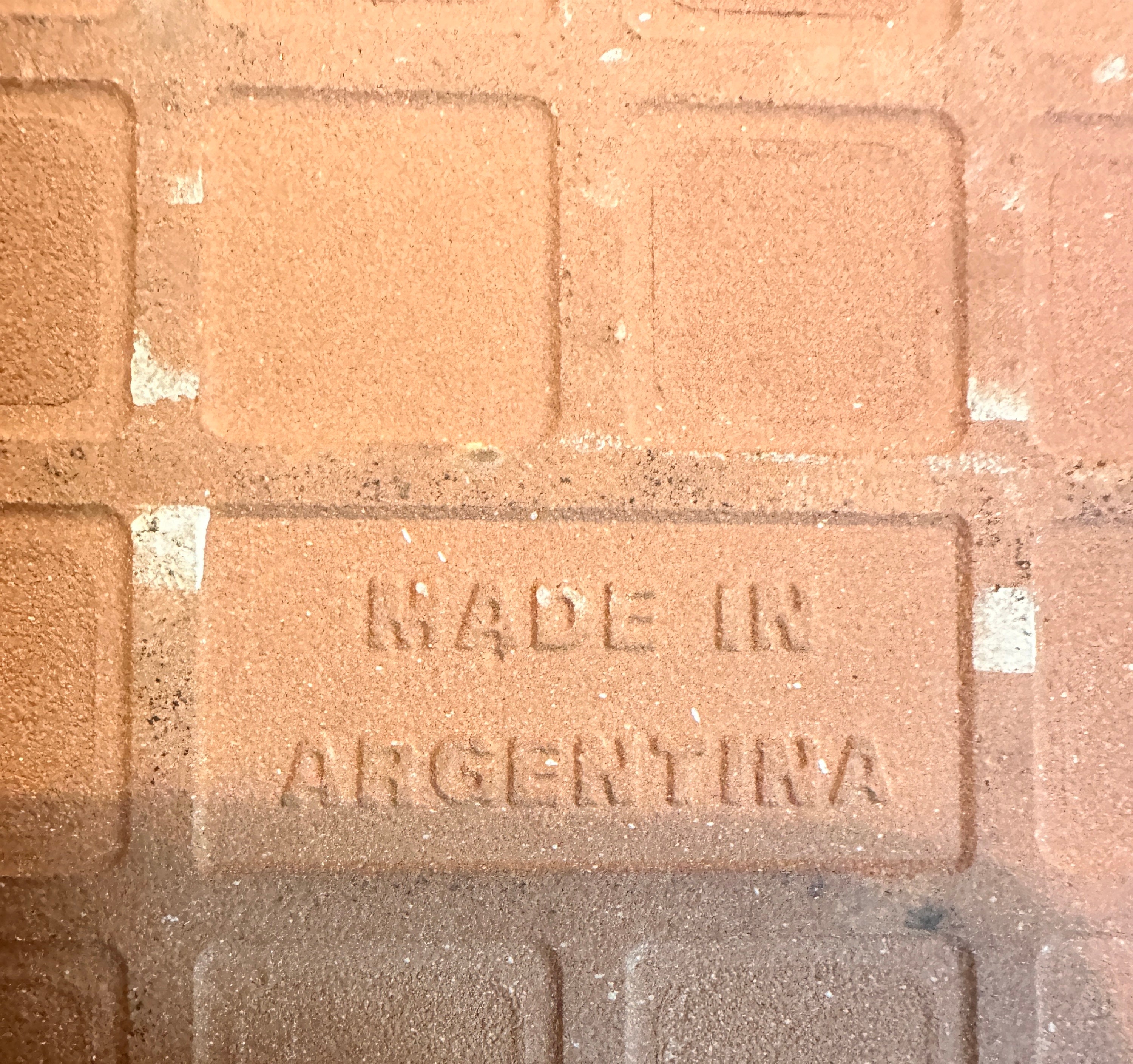 This is an 8 x 6.5 inch hand painted ceramic art tile from Argentina. It features a blue and yellow floral border surrounding colorful homes on a hilltop. It is in good vintage condition. There is some very minor paint loss at the bottom edge of the tile.