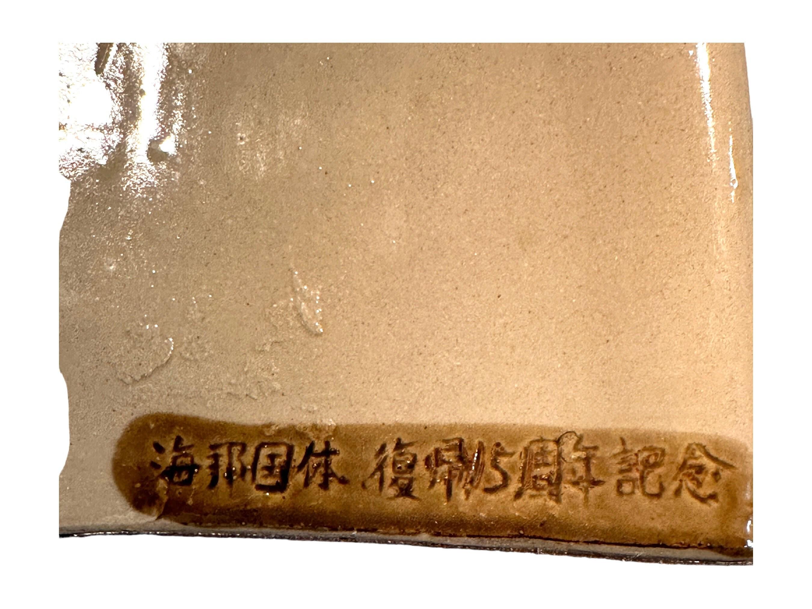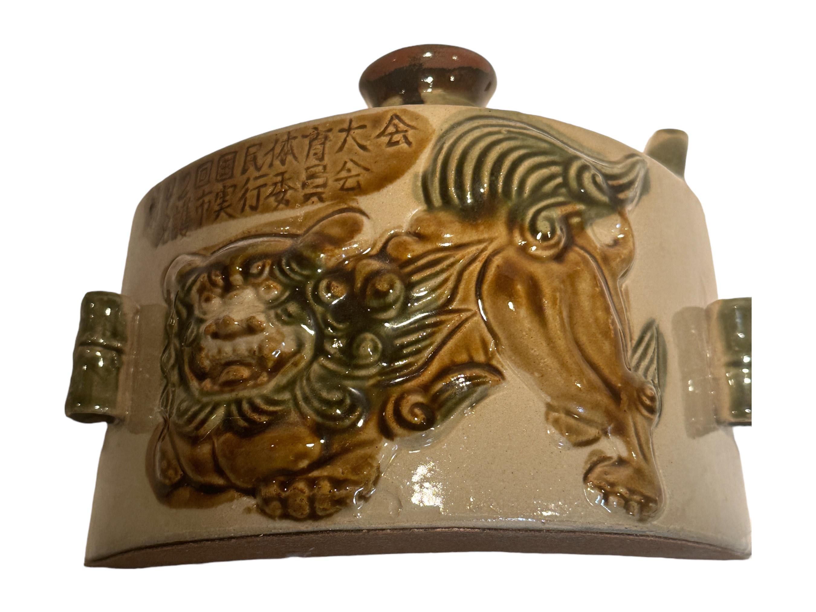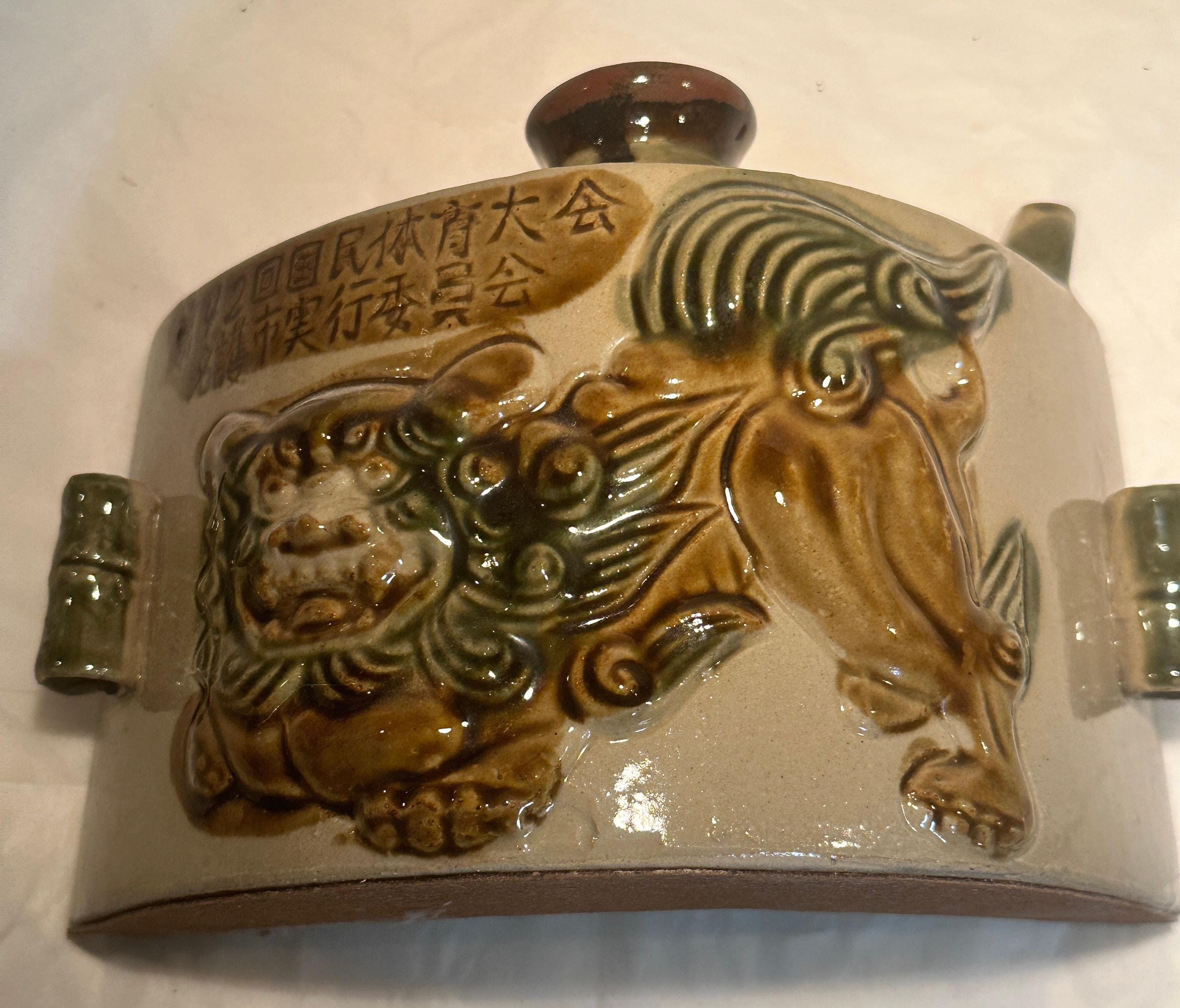 Okinawa Awamori Pottery Hip Flask: Japanese Foo Dog Decor