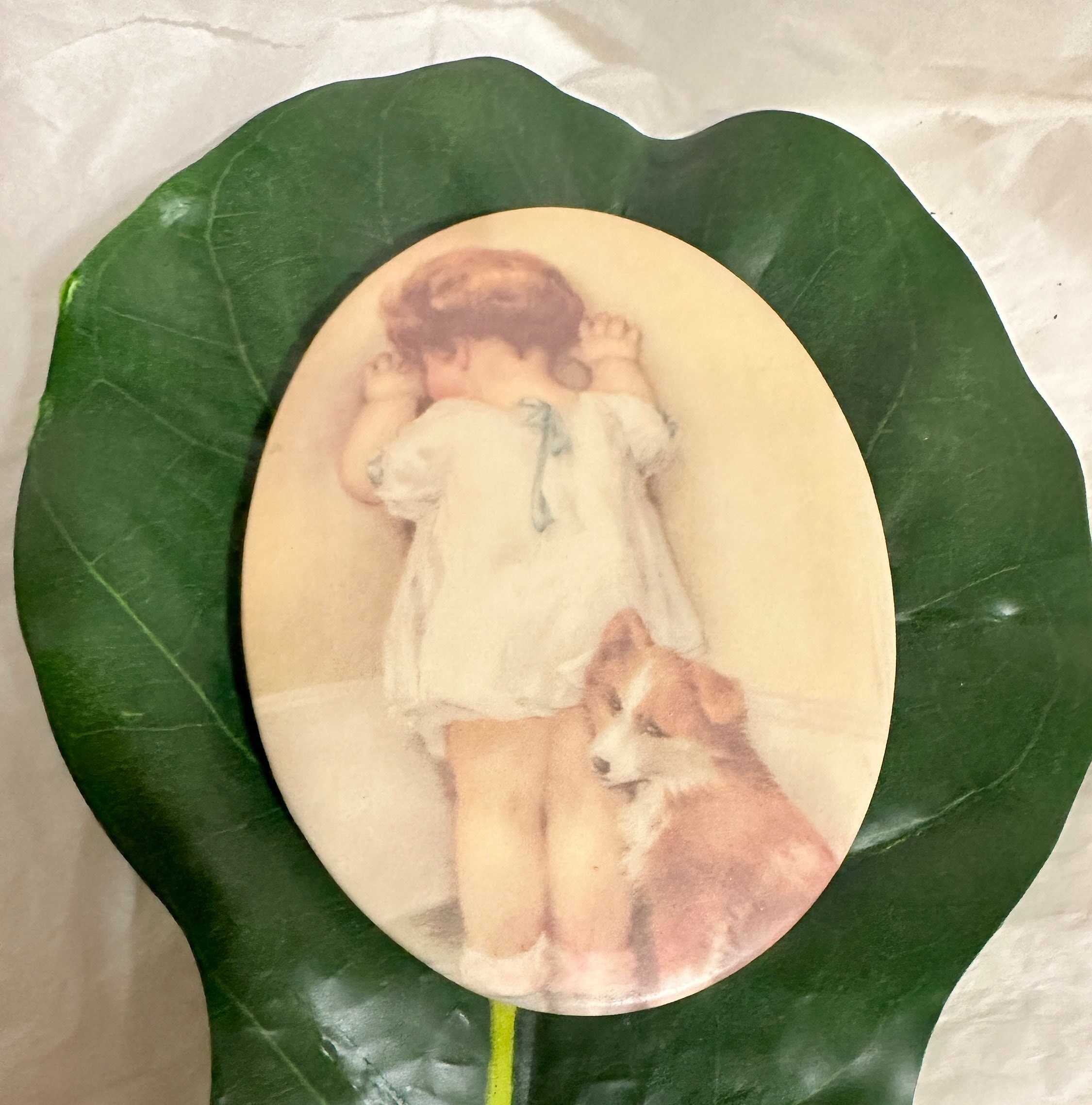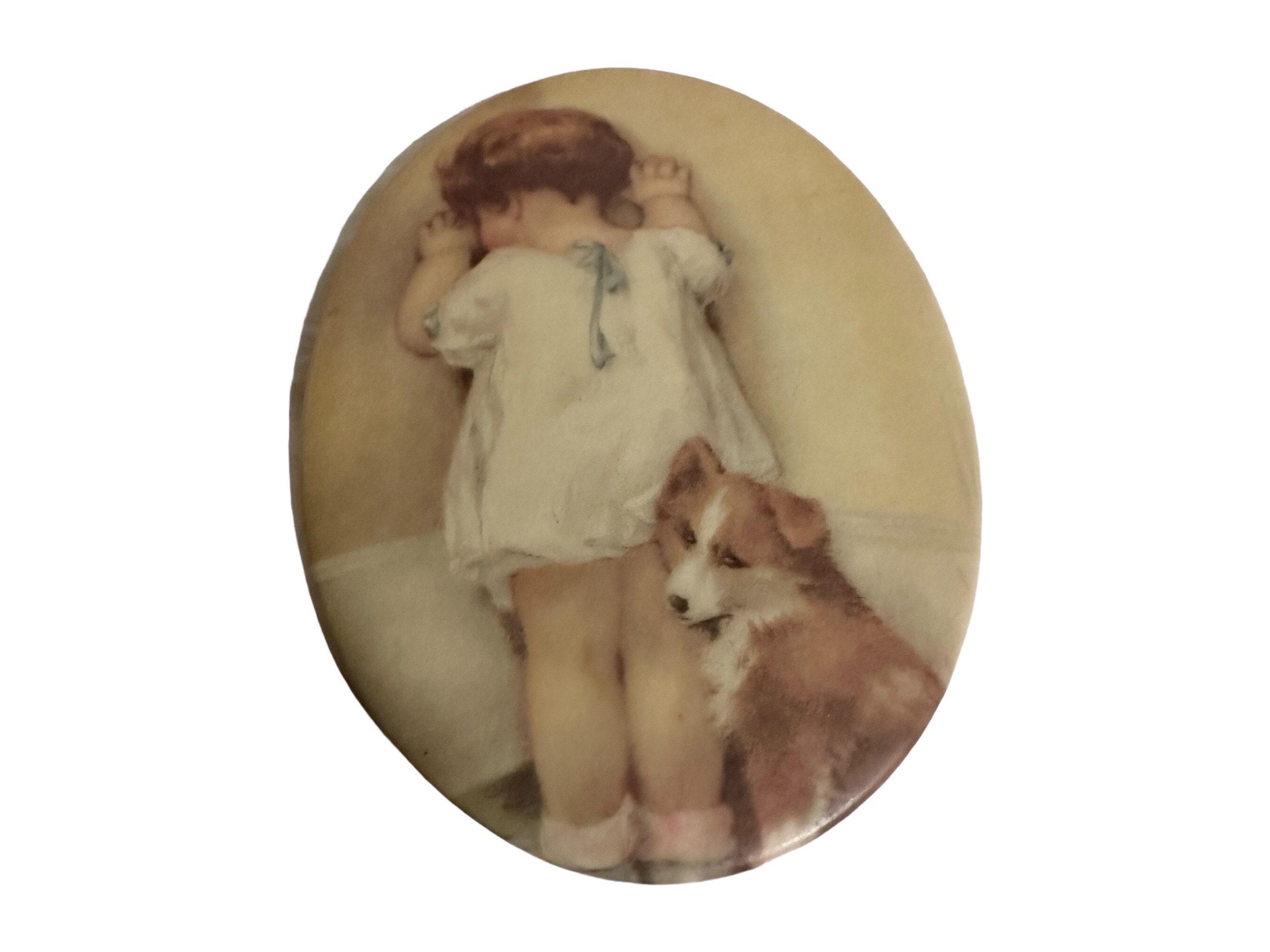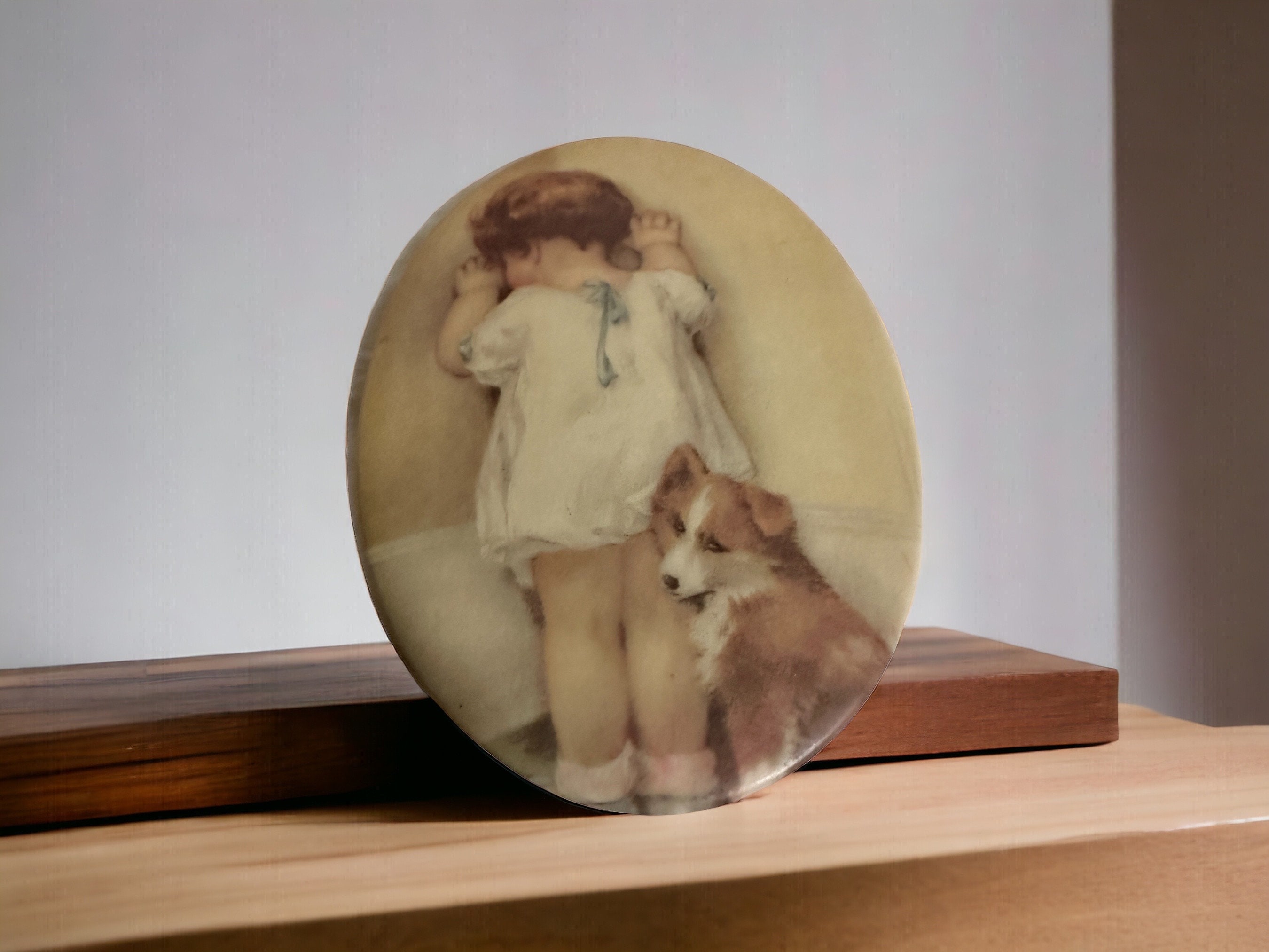 Add a touch of vintage charm to your nursery or home decor with this enchanting Nursery Art Oval Wall Plaque. Featuring a delightful scene from the Bessie Pease Gutmann series, "A Child's Best Friend," this ceramic wall decor showcases a mischievous girl in time out with her loyal dog by her side. Perfect as nursery art or a thoughtful gift for her, this vintage oval plaque brings warmth, personality, and nostalgic elegance to any space.