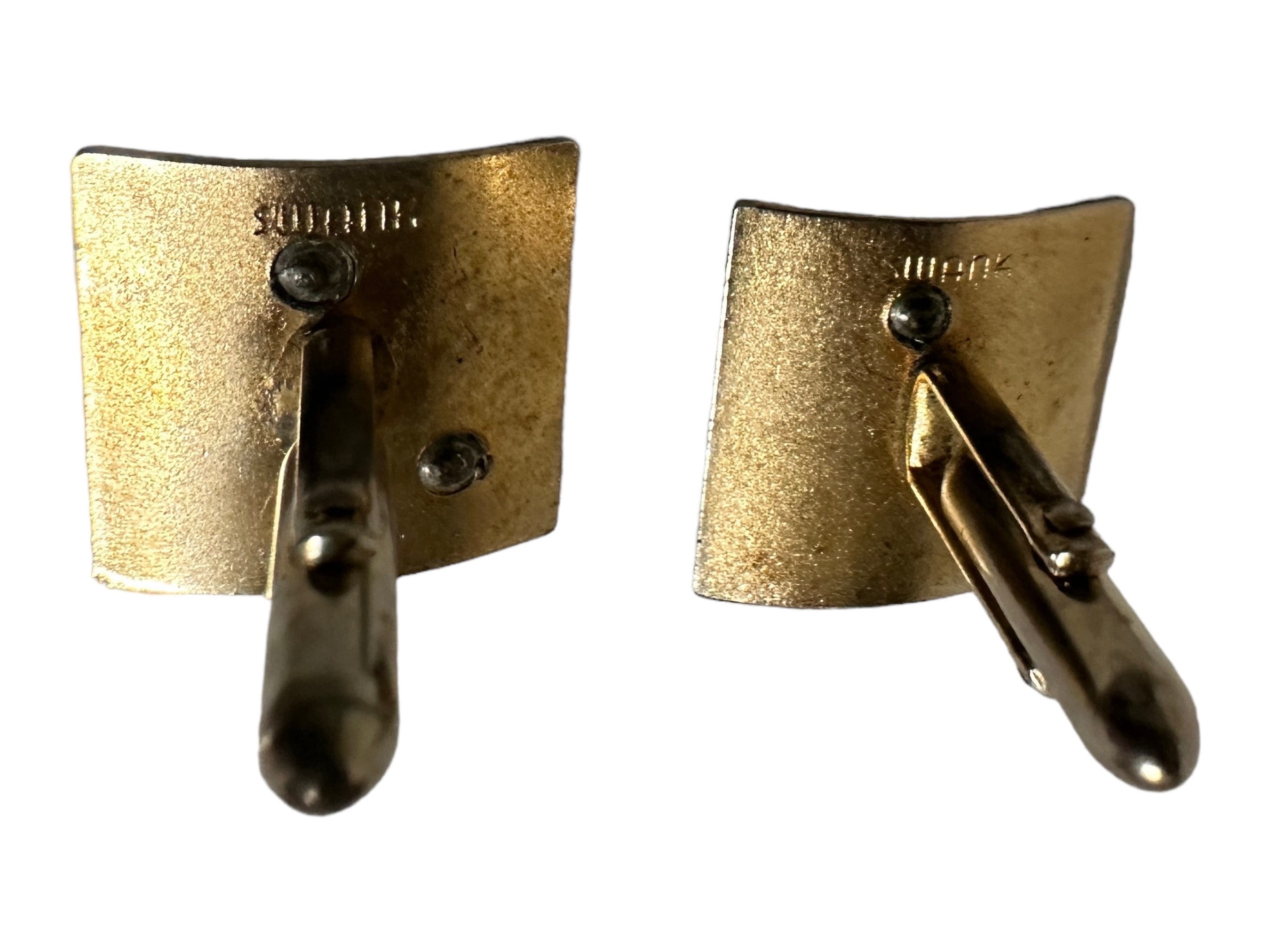Crafted from what appears to be brass and featuring a stunning gold-tone finish, these mid-century cufflinks showcase detailed spaniel dog heads, capturing their gentle expression and distinctive features. Inscribed with "Swank" on the inside, they speak to quality craftsmanship and timeless style. Measuring approximately 3/4" square, they are the ideal size to add subtle elegance and personality to your attire.