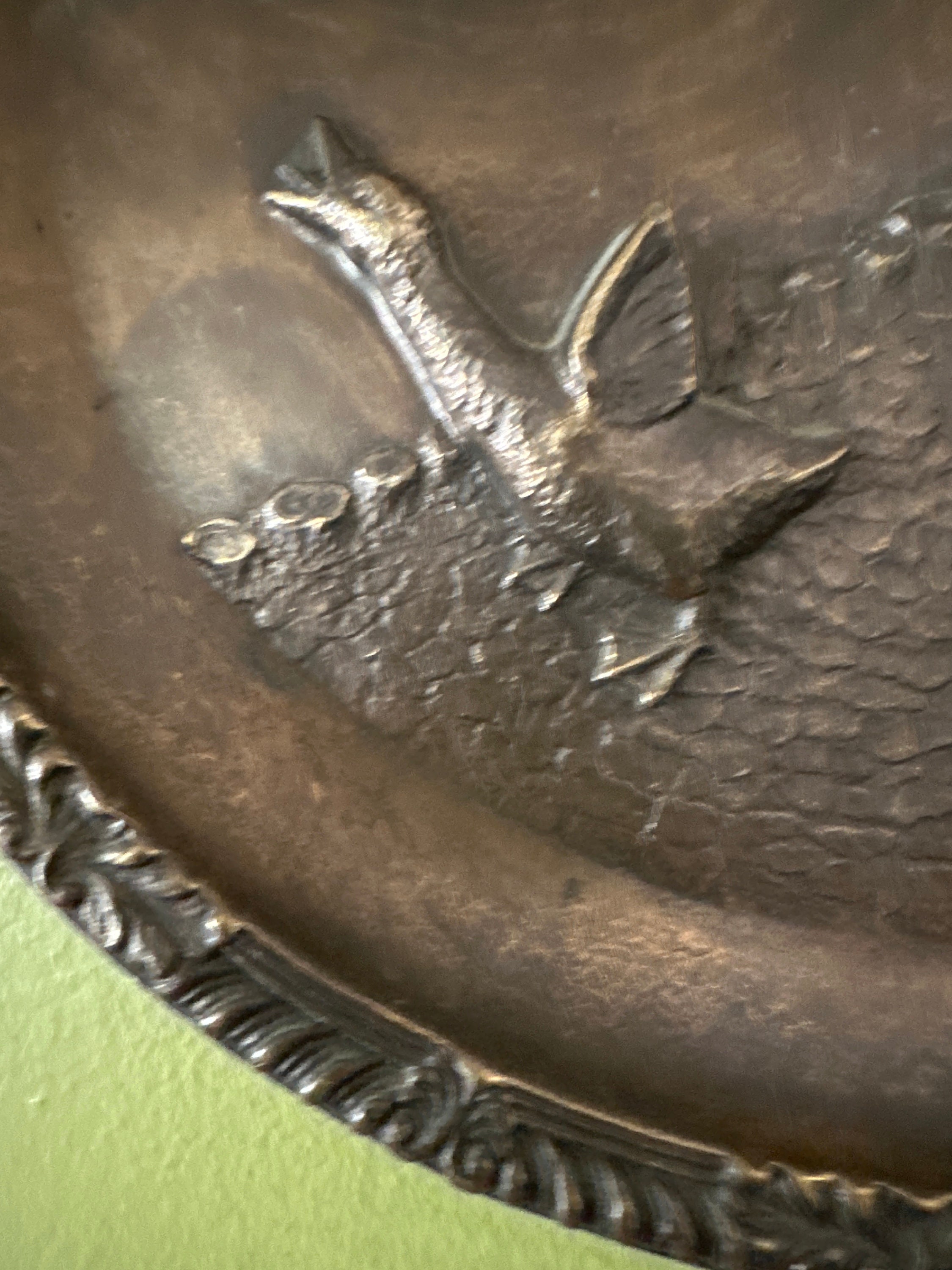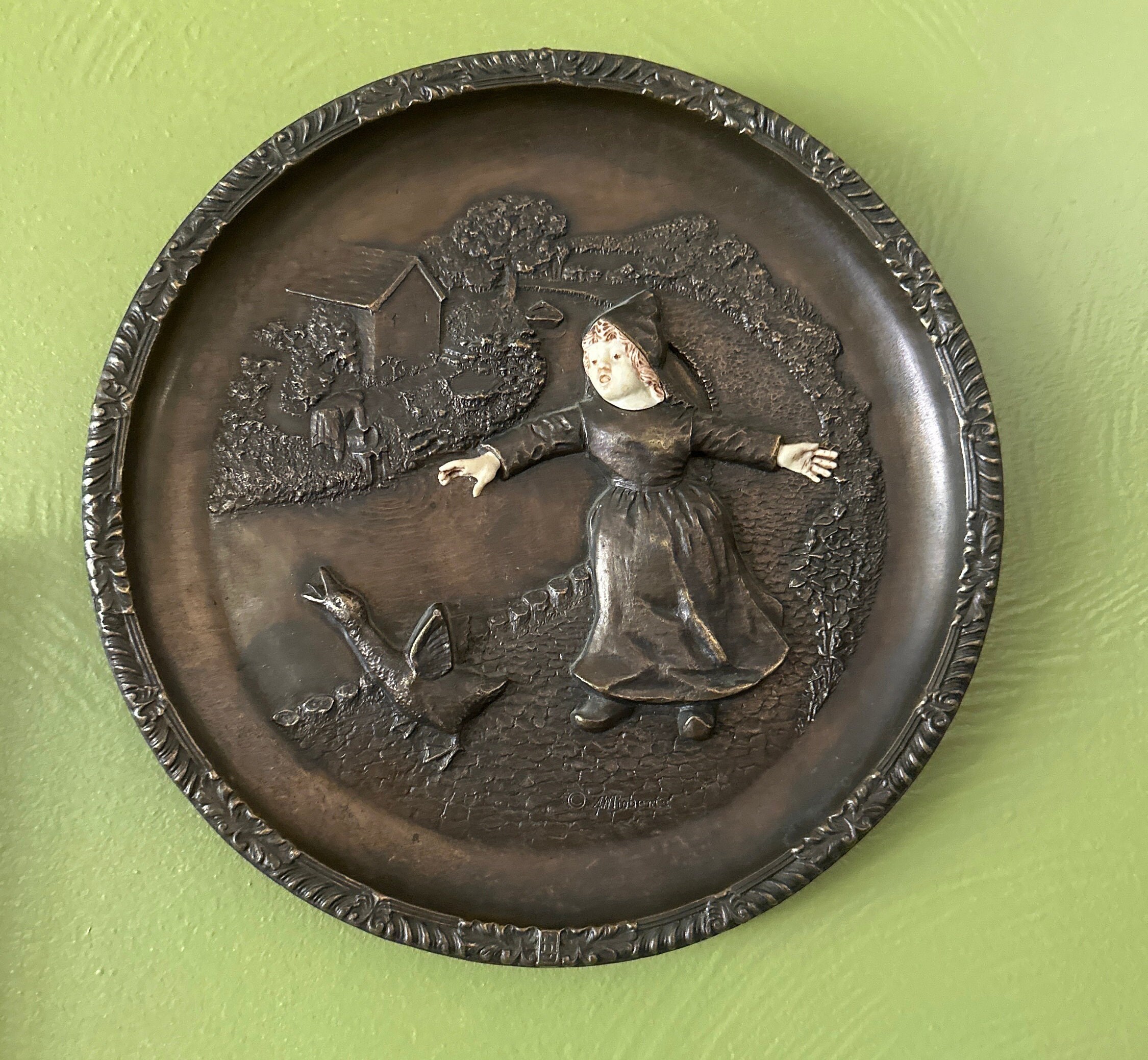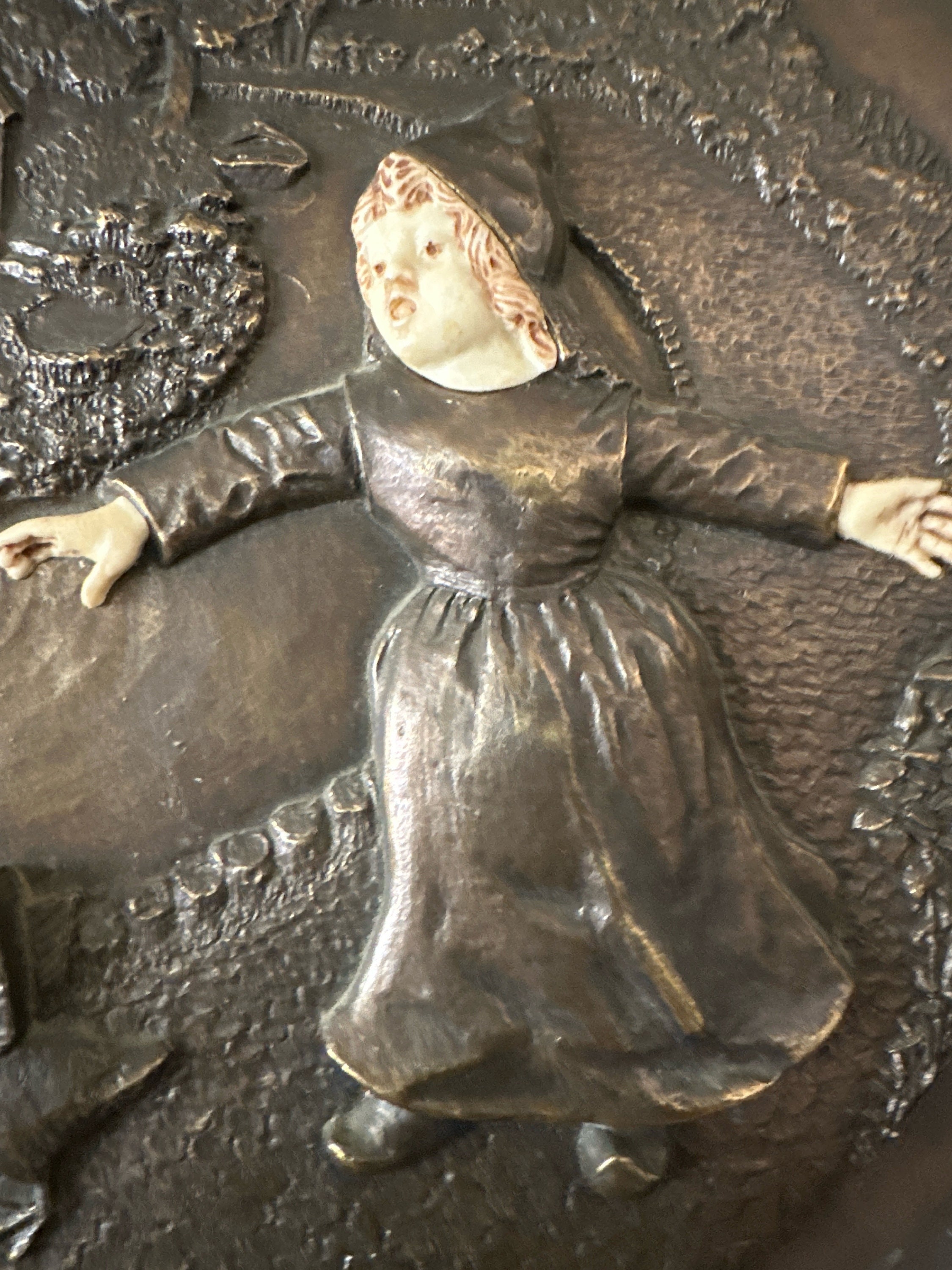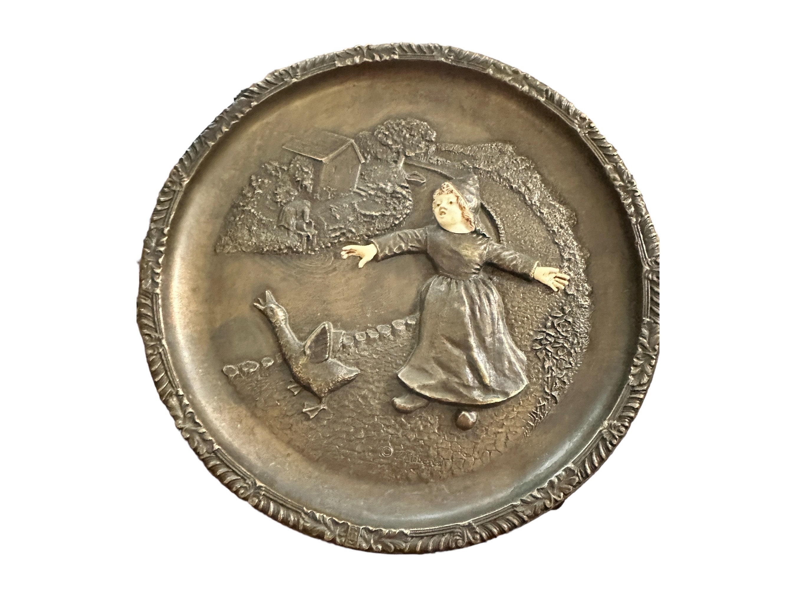 Vintage French Bronze Decorative Plate: Girl Chasing Goose, Incolay Ivory Relief