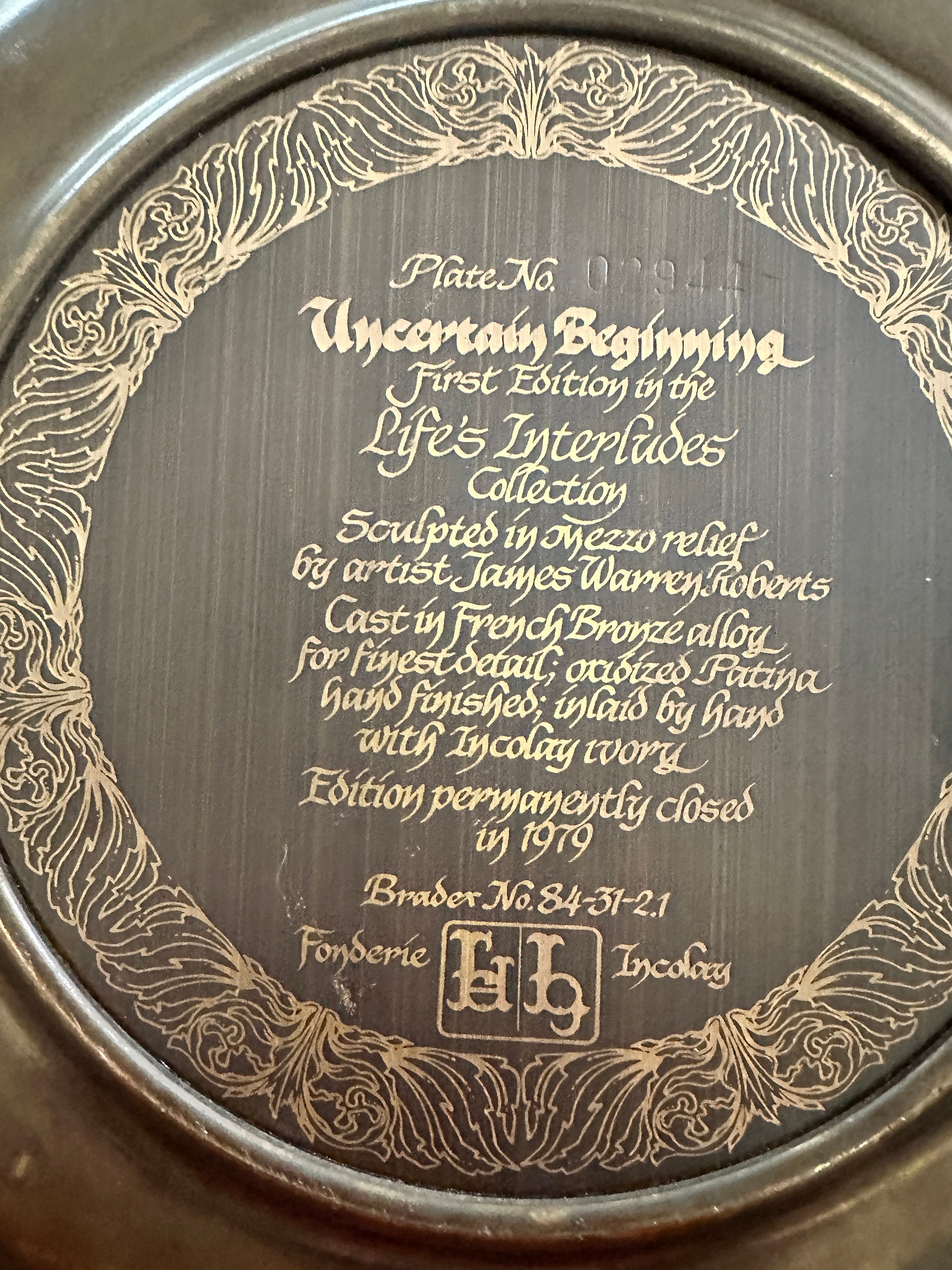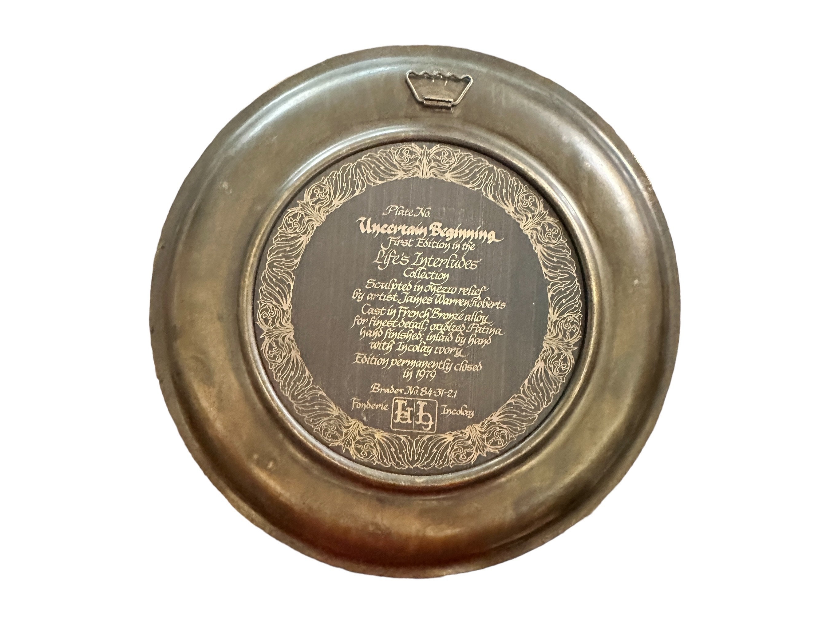 It is cast in a French olive bronze alloy and inlaid by hand with Incolay ivory. The stunning plate measures 10 inches in diameter. The title of the plate is "Uncertain Beginning" from the Life's Interludes Collection.