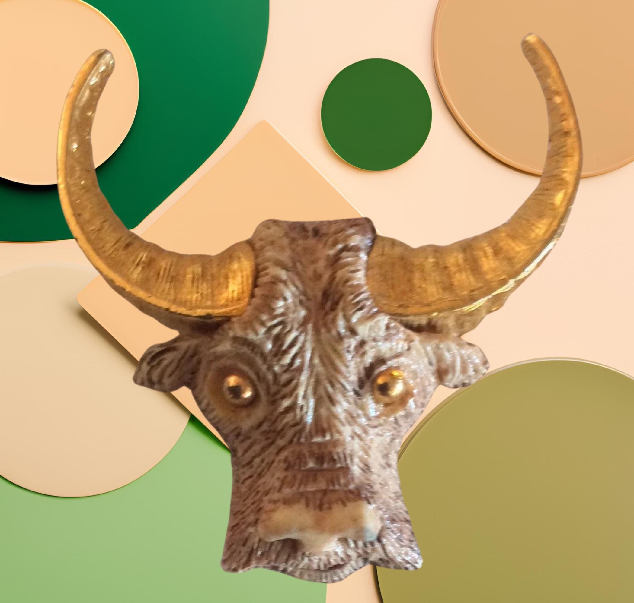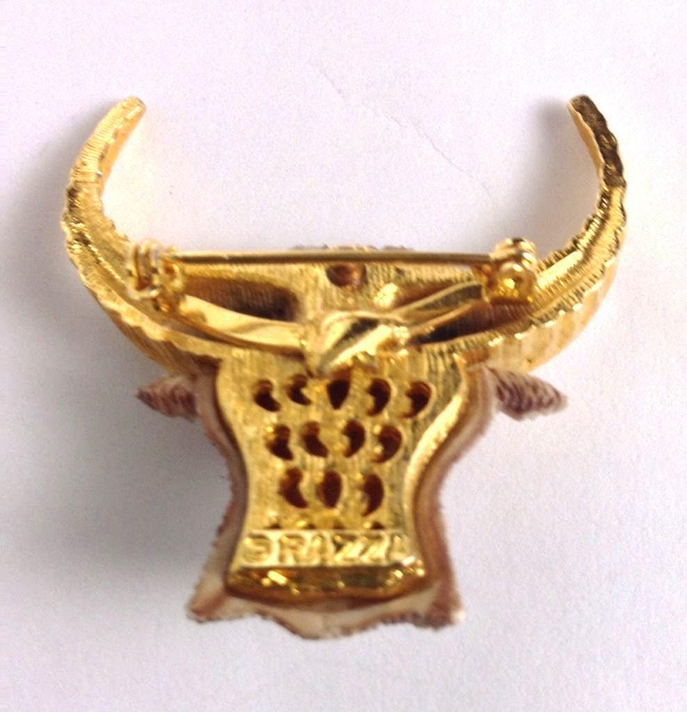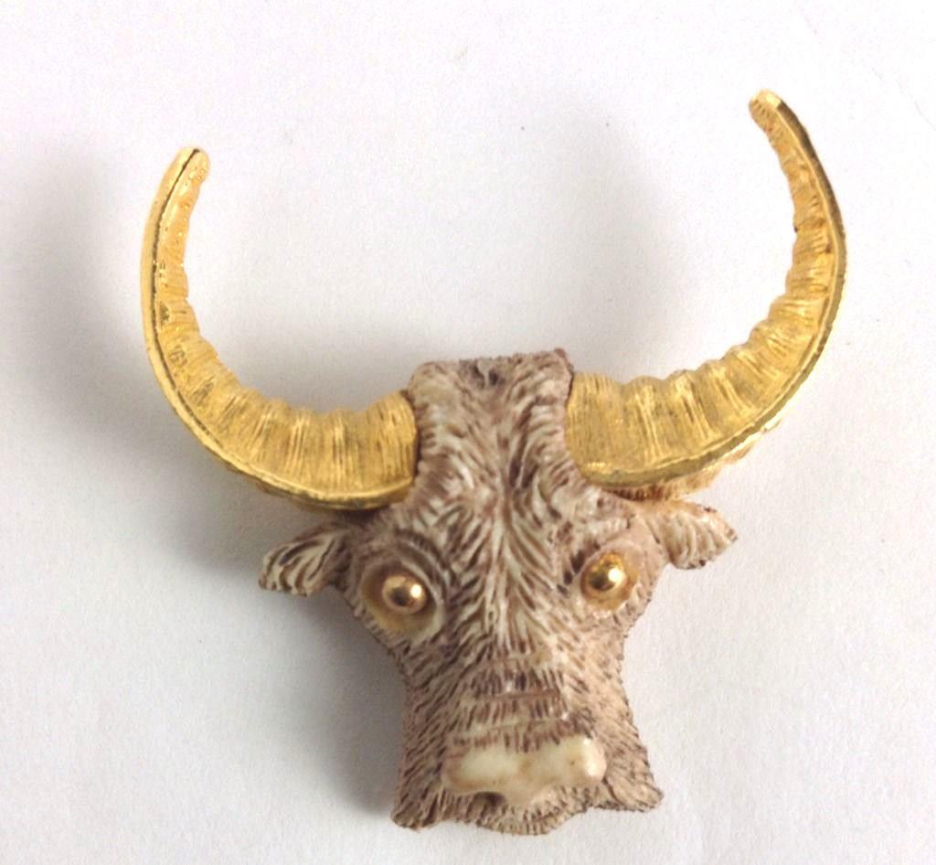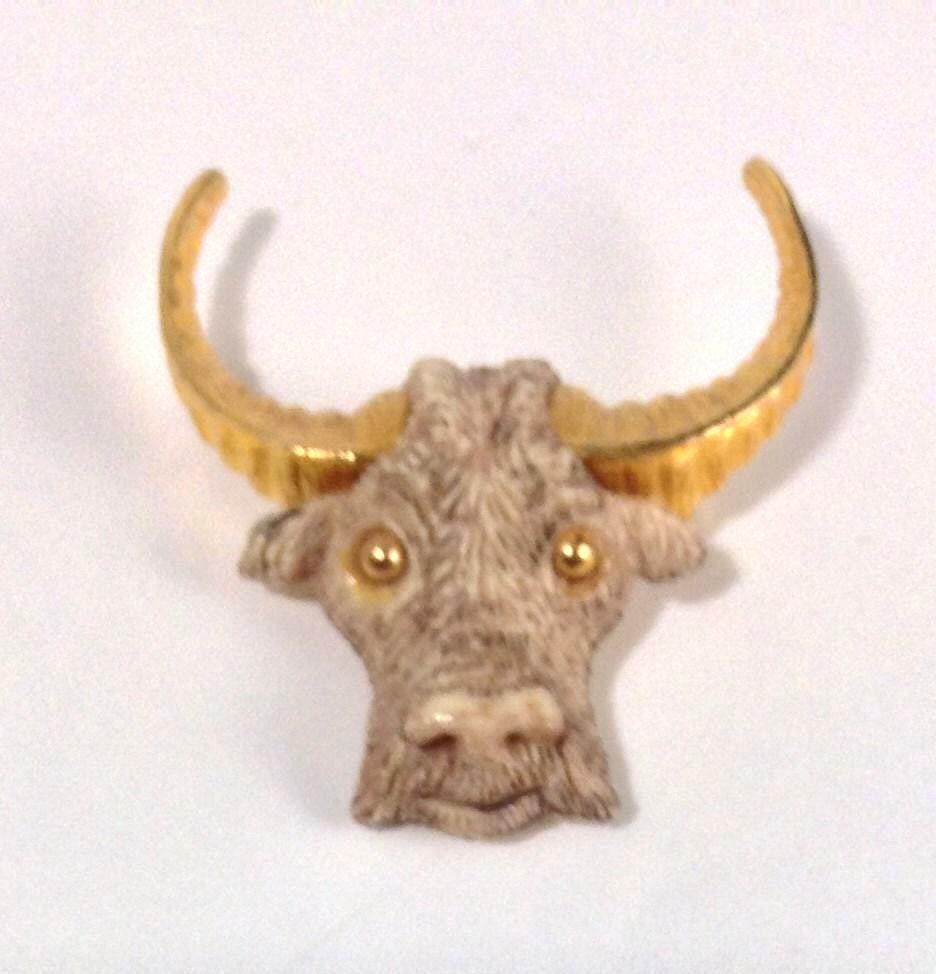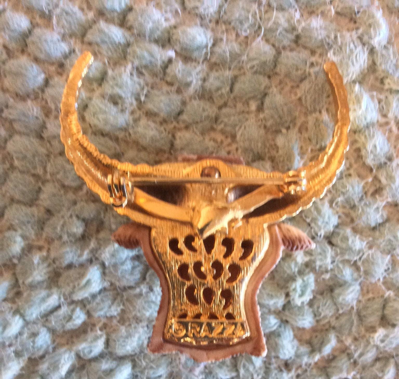 This is a vintage 1970s Razza bull brooch with gold-tone horns and gold-tone eyes. The sign of the zodiac "Taurus" pin is in very good condition. This is a 3D-textured resin with gold metal horns and a bull head. It is quite unusual. It measures 1.5" x 1.5".