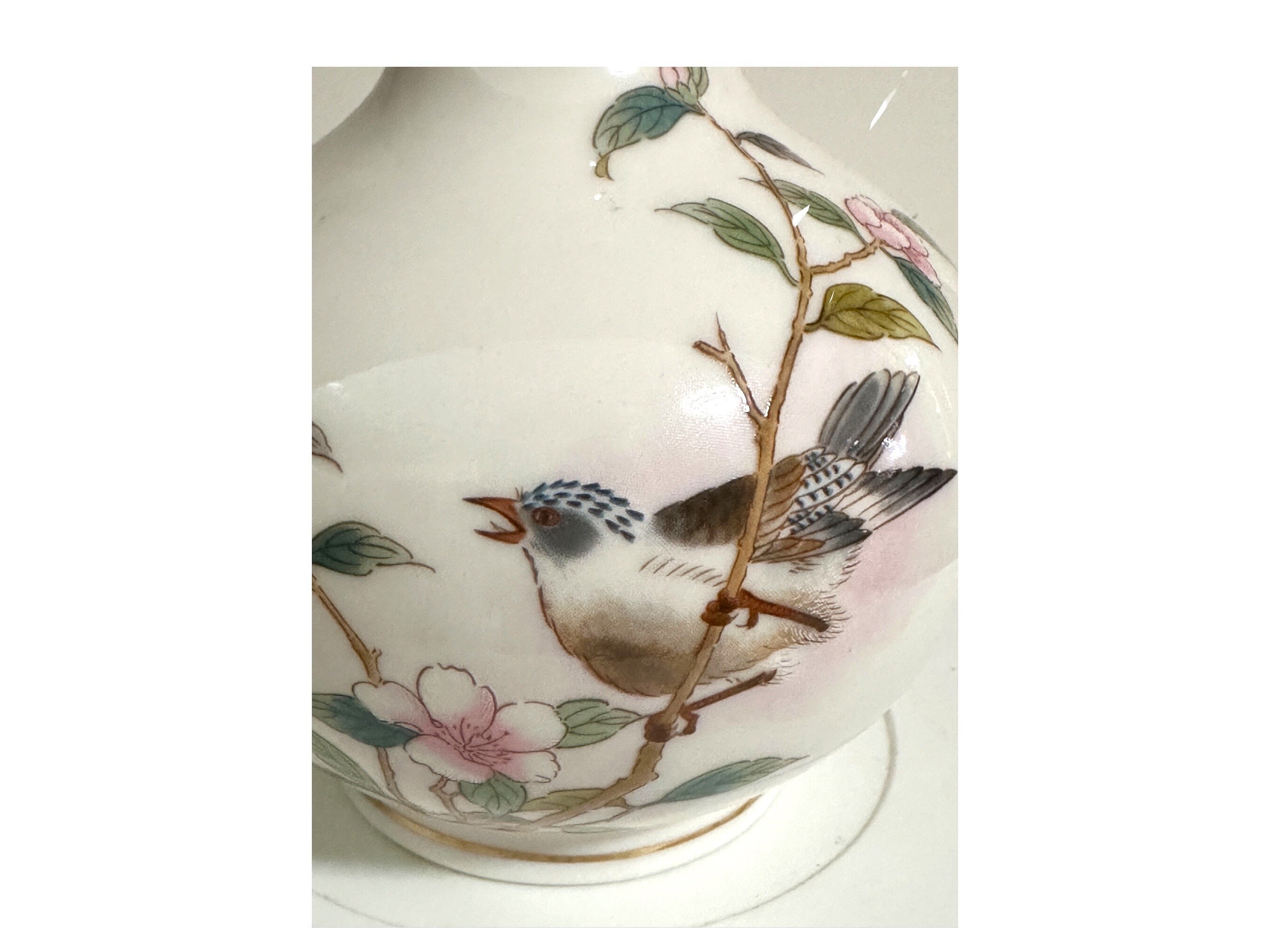 Decorated with gold trim on the rim. It features a bird on a floral cherry blossom branch. It is in excellent condition.