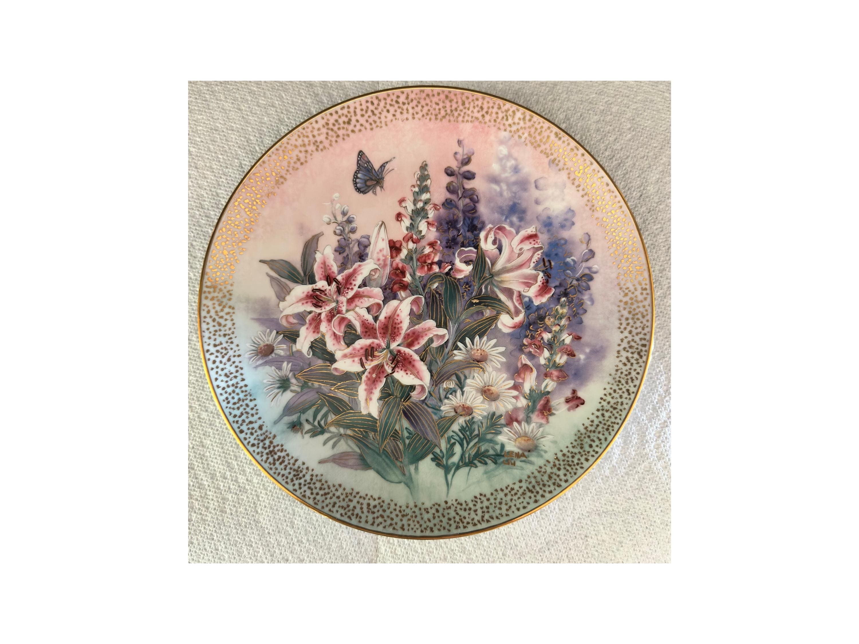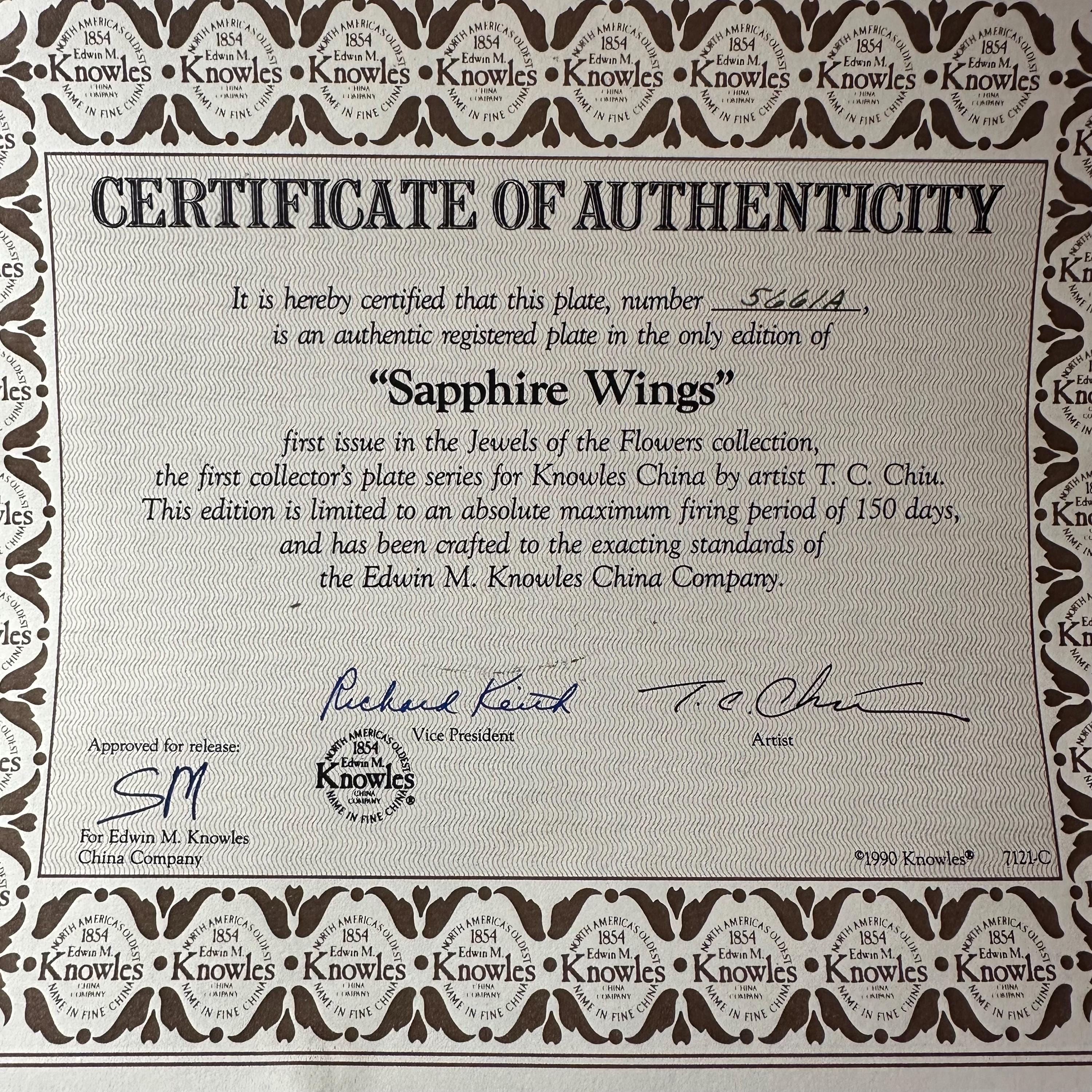 Beautiful Edwin M Knowles China limited edition by the artist Tan Chun Chiu fine china porcelain plate is called 'Sapphire Wings' from the 'Jewels of the Flowers' collection.