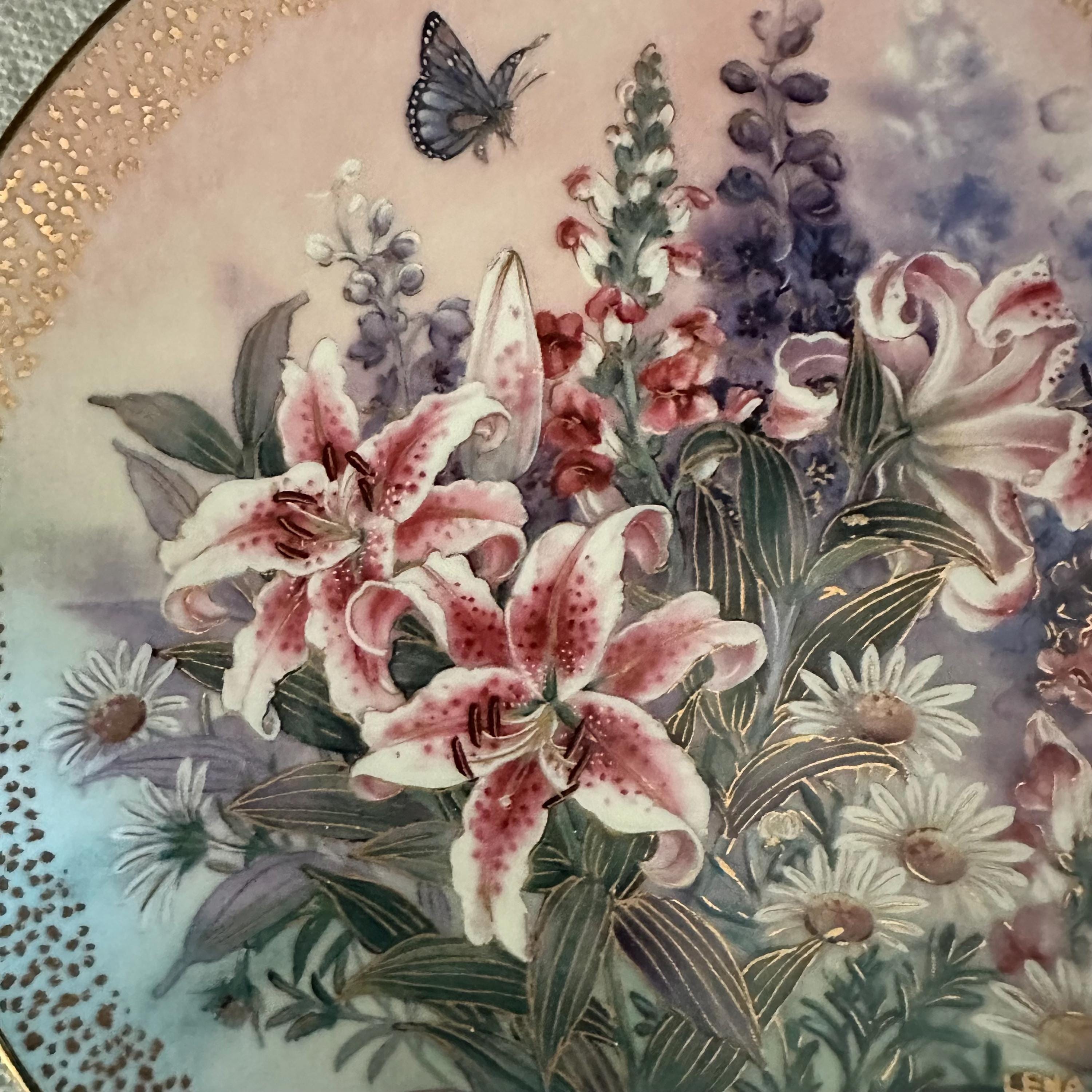 It is certified plate number 5661A. This beautiful wall hanging art features beautiful white iris flowers and pink blossoms. A butterfly floats above the flowers. The colors are pastels.