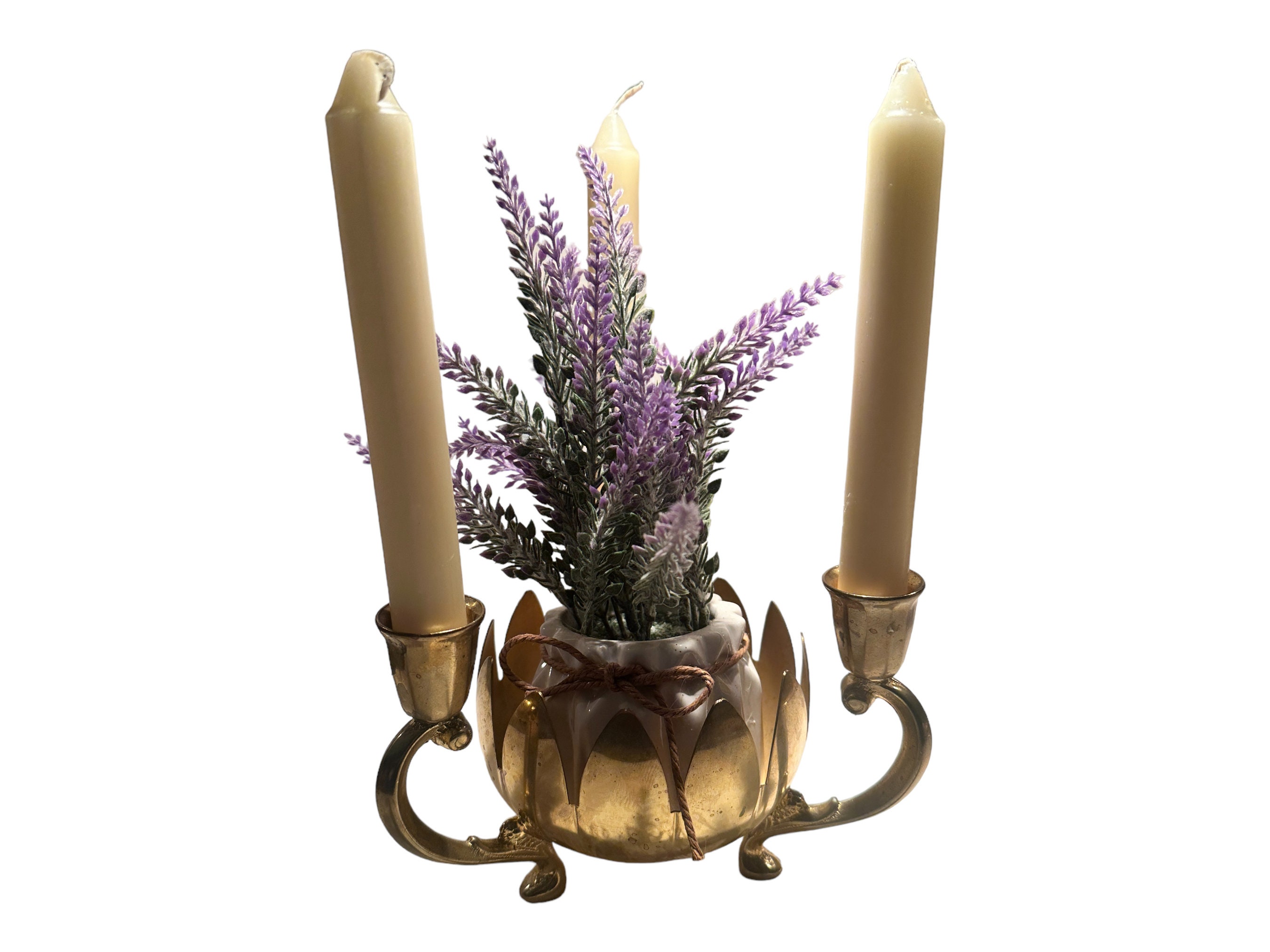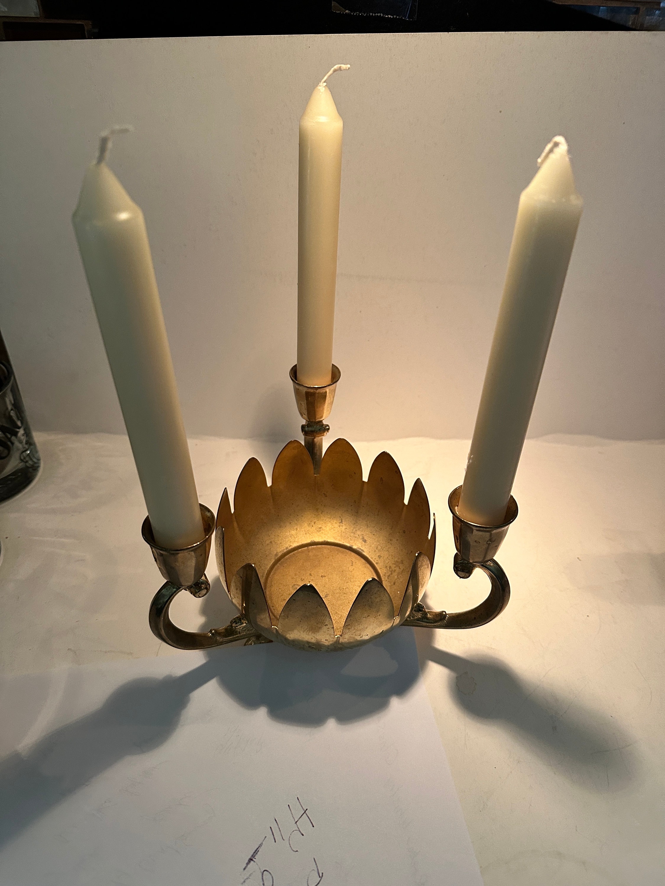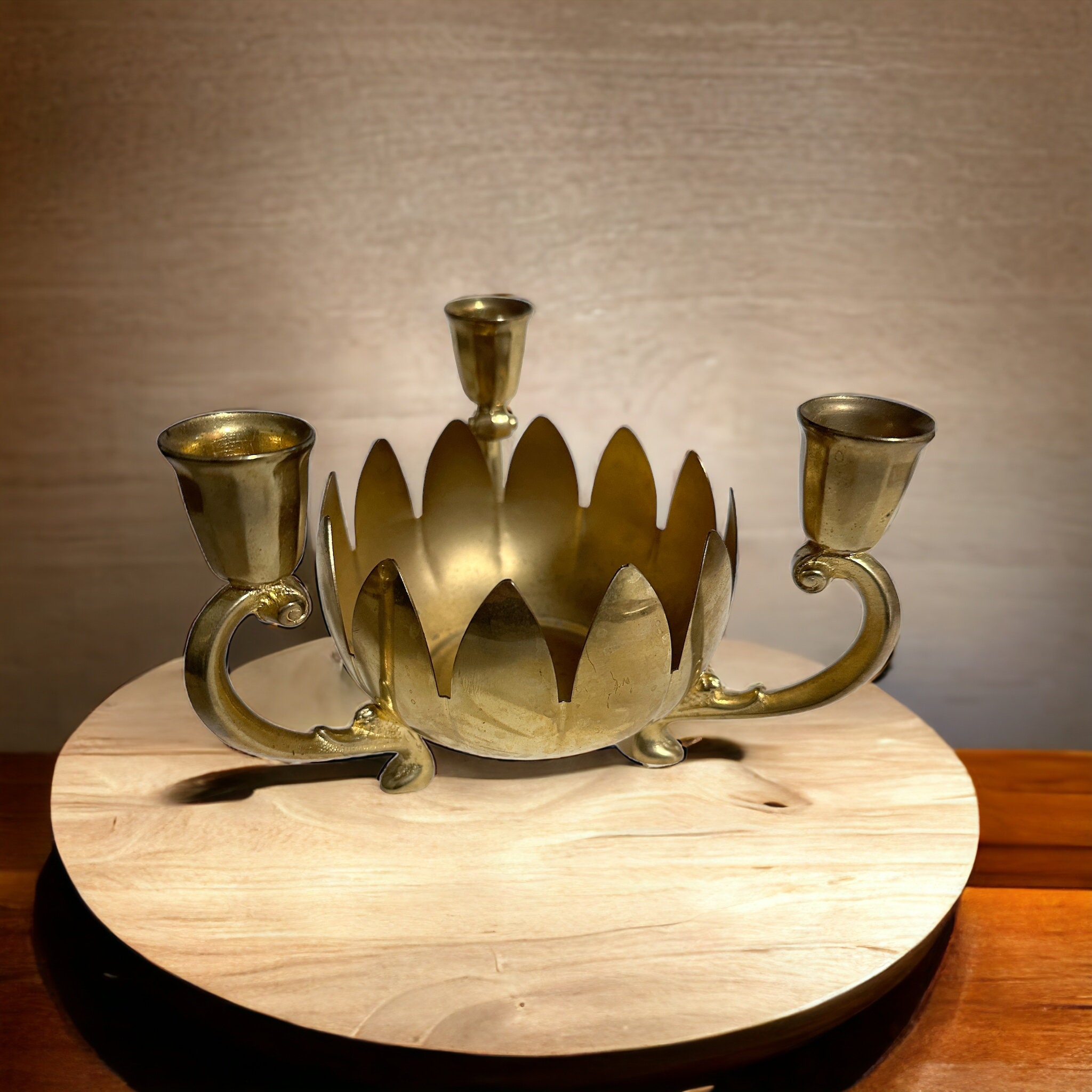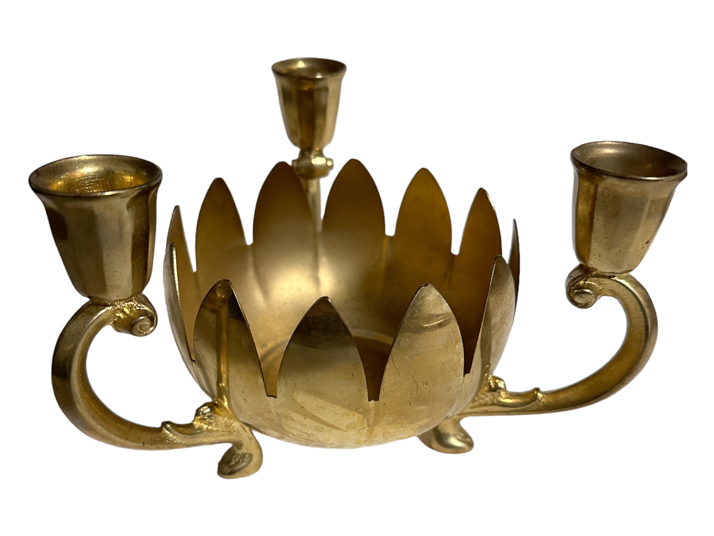 This is a vintage brass F. B. Rogers centerpiece lotus bowl with a triple candlestick holder. This candle holder is 5 inches tall by 5 inches wide. This is exquisite table decor would make a great gift!