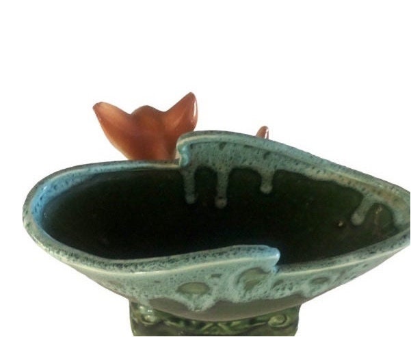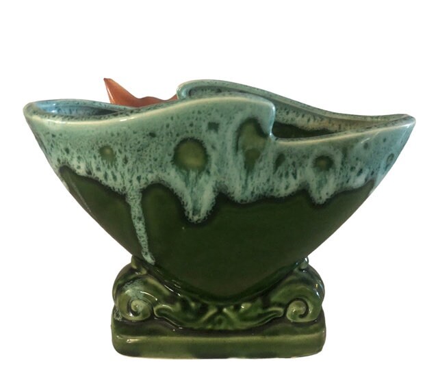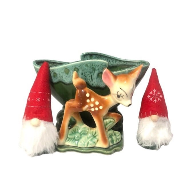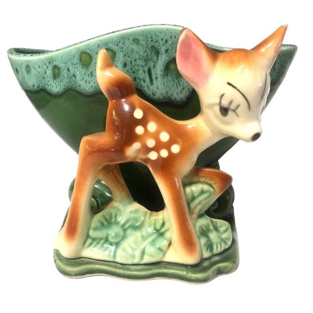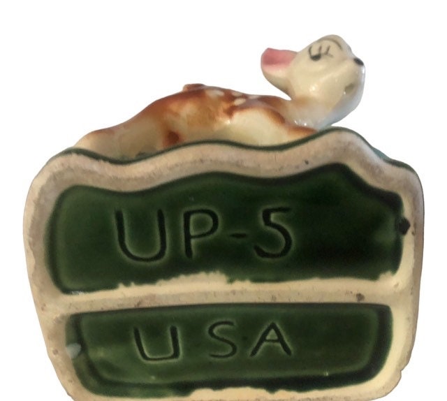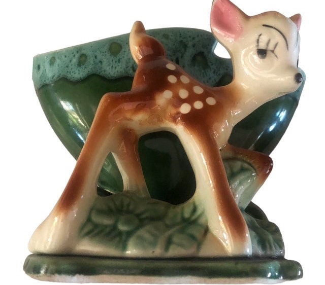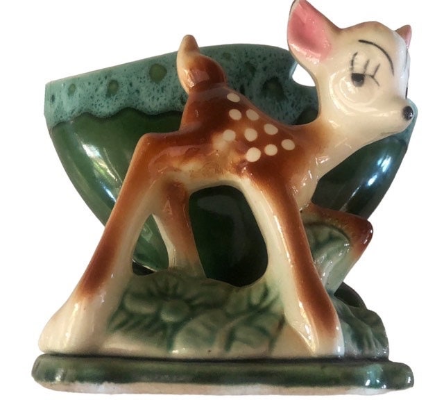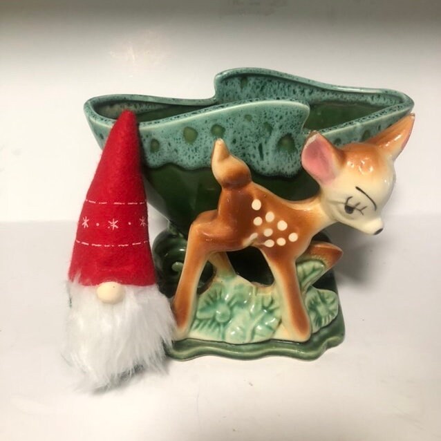 Handcrafted Mid Century Vintage Woodland Deer Indoor Ceramic Planter - This stunning handcrafted planter pot draws inspiration from mid-century design, featuring a whimsical deer motif. Made with care in the USA. This is a vintage, mid century oval planter with a 3D fawn. This is great cottage core room decoration and it is marked on the bottom with the model number of UP-5. This baby deer planter was crafted in the USA. Great wood bookshelf decor for her.