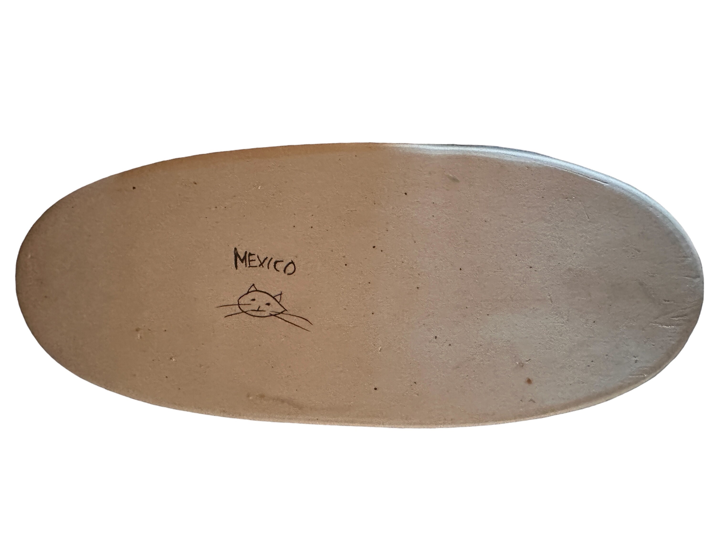 Measuring 12 inches by 5 inches, this charming folk art dish depicts a serene blue bird sitting on a tree branch, surrounded by intricate patterns and natural motifs. Each piece is uniquely crafted, capturing the essence of traditional Mexican pottery with its detailed craftsmanship and vibrant colors. Whether used as a decorative accent or a practical dish for jewelry, keys, or small treasures, it brings a Southwestern style and rustic elegance to your space.