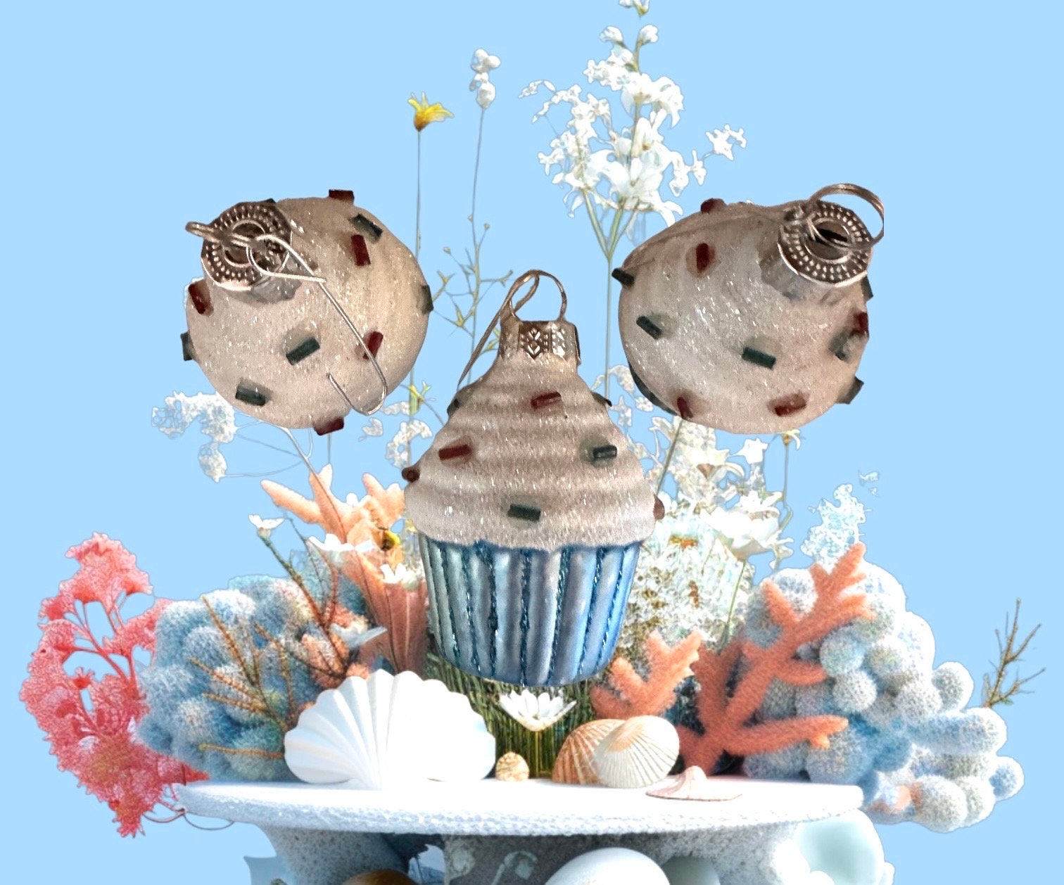 Christmas Cupcake Ornaments: Blue White Glass with Candy Decorative Sprinkles, Set of 3