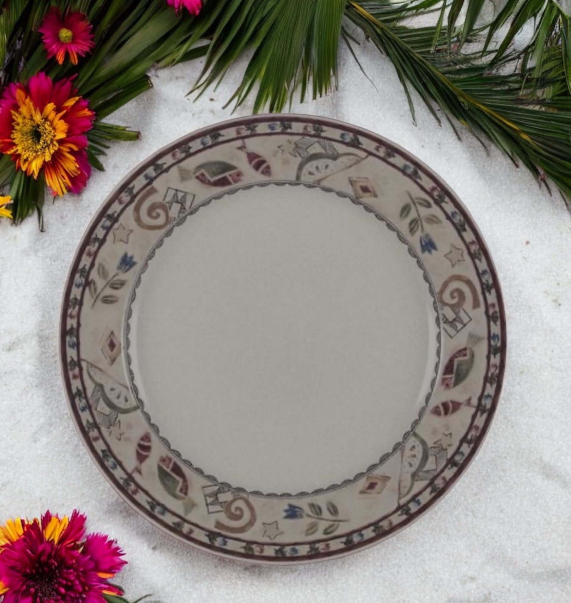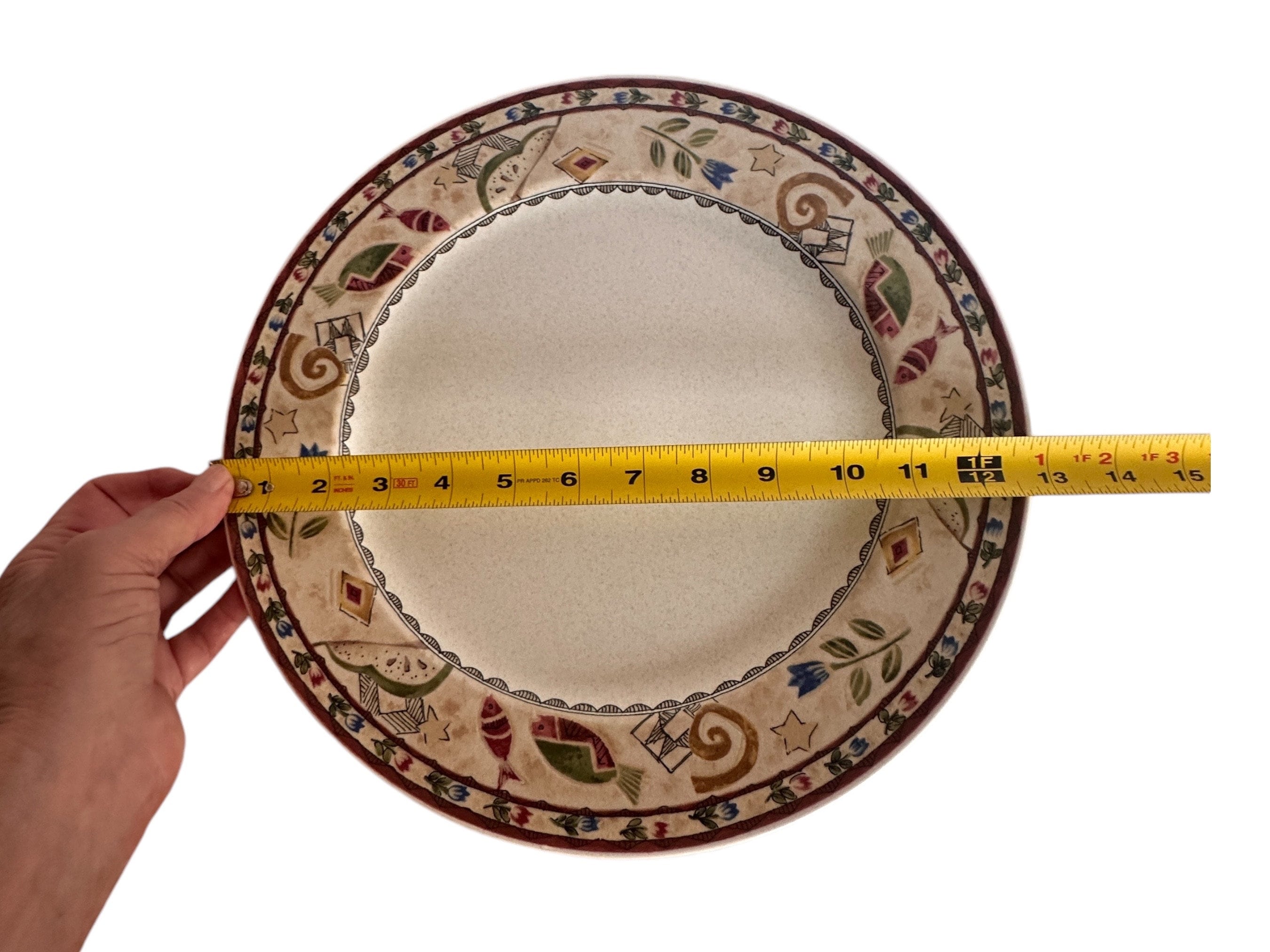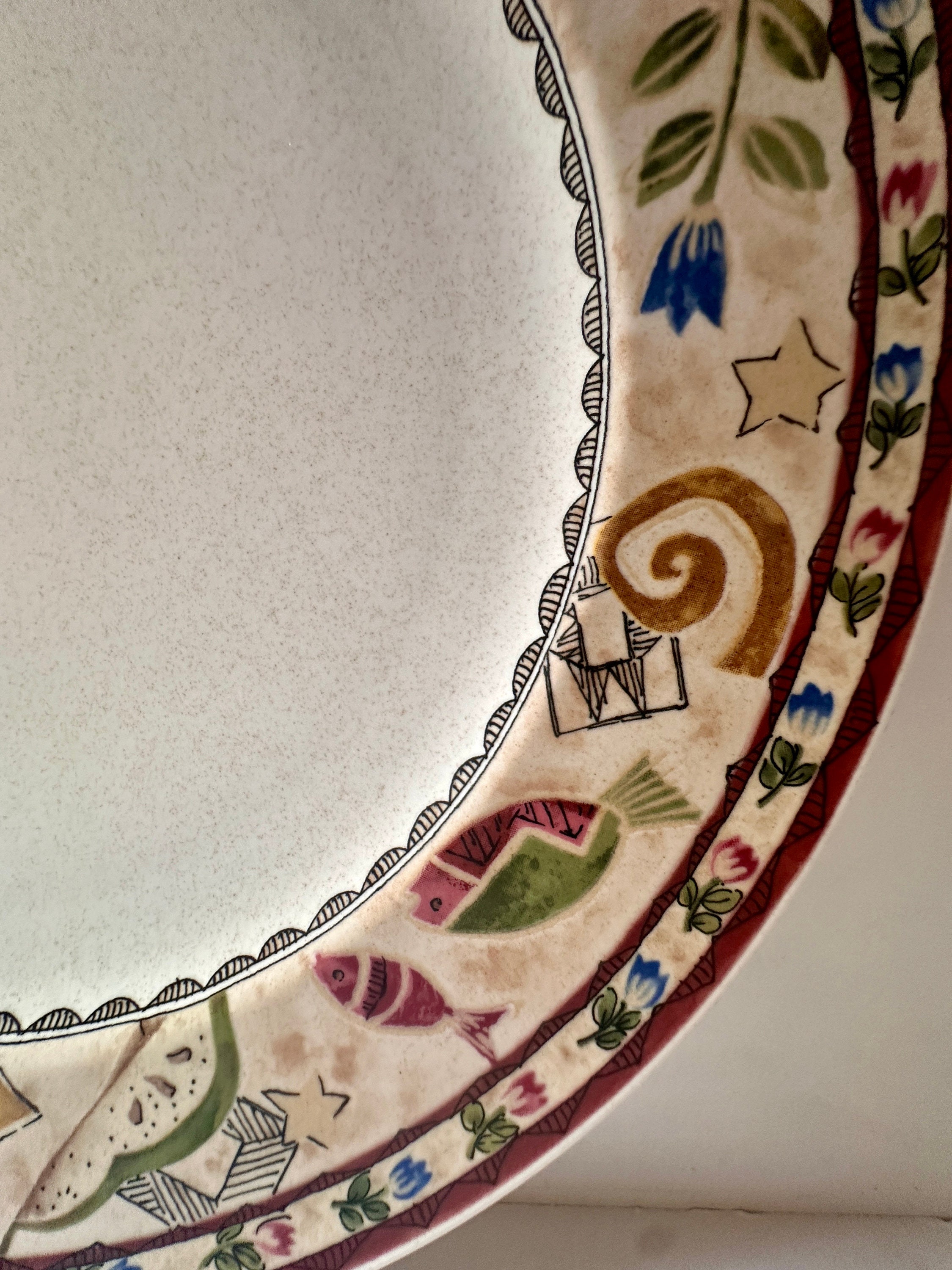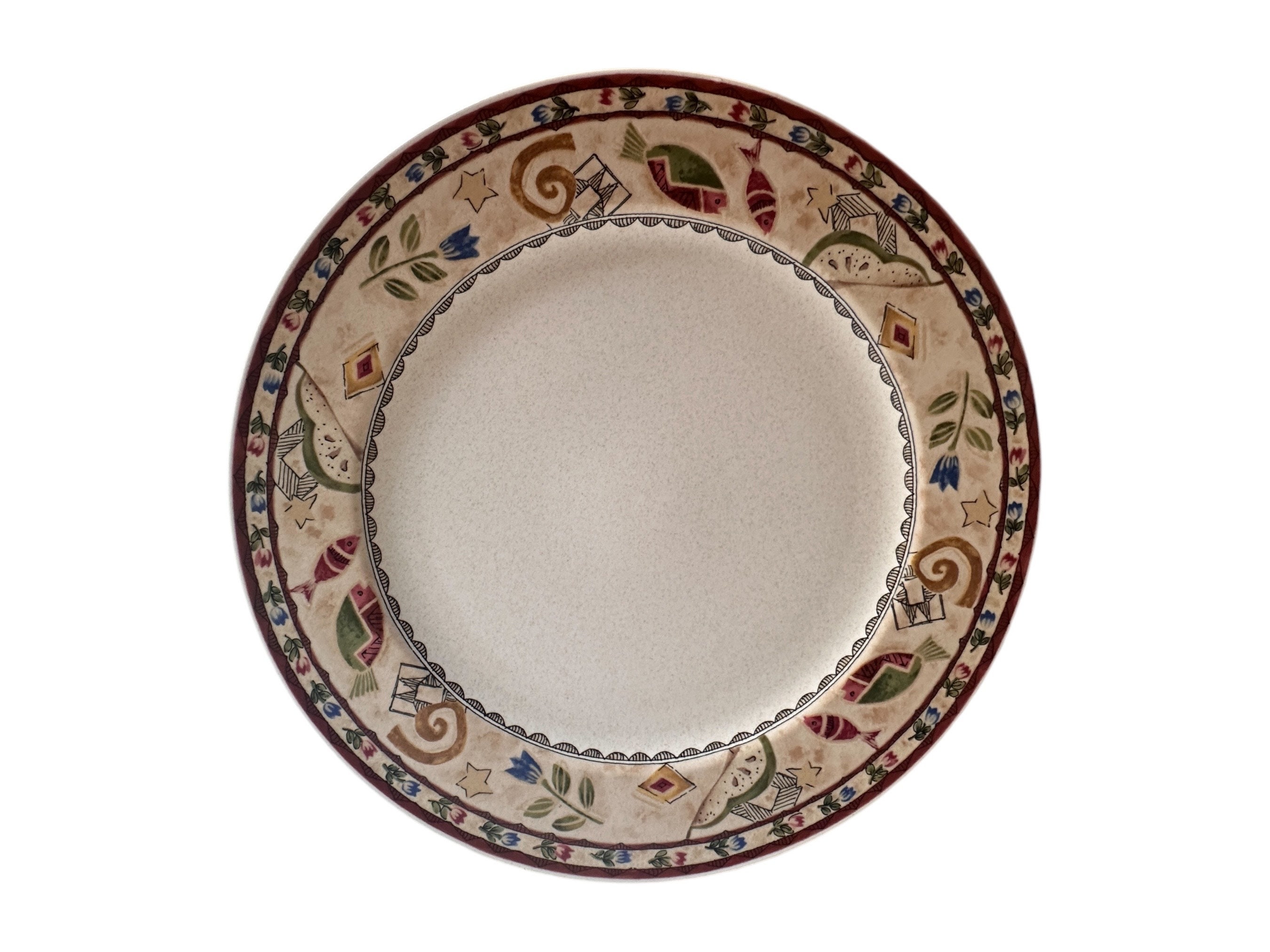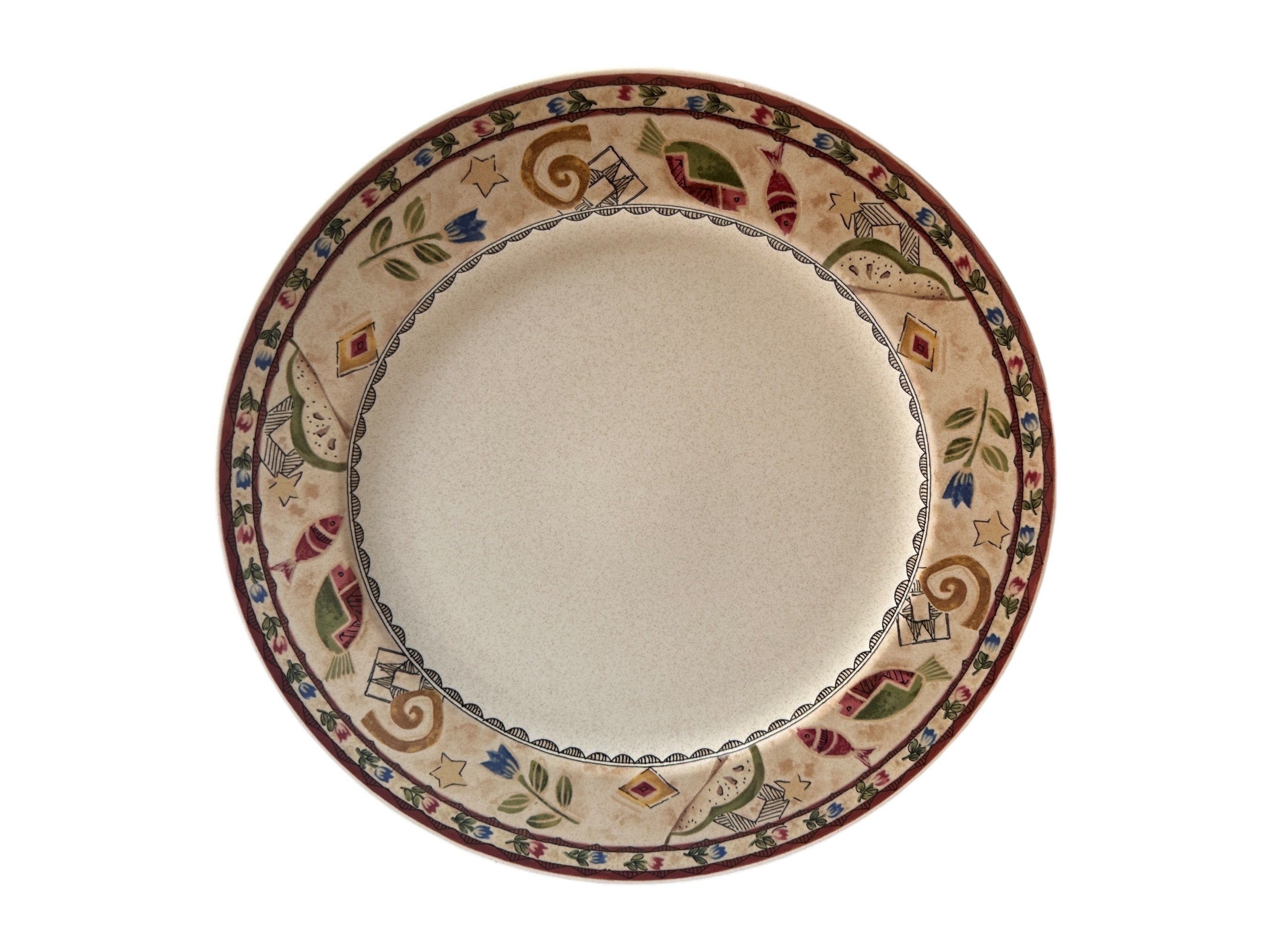 Elevate your hosting game with this vintage Mikasa Mystic Melody Platter, a stunning ceramic serving dish that combines elegance with a touch of whimsical charm. Measuring 12 3/4 inches in diameter, this exquisite piece is perfect for entertaining guests or as a captivating decor accent in your kitchen or dining room. Crafted from high-quality ceramic, it features a vibrant pattern of fish, stars, and flowers that evoke a sense of serenity and artistic flair.