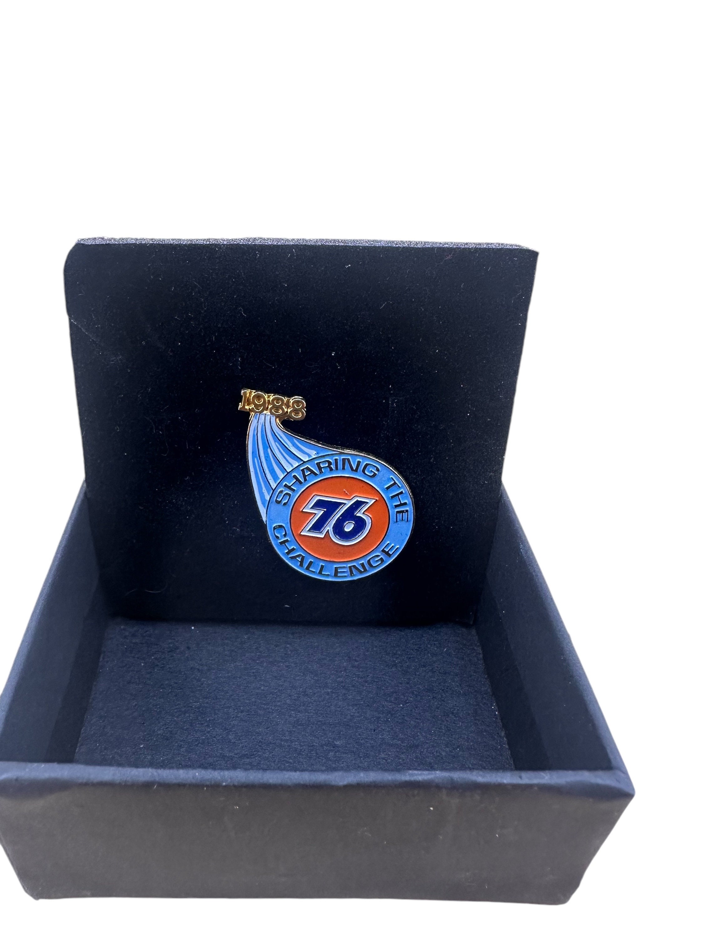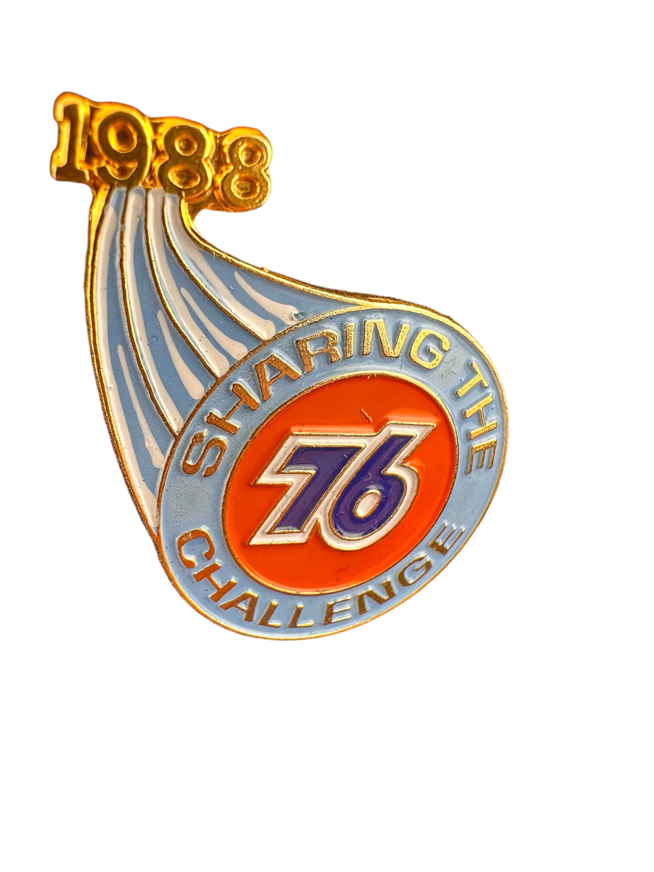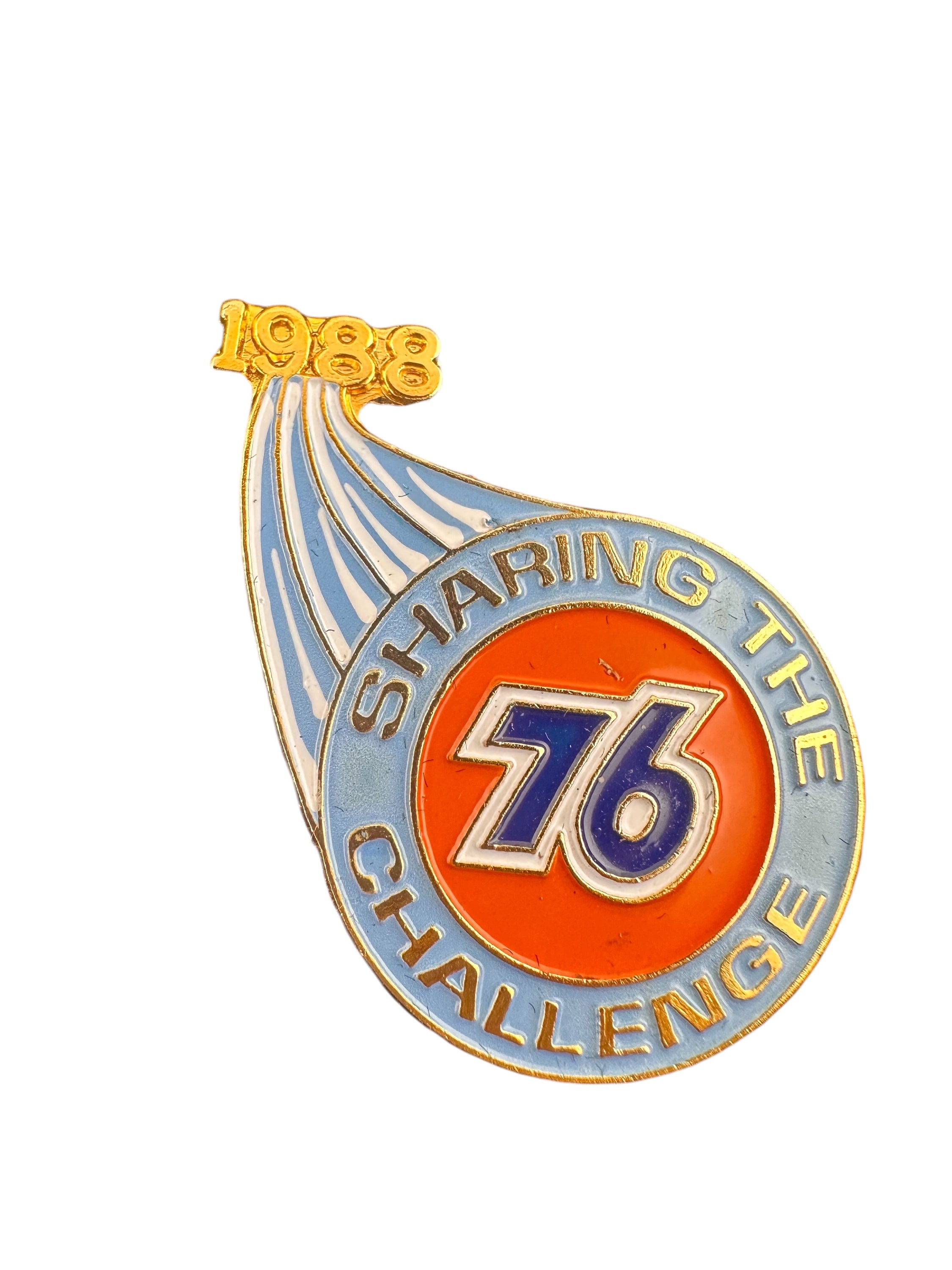 Rare Petroliana Union 76 Oil Company enameled pin from 1988. Sharing the Challenge, 1988. Blue and Orange colorful hat or lapel pin.
