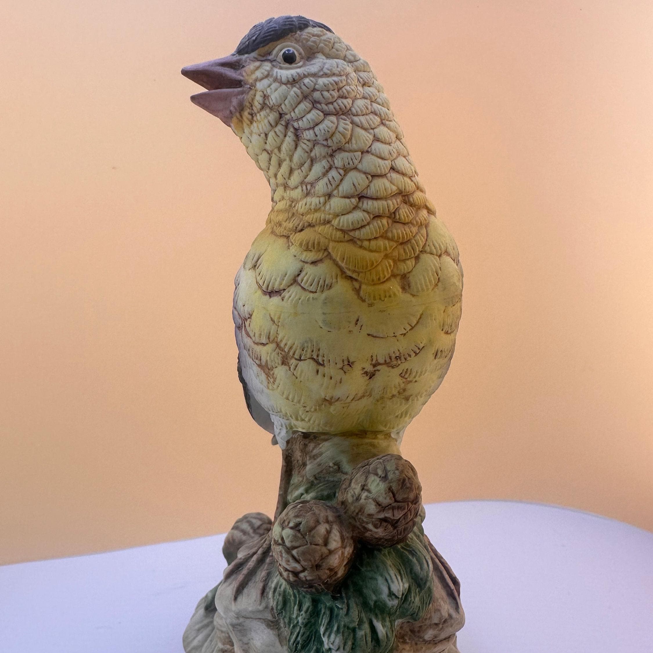 Discover the charm of this exquisite Lefton China American Goldfinch Bird figurine, a stunning yellow goldfinch perched among pine cones and a rock. Standing at 7 inches tall, this beautifully crafted bisque porcelain piece captures the delicate details and vibrant colors of a real goldfinch, making it a perfect addition to your bird collection or as a thoughtful gift for bird lovers.