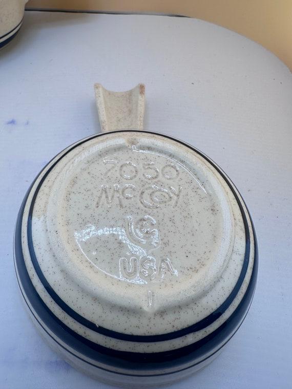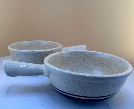 This is a set of two vintage McCoy USA 7050 country kitchen chili or onion soup bowls. They are beige and brown with handles. Very good condition.