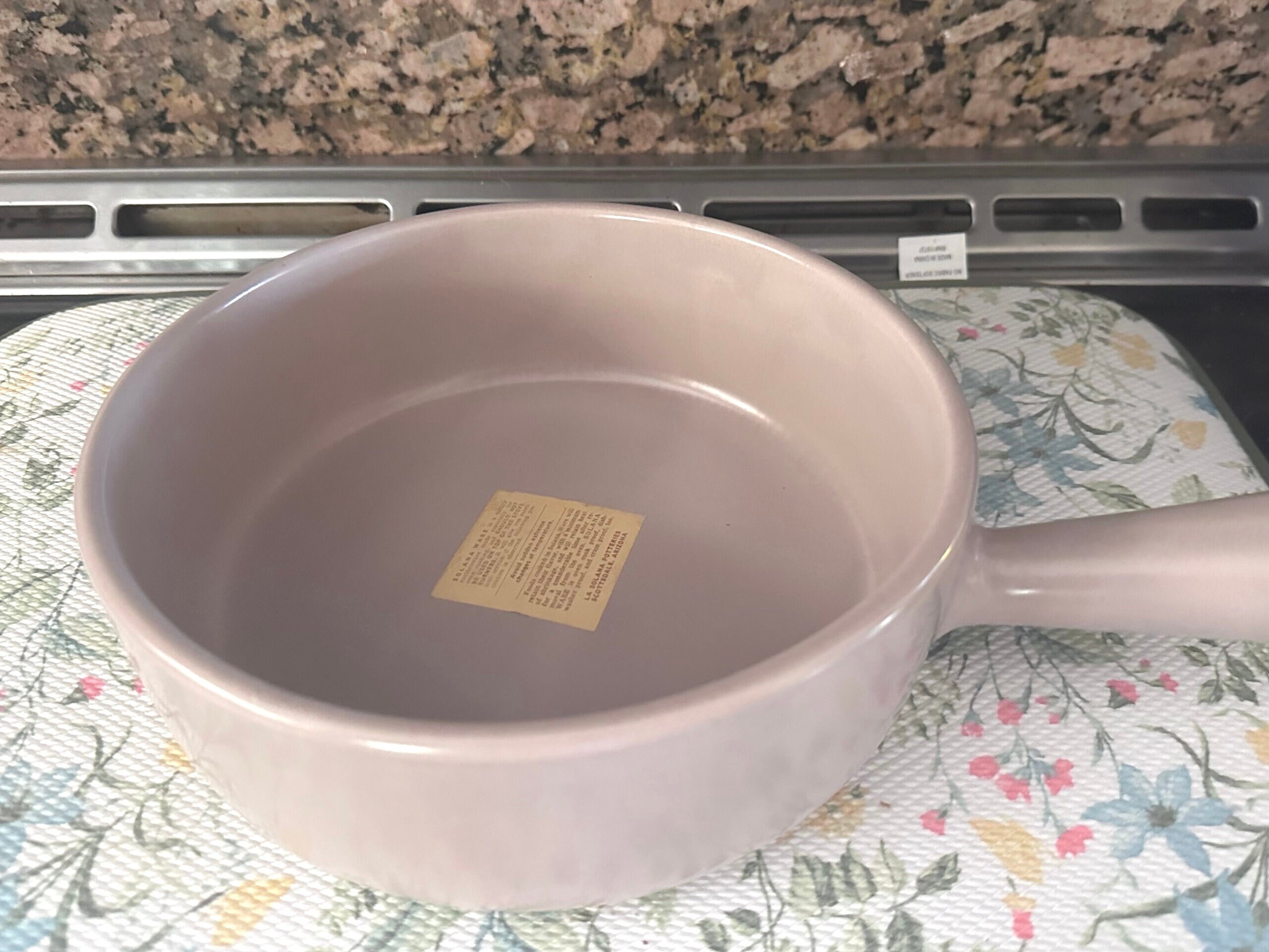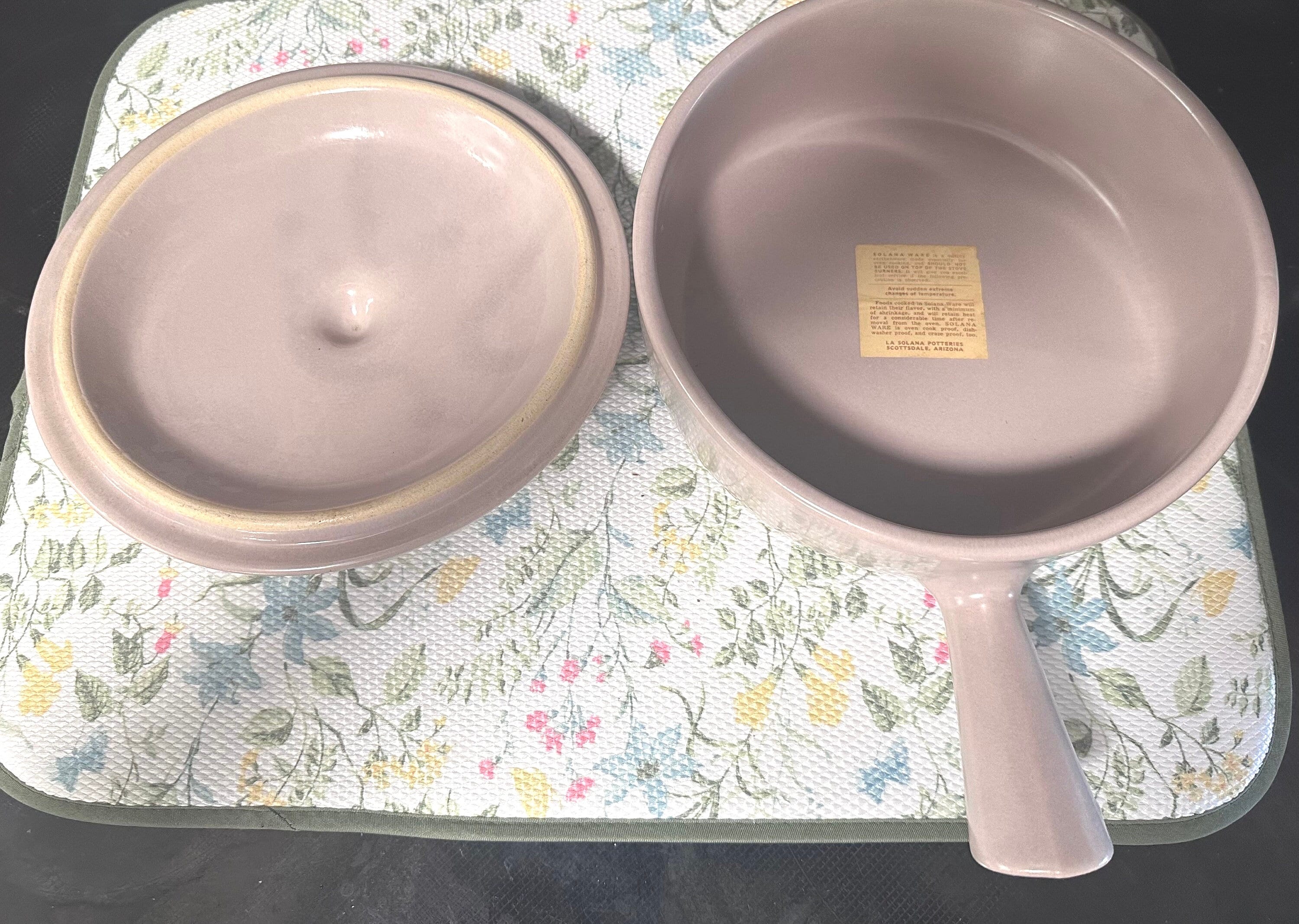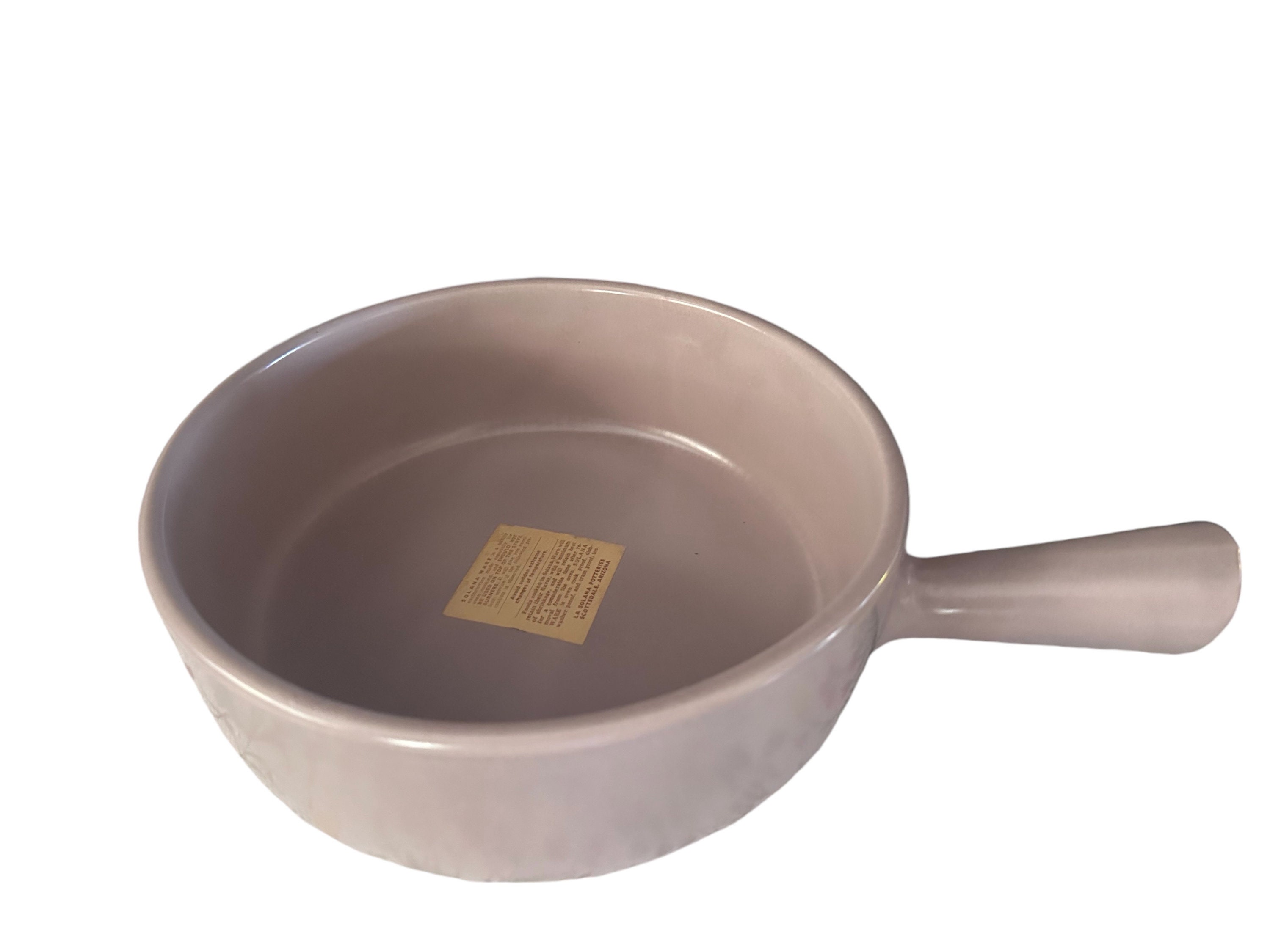 This is a covered earthenware baker dish by La Solana Pottery of Scottsdale, Arizona. The color is a pink beige. It has a handle. It measures 8.5" in diameter. It is 2.5" deep. The casserole dish holds 1.5 quarts. It has the original stickers on it. There is a little bit of shelf ware on the bottom of the baking dish. This earthenware was made for oven cooking. It should not be used on top of the stove burners. Avoid sudden extreme temperature changes.