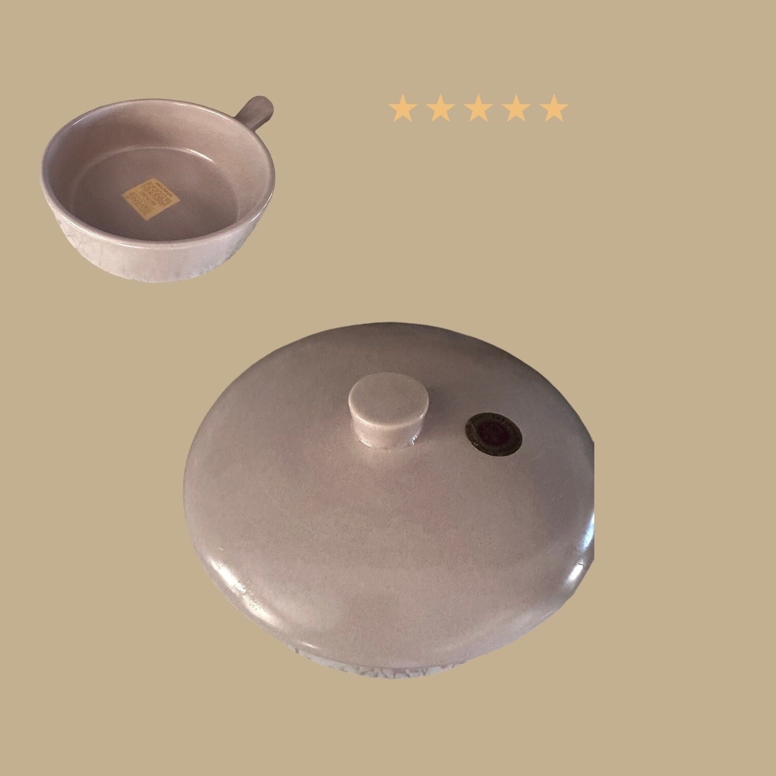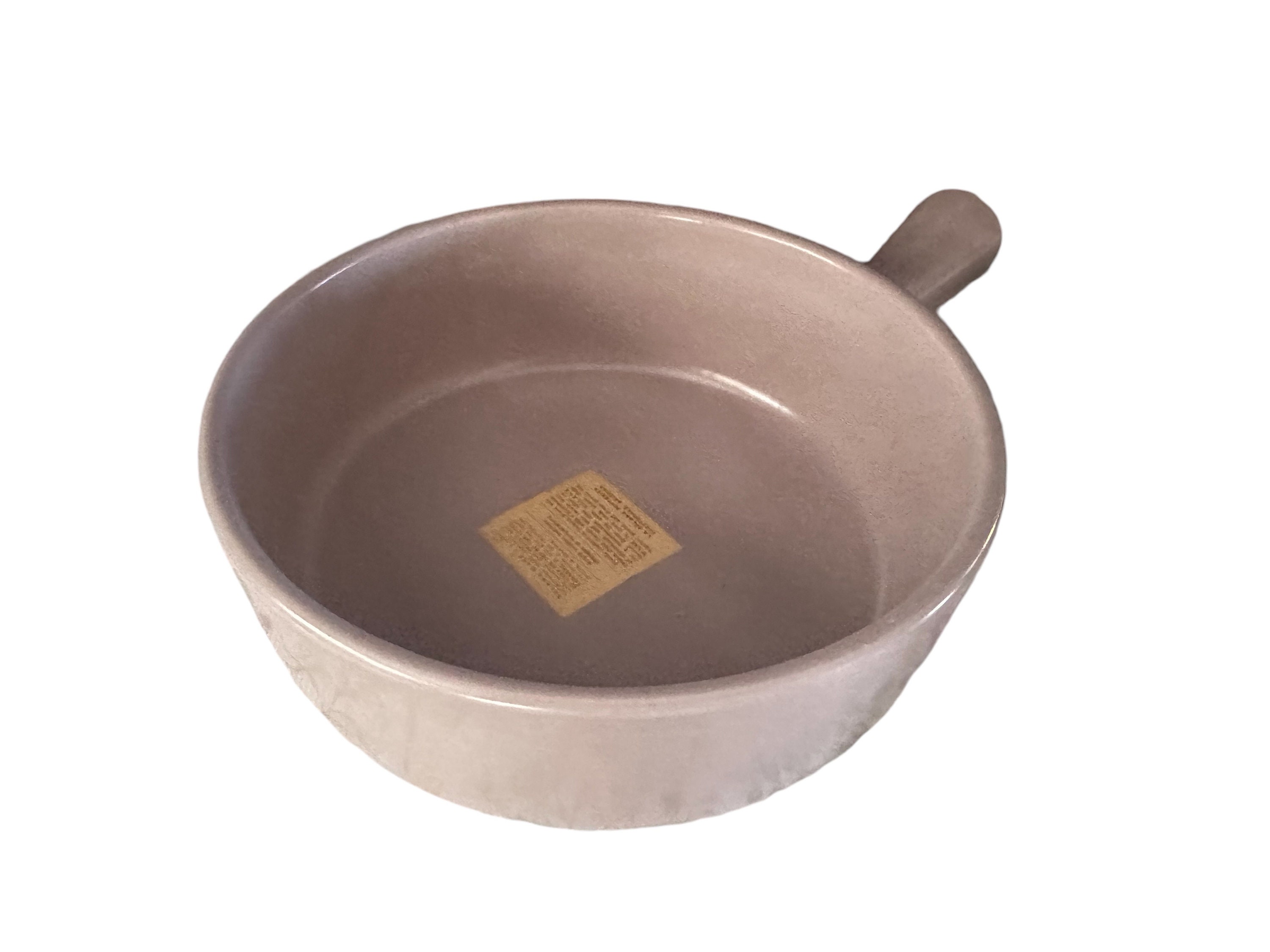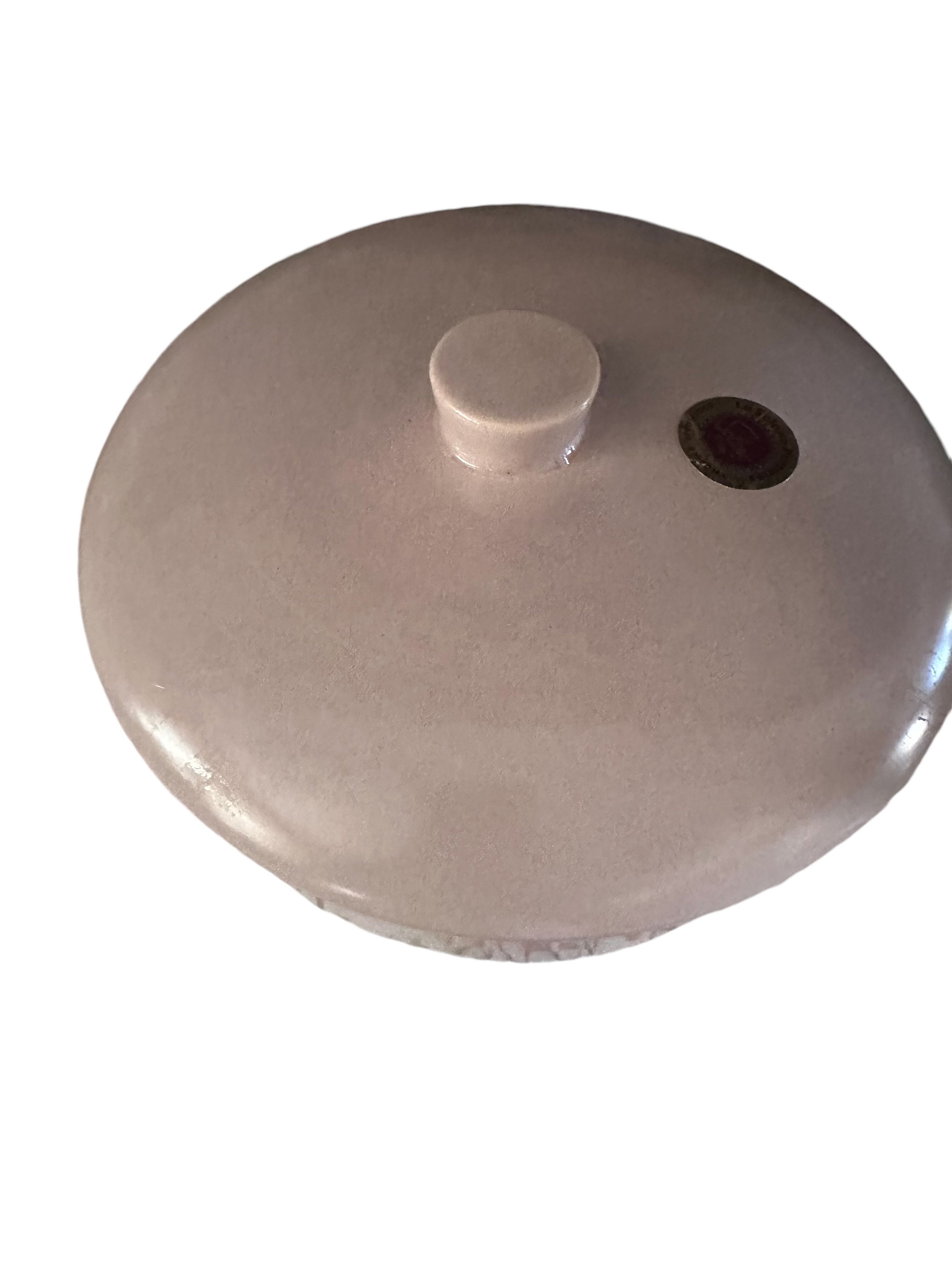 This is a covered earthenware baker dish by La Solana Pottery of Scottsdale, Arizona. The color is a pink beige. It has a handle. It measures 8.5" in diameter. It is 2.5" deep. The casserole dish holds 1.5 quarts. It has the original stickers on it. There is a little bit of shelf ware on the bottom of the baking dish. This earthenware was made for oven cooking. It should not be used on top of the stove burners. Avoid sudden extreme temperature changes.