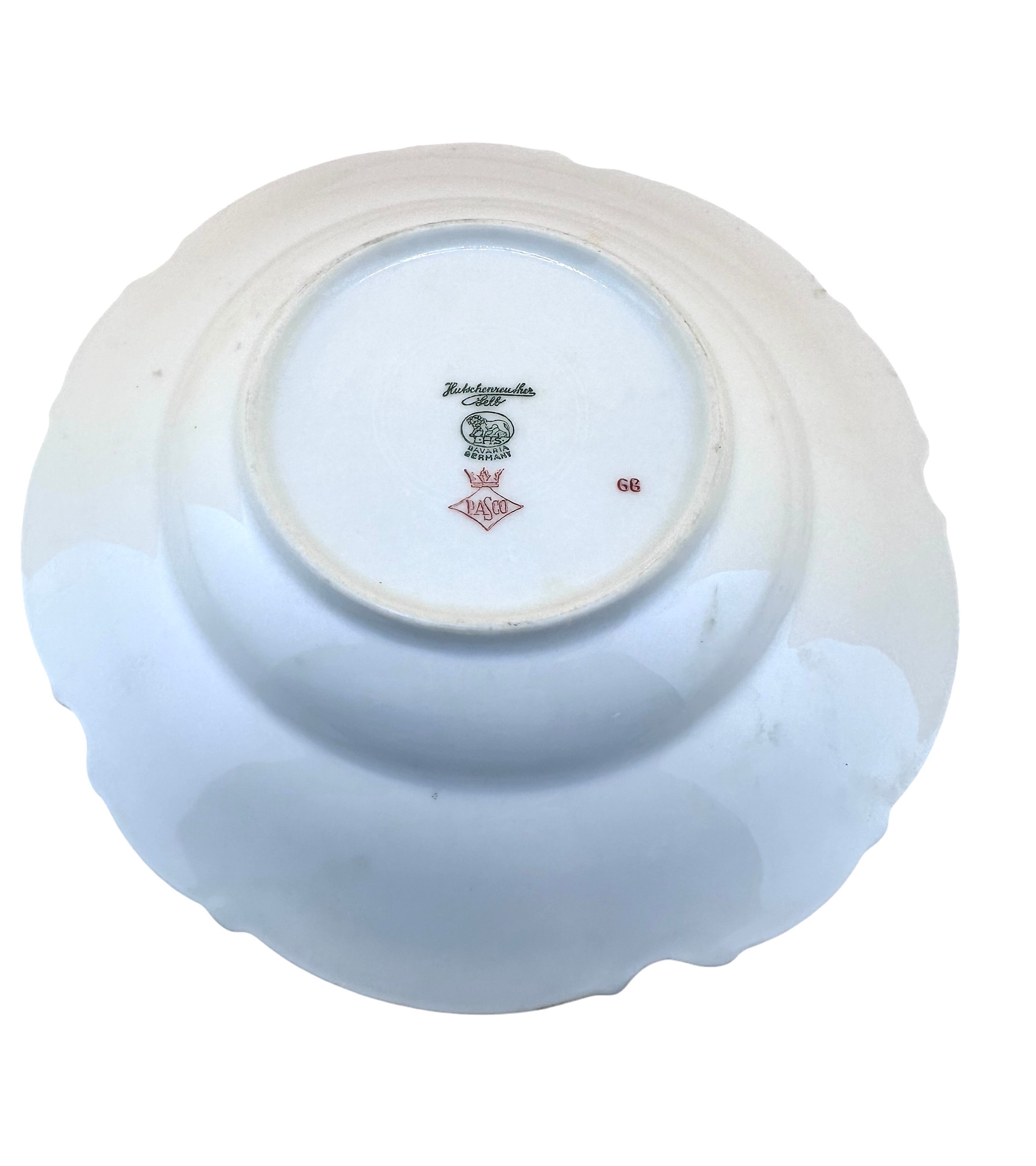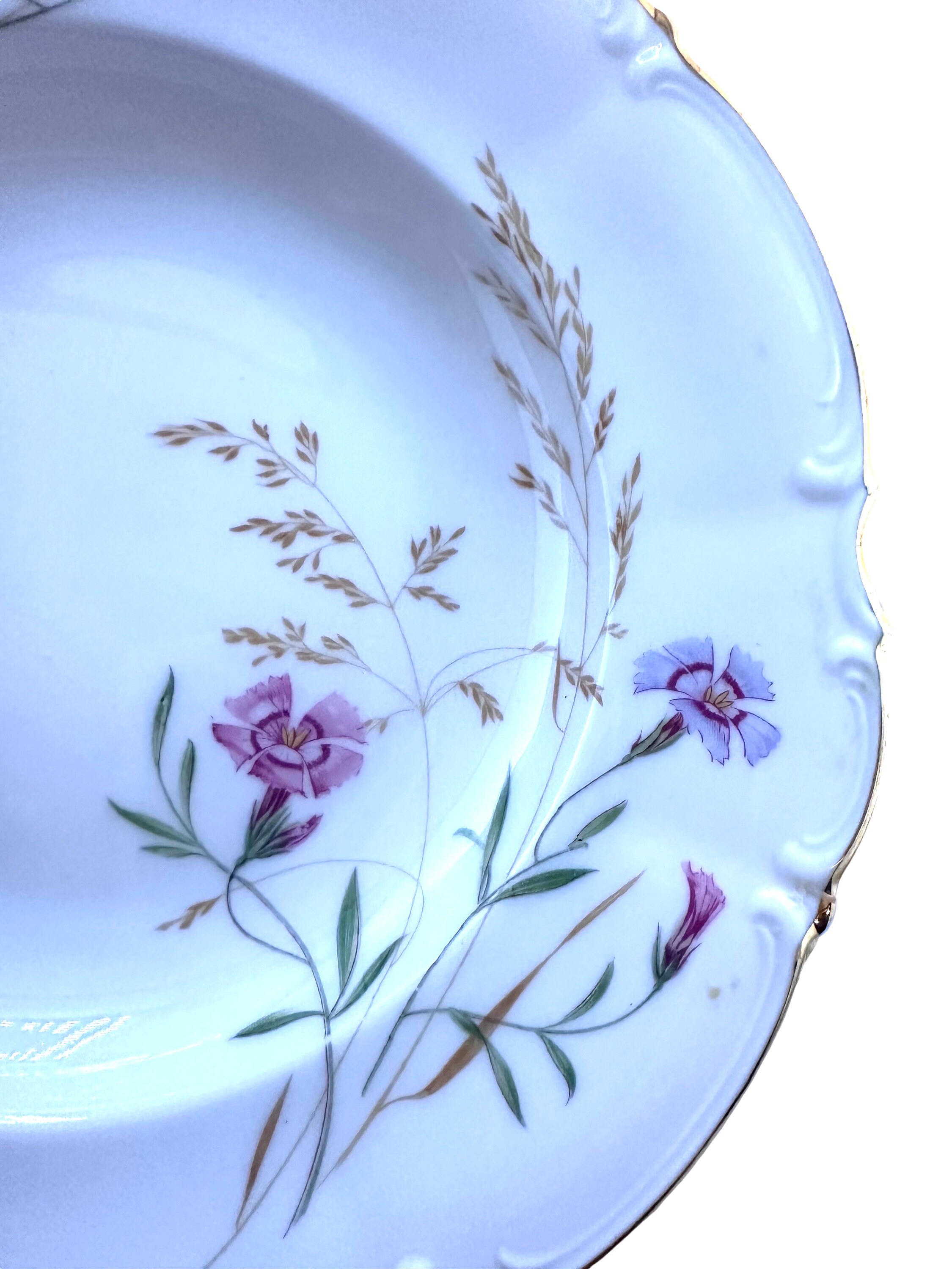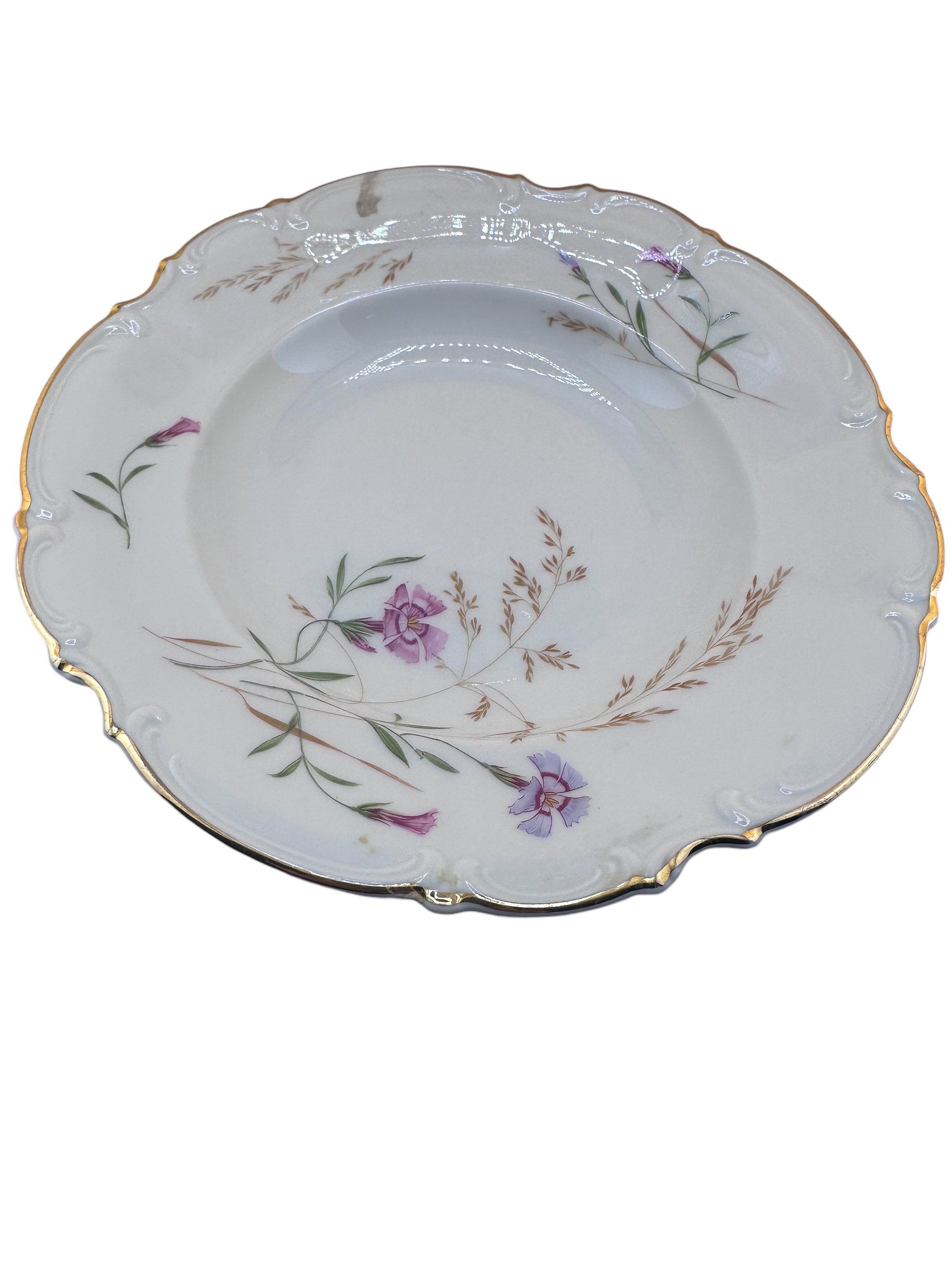 This is a set of three Hutschenreuther rim soup bowls in the Pasco Sylvia 8940 pattern. They are in very good condition with no chips, cracks or crazing. The soup bowl measures 8 3/8" in diameter. They are rimmed in gold paint.