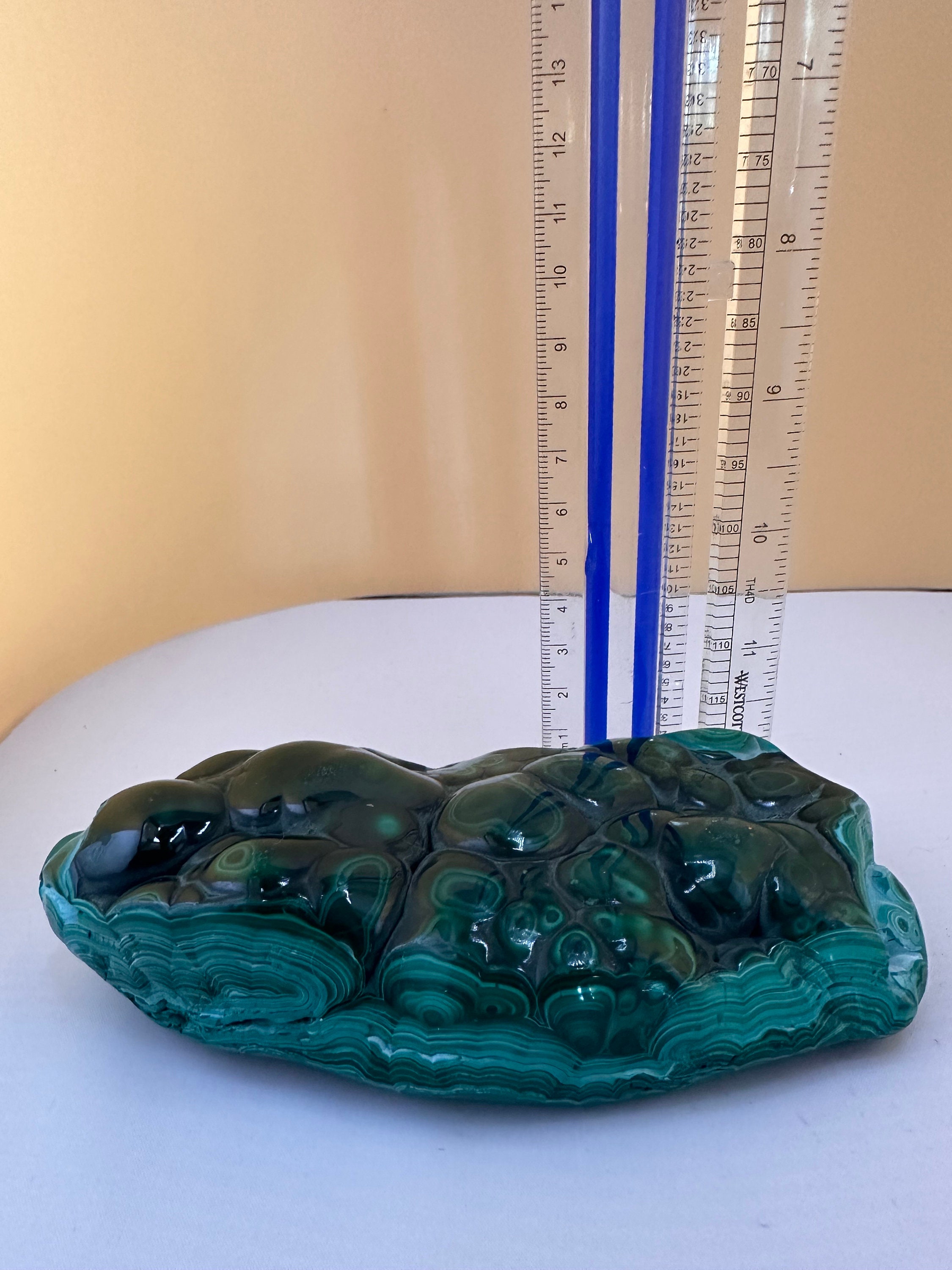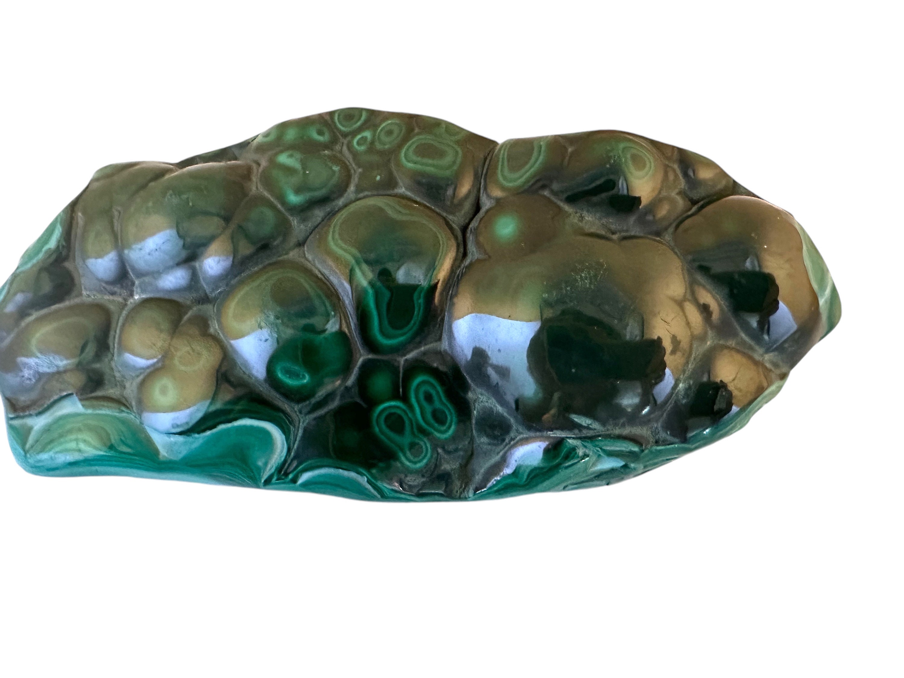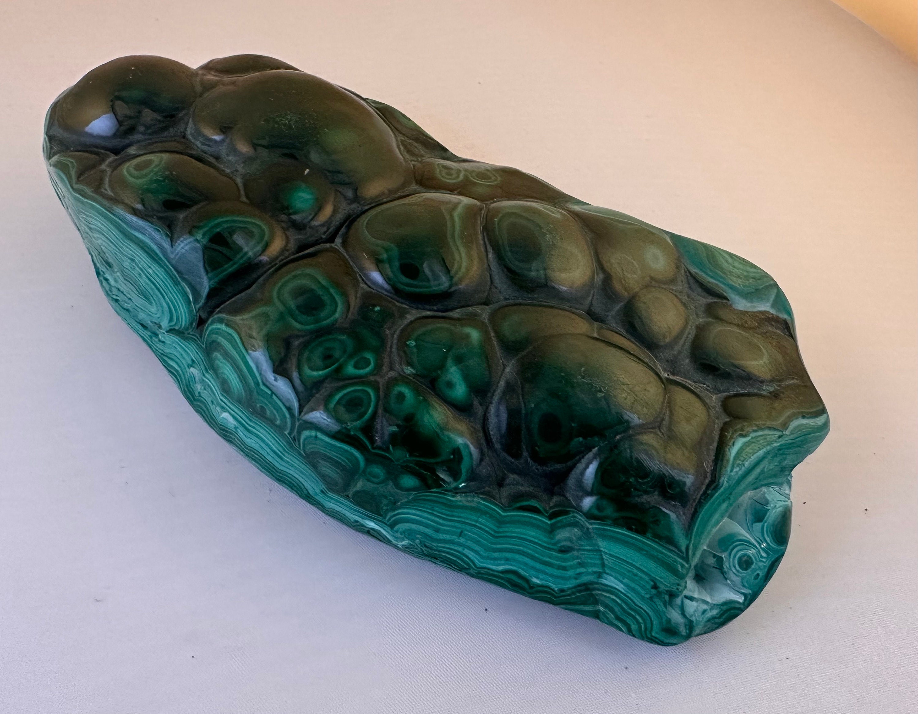 Crafted by nature over millennia, this Malachite specimen features smooth, polished surfaces and natural textural details that highlight its deep green colors and intricate botryoidal shapes. Its compact size fits perfectly on a desk or display shelf, offering a tactile and visual experience of genuine mineral artistry.