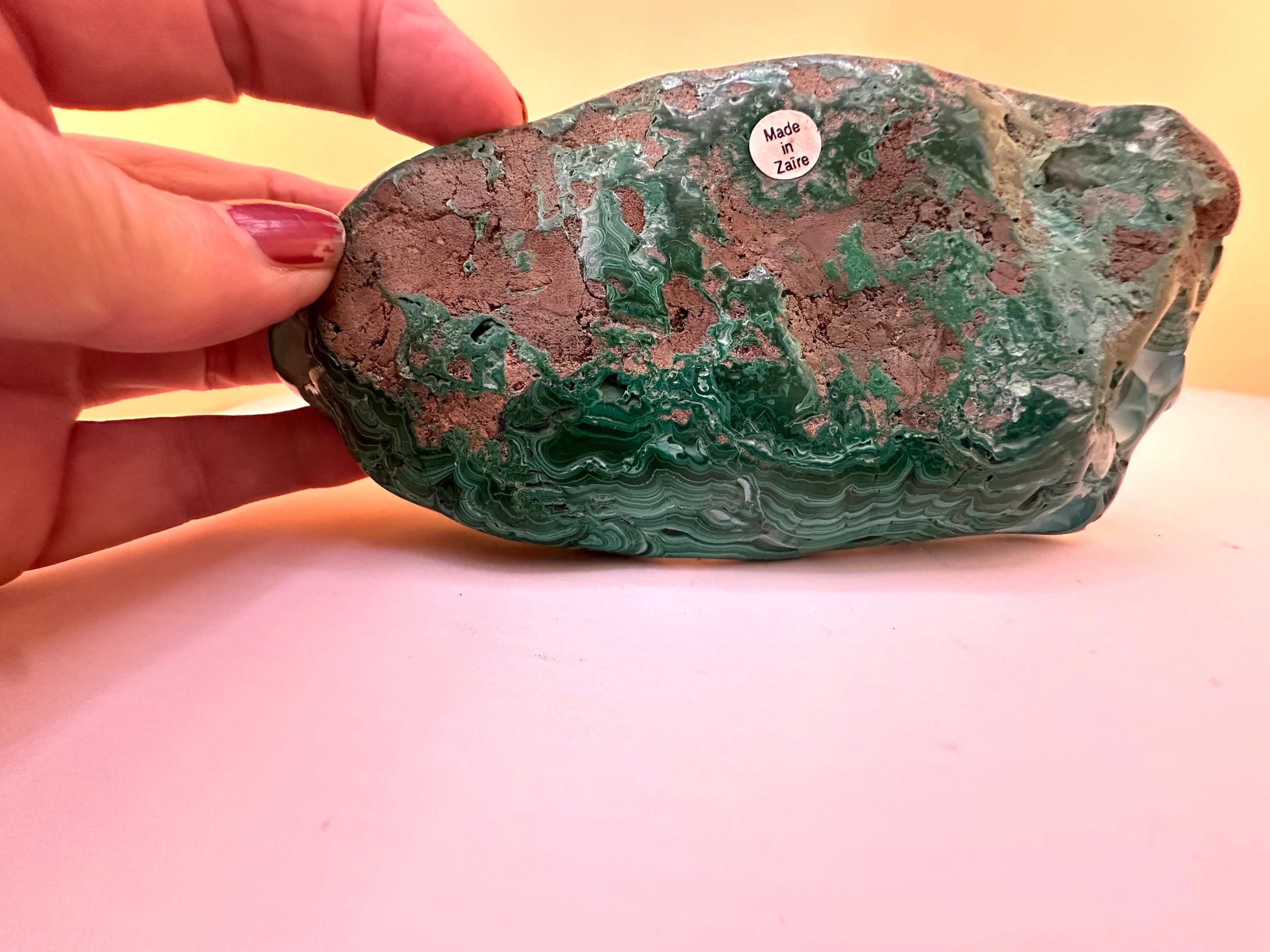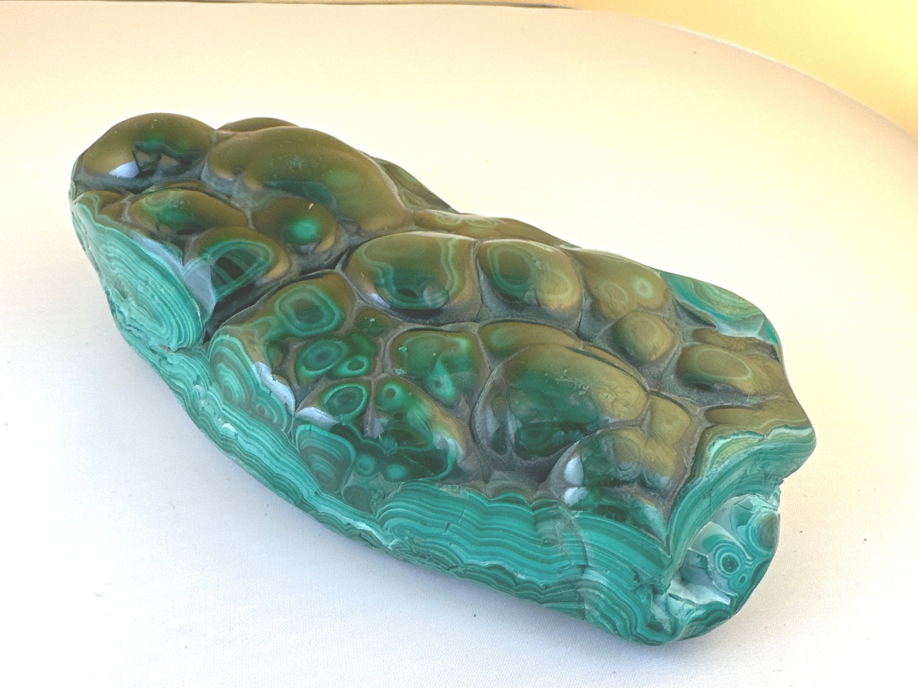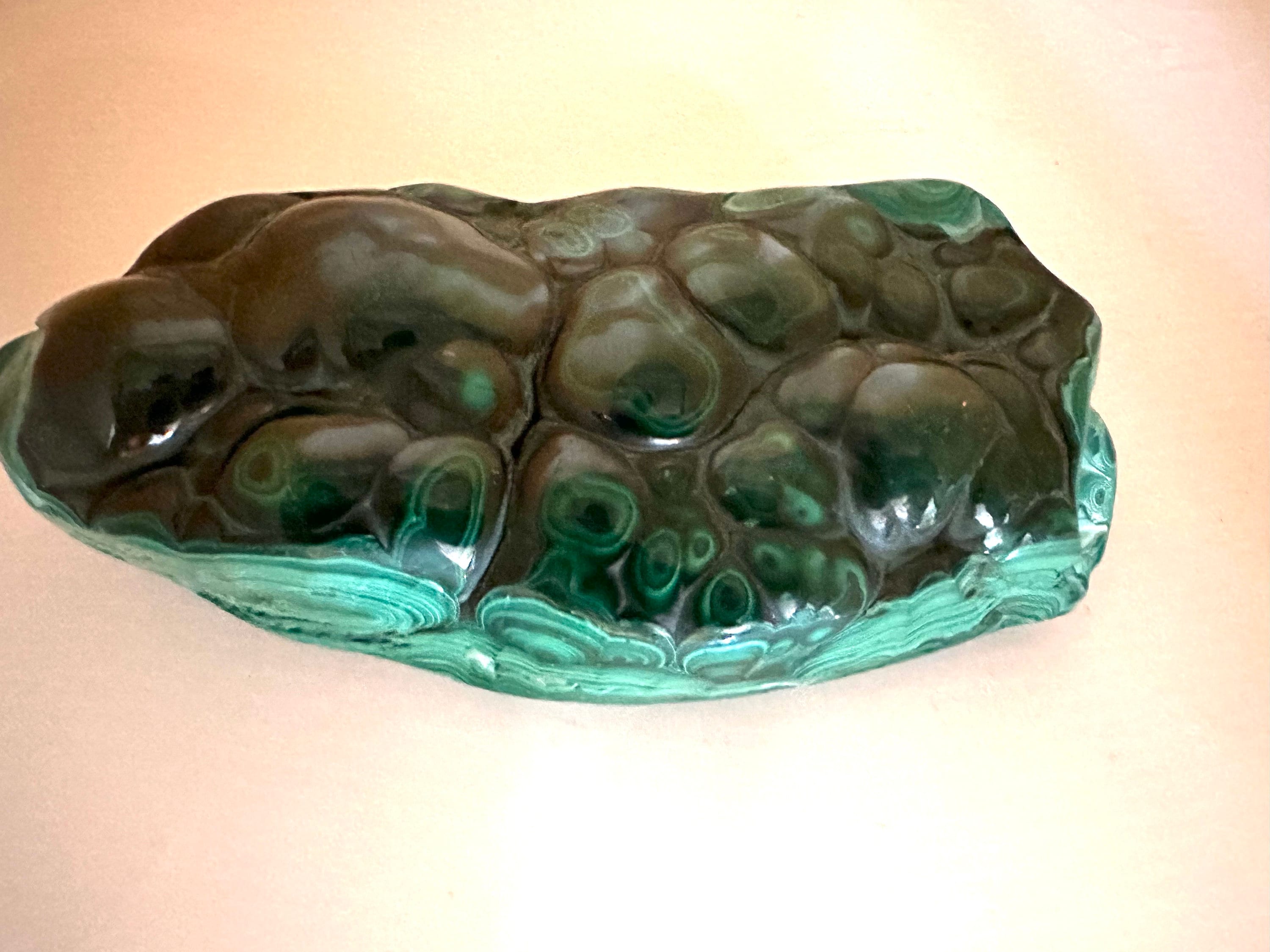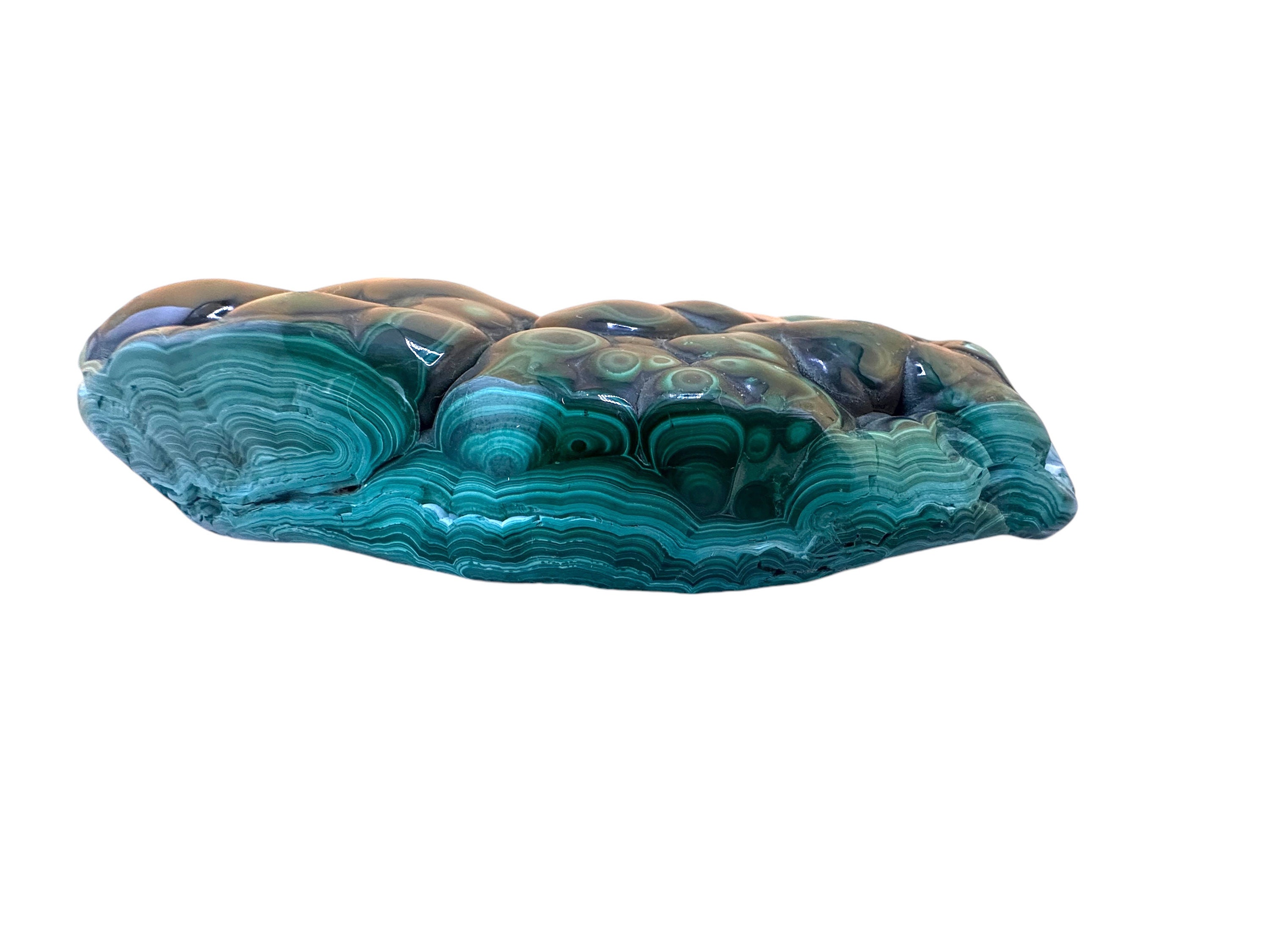 Crafted by nature over millennia, this Malachite specimen features smooth, polished surfaces and natural textural details that highlight its deep green colors and intricate botryoidal shapes. Its compact size fits perfectly on a desk or display shelf, offering a tactile and visual experience of genuine mineral artistry.
