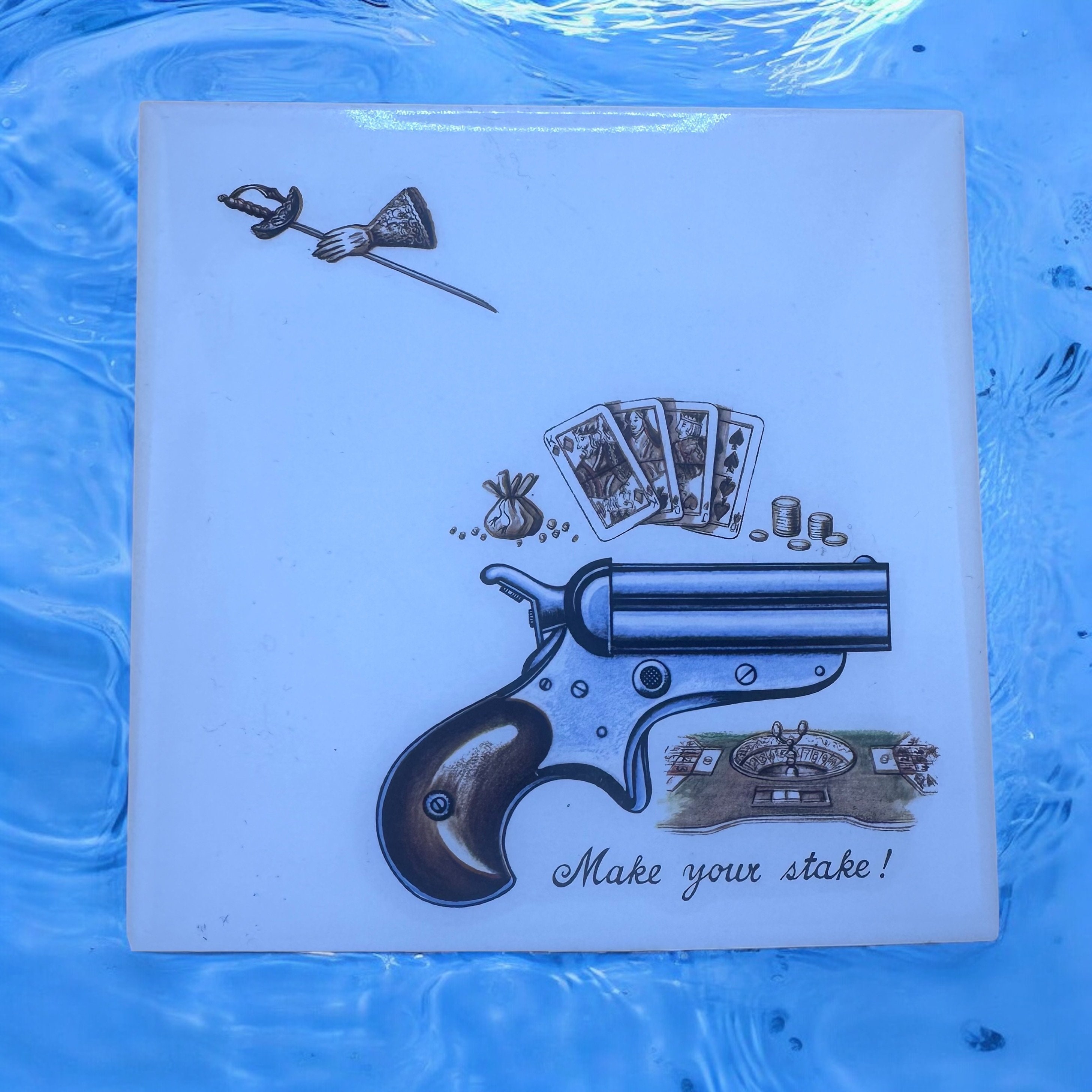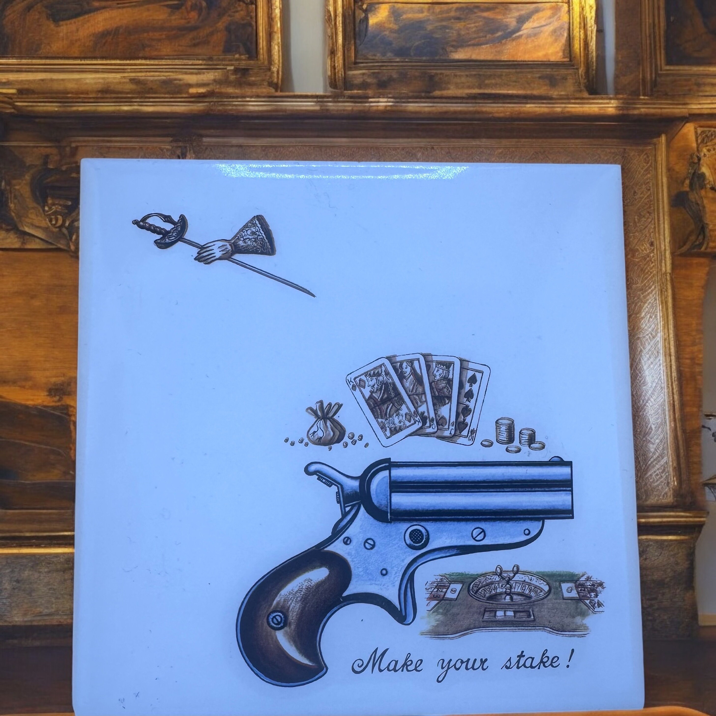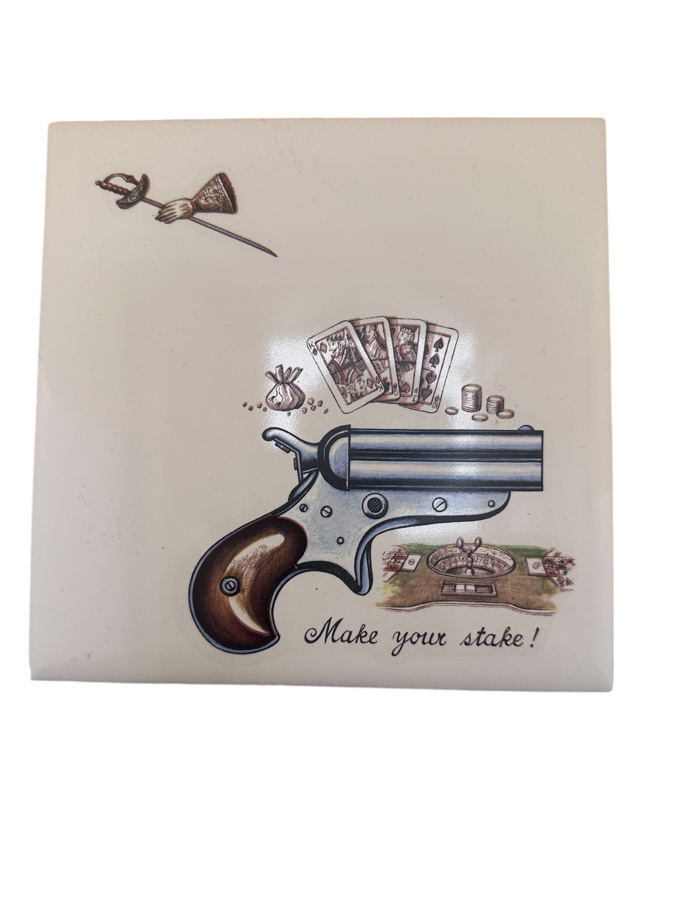 This is for one hand decorated 6" x 6" square ceramic wall tile. The art tile features a James Bond style poster of a Remington derringer along with a roulette wheel and a deck of cards. It says "Make Your Stake!", It is in excellent condition.